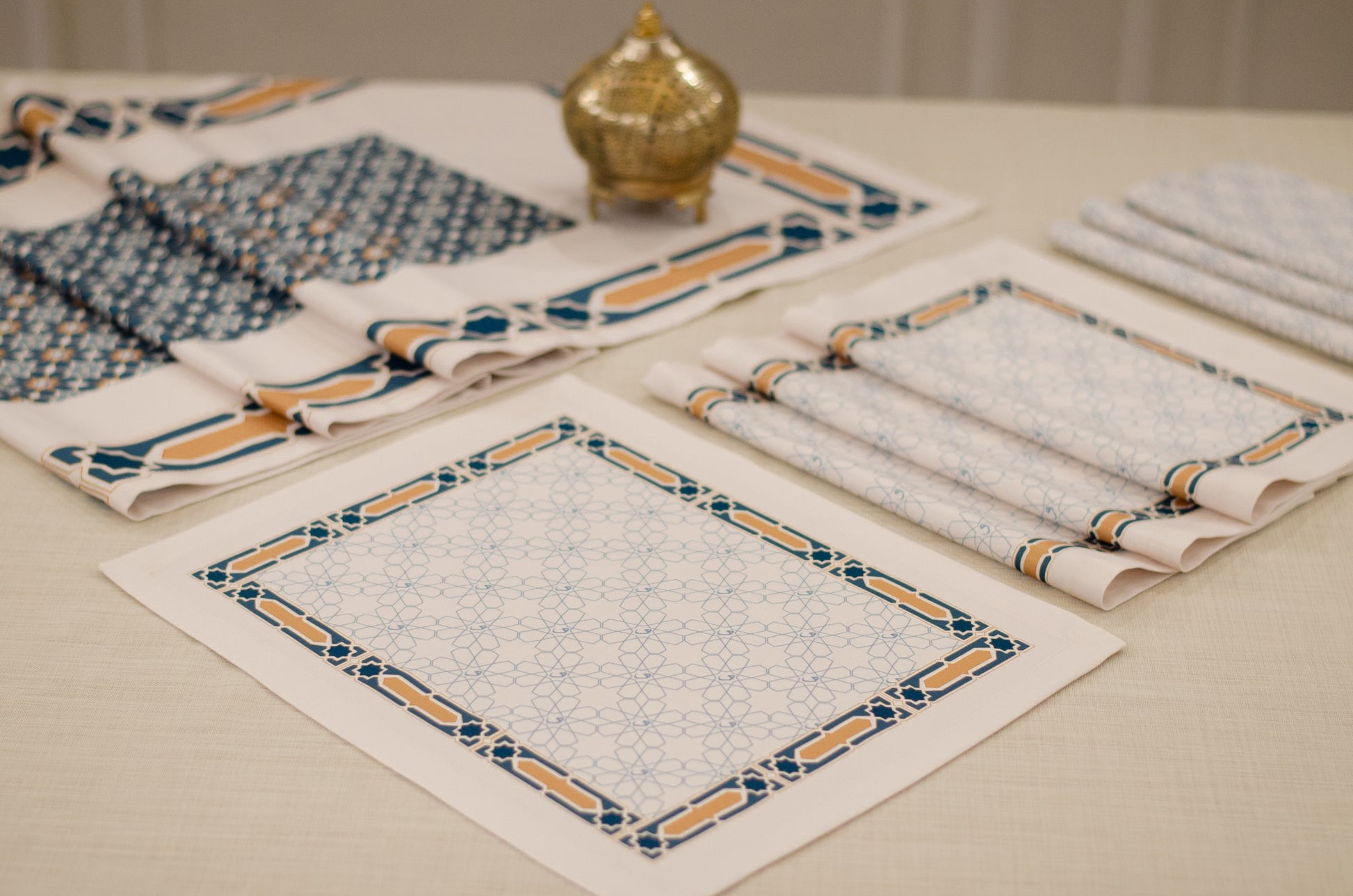 Enrich your Ramadan Iftar with the Andalus Placemat and Napkin Set from Élégance Des Tables, a perfect blend of tradition and elegance. Inspired by the beautiful Islamic tile patterns and architecture, this exquisite set features intricate geometric designs in serene blue tones, bringing peace and reverence to your table.
