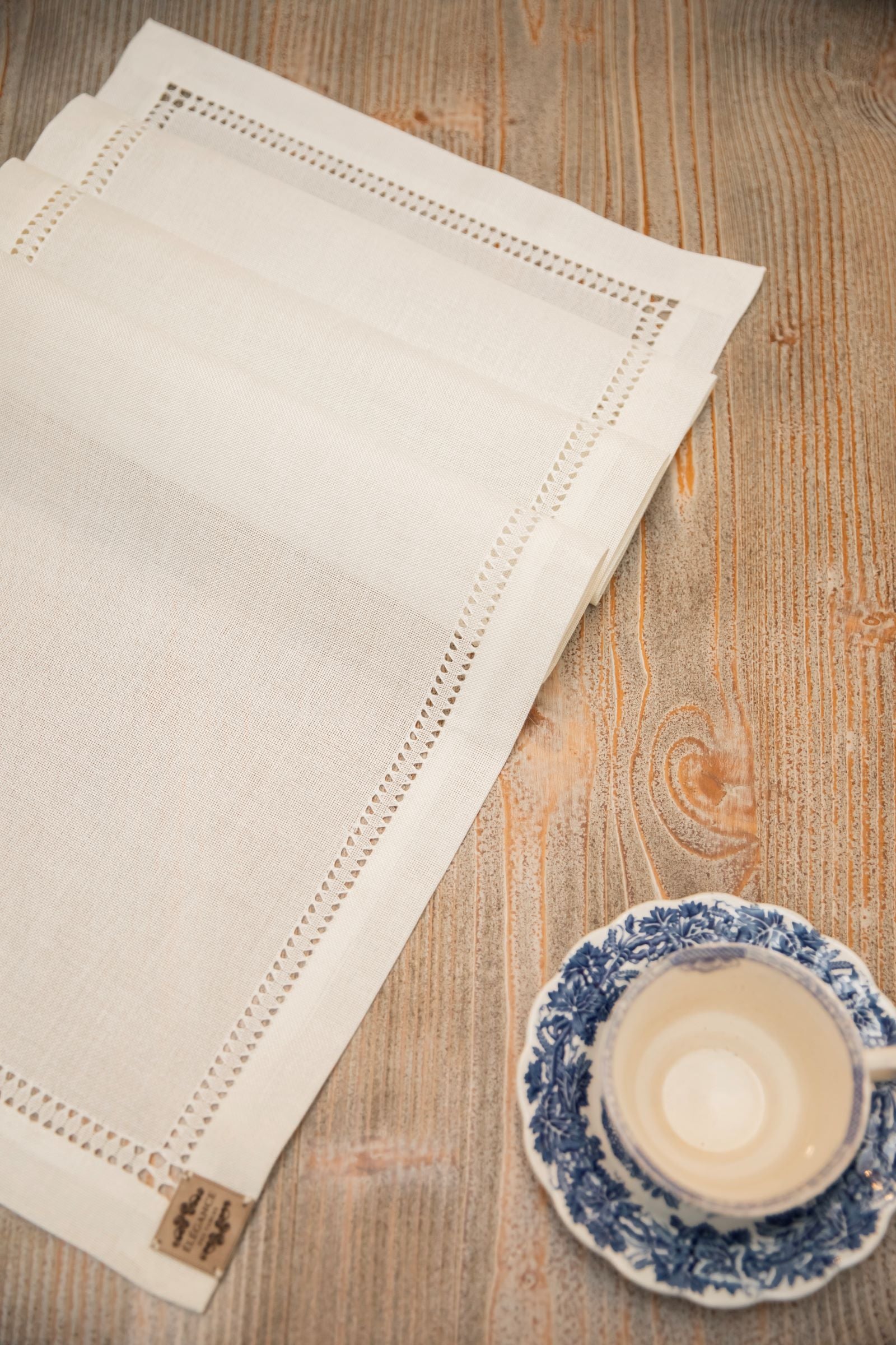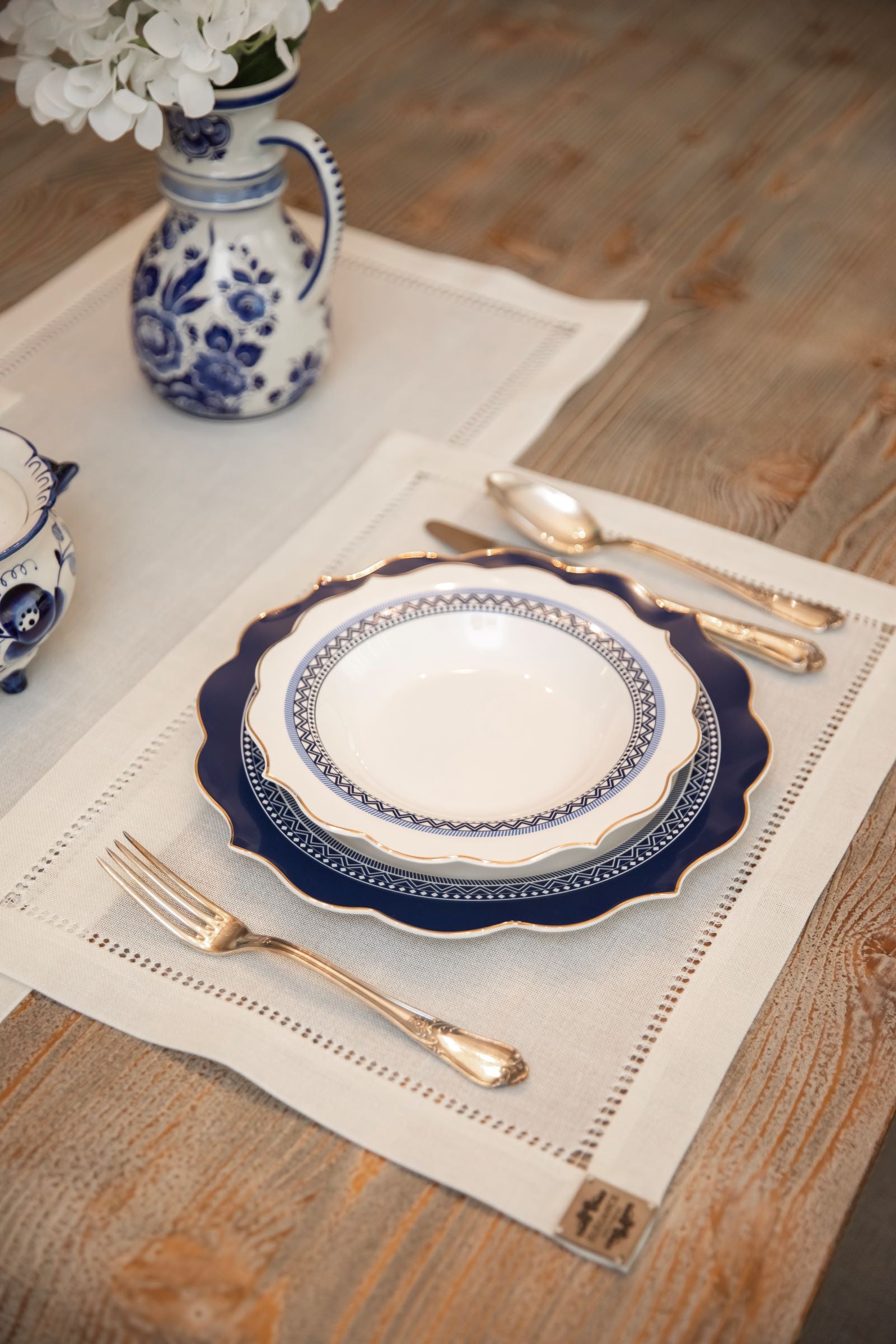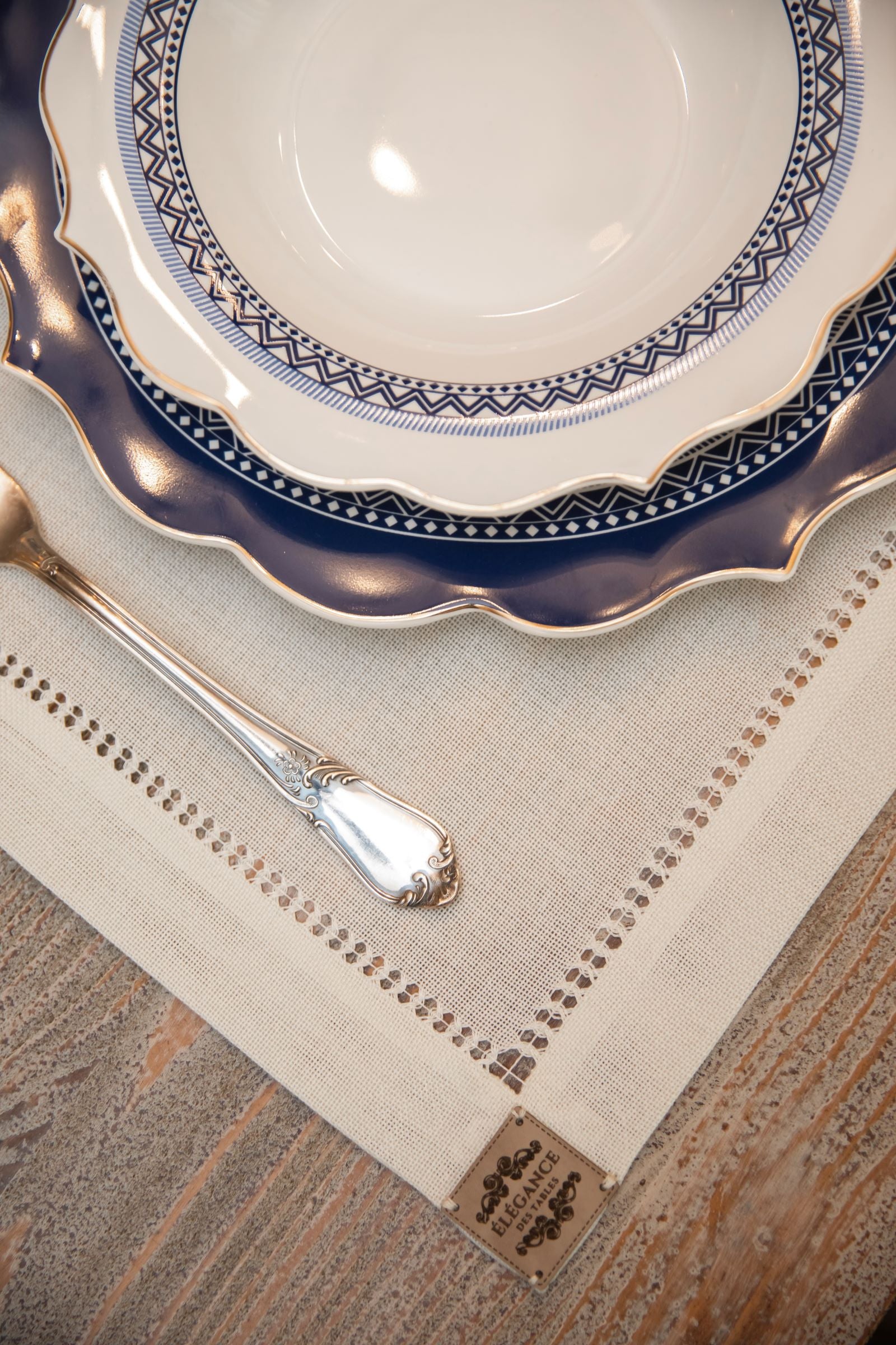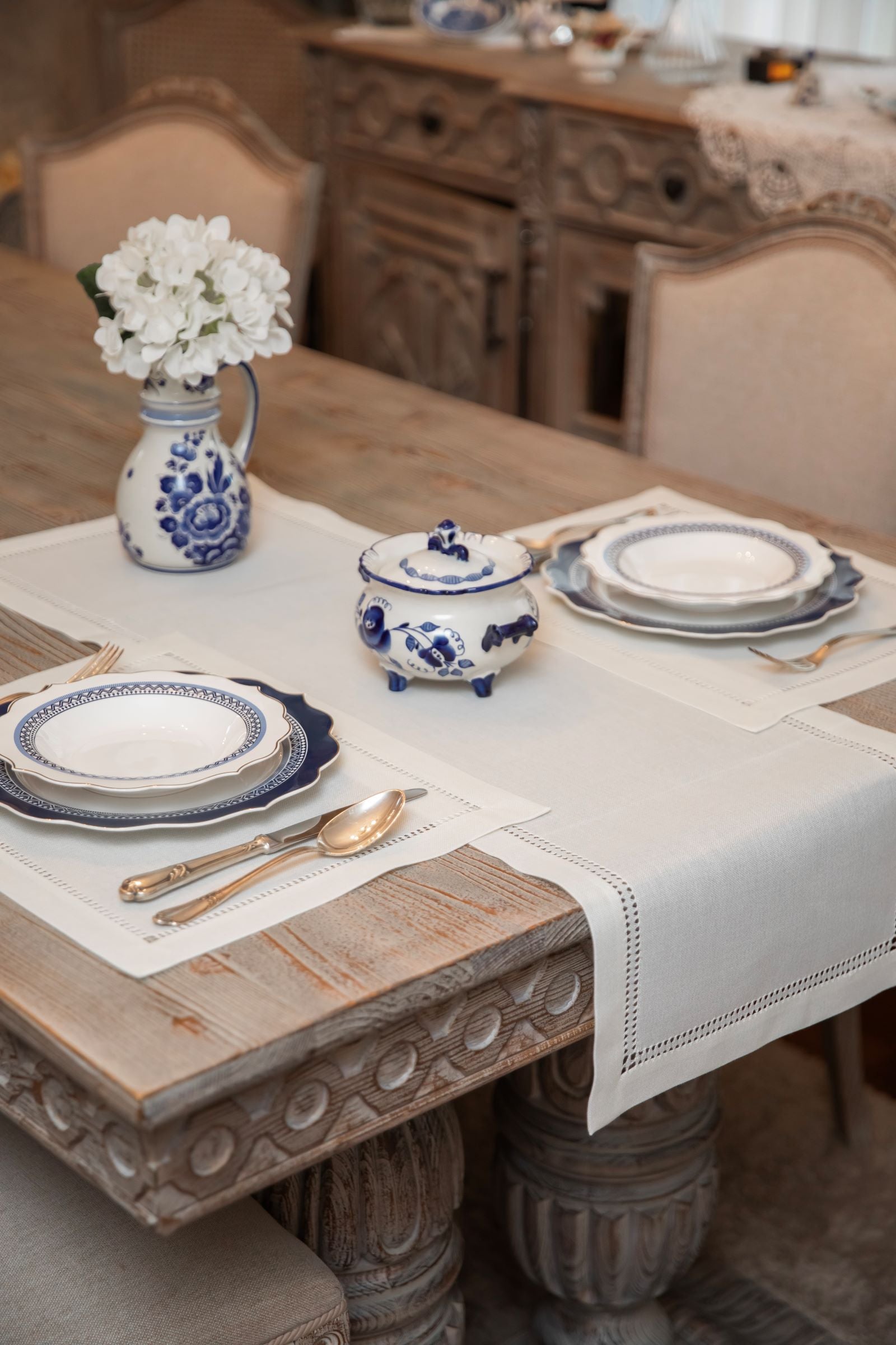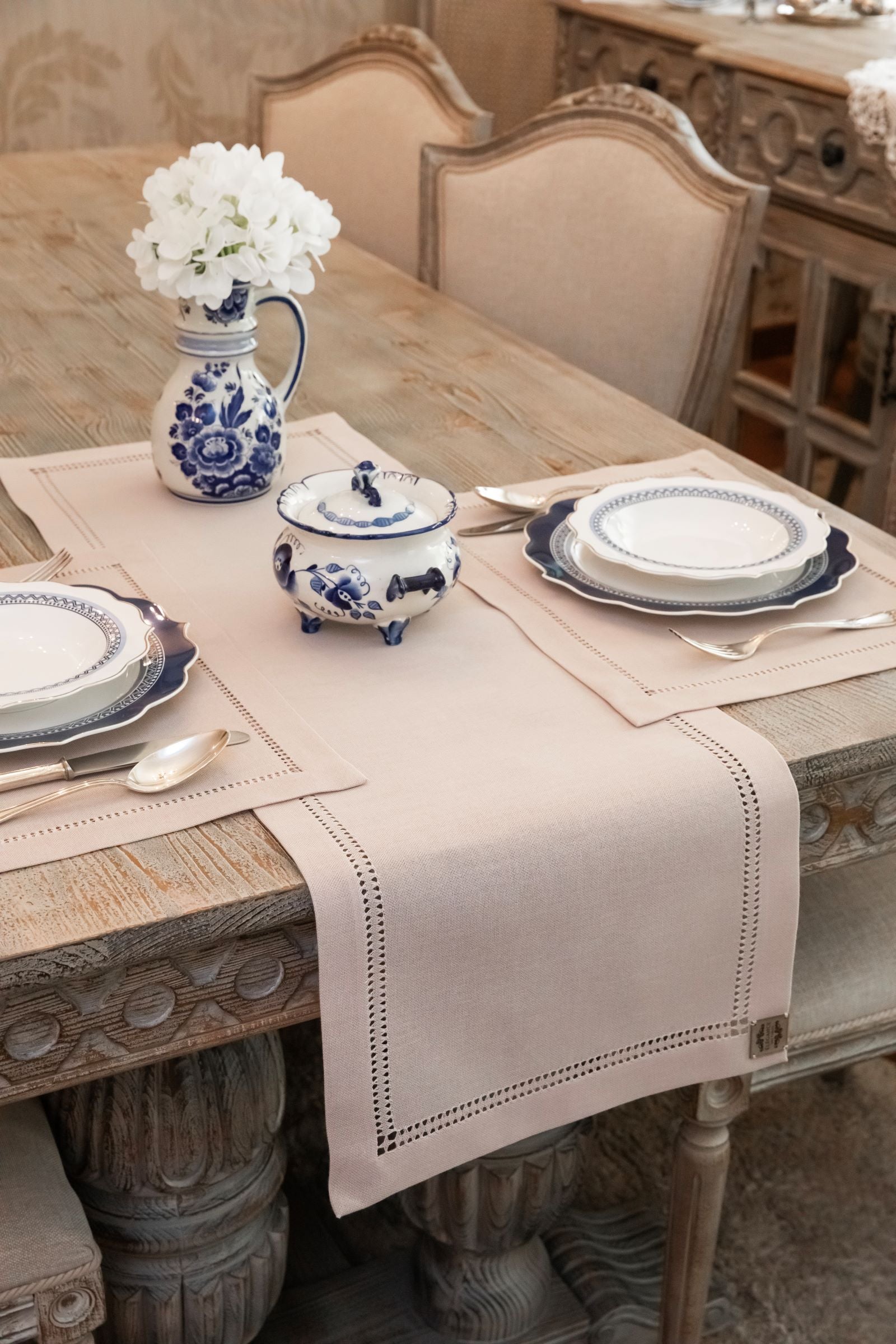 Elevate your dining experience with our exquisite placemat and runner set, featuring delicate handmade Ajouré borders. Each piece is meticulously crafted by skilled artisans, blending traditional craftsmanship with timeless elegance. The intricate Ajouré detailing adds a sophisticated touch, making this set the perfect centerpiece for any dining occasion. Ideal for those who appreciate the art of handmade decor, this set not only enhances your table setting but also brings a sense of refined beauty to your home. Experience the elegance and delicacy of handcrafted design with this elegant set.