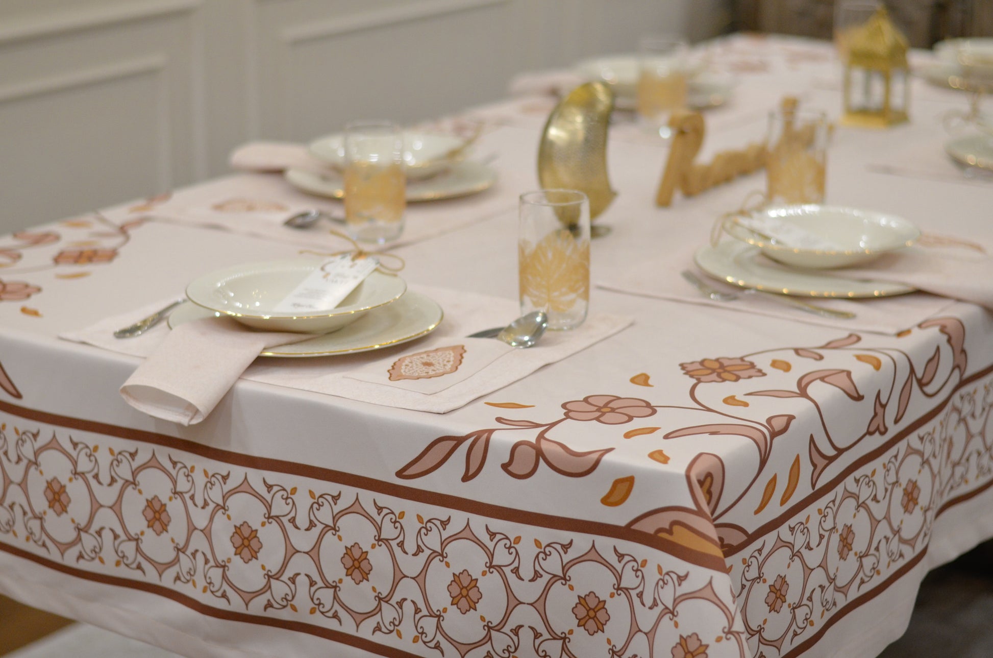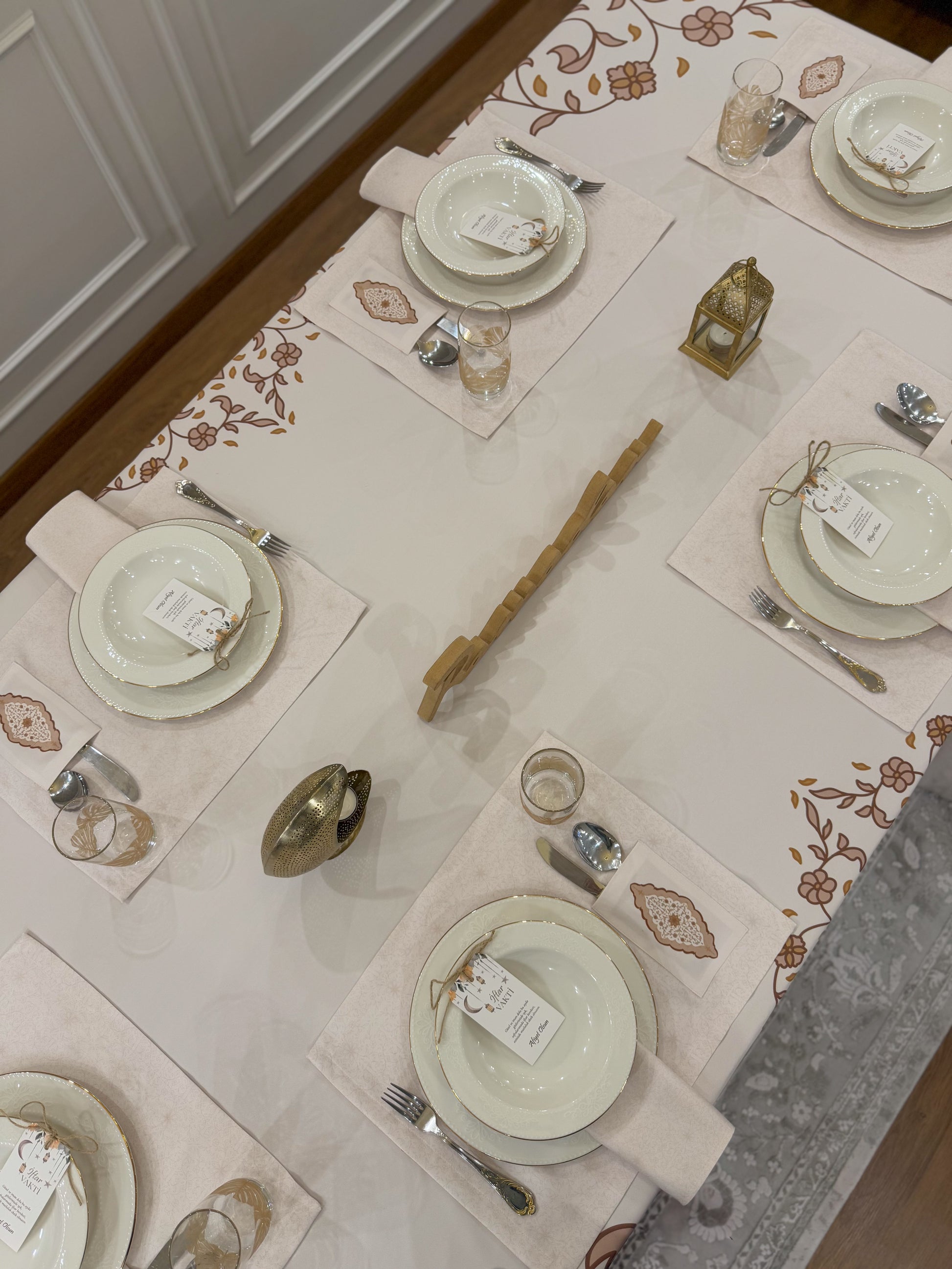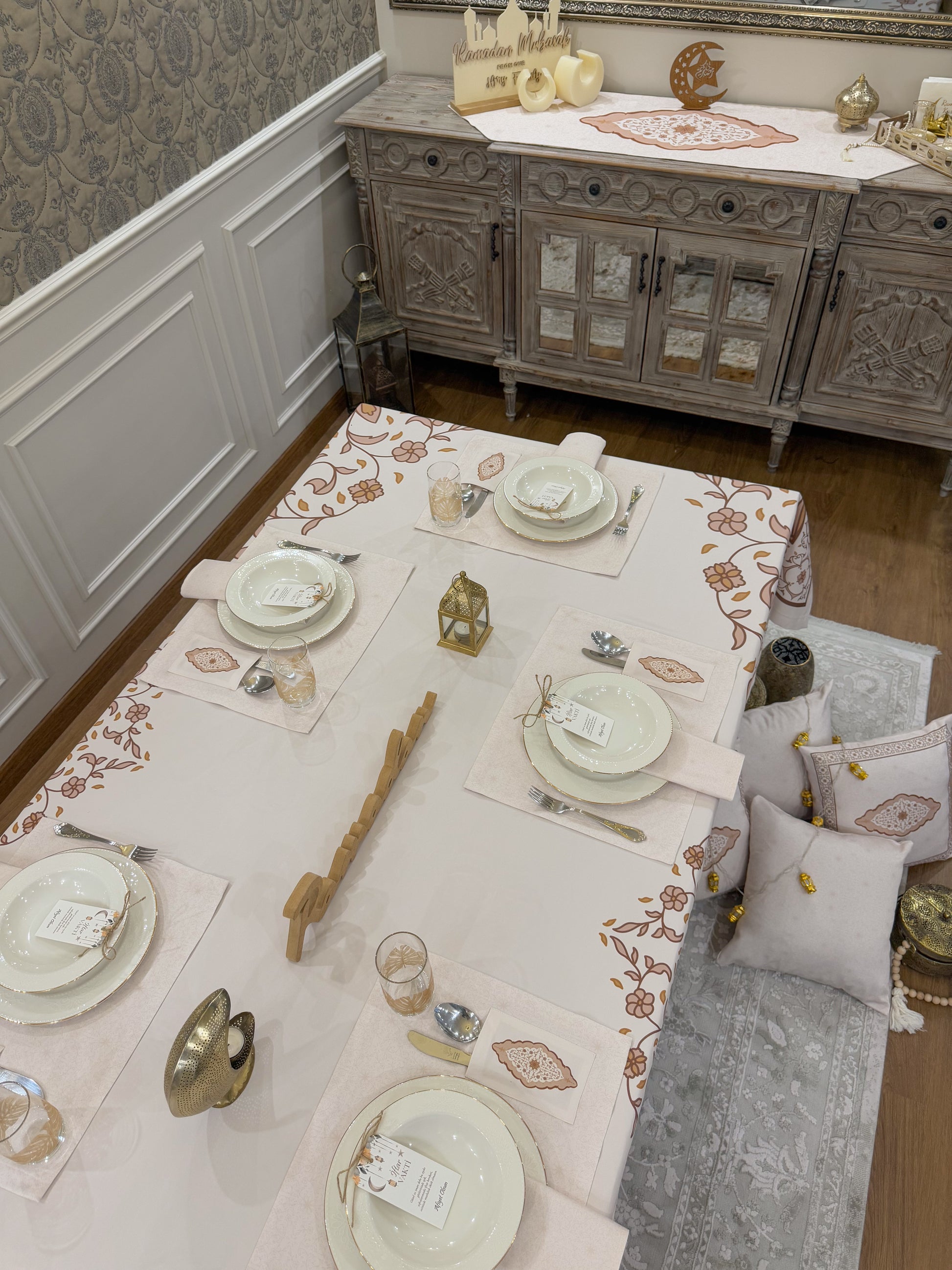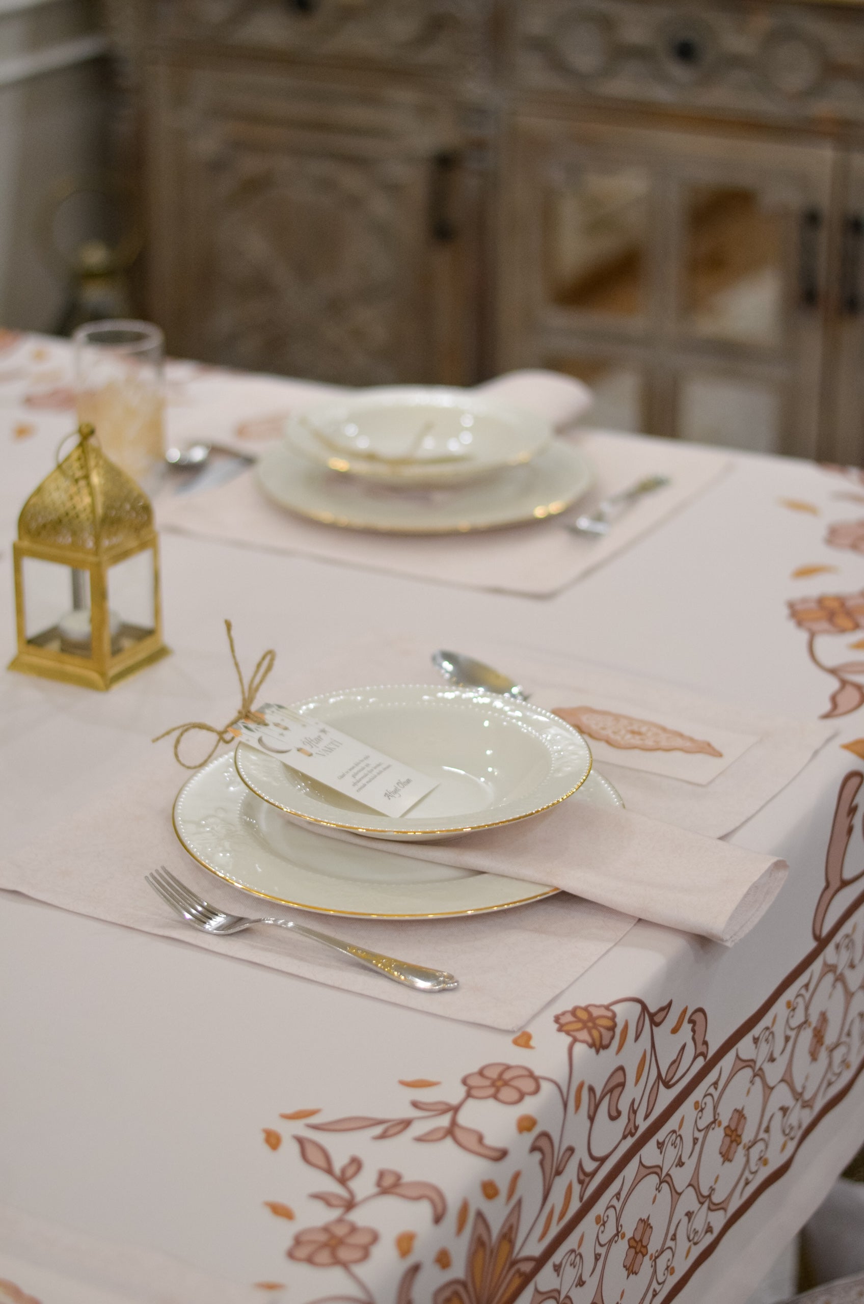 Enrich your Ramadan gatherings with Zahra, a tablecloth from Élégance Des Tables that blends timeless elegance with beautiful floral patterns. Adorned with intricate motifs and graceful designs, Zahra brings a sense of serenity and warmth to your Iftar setting.