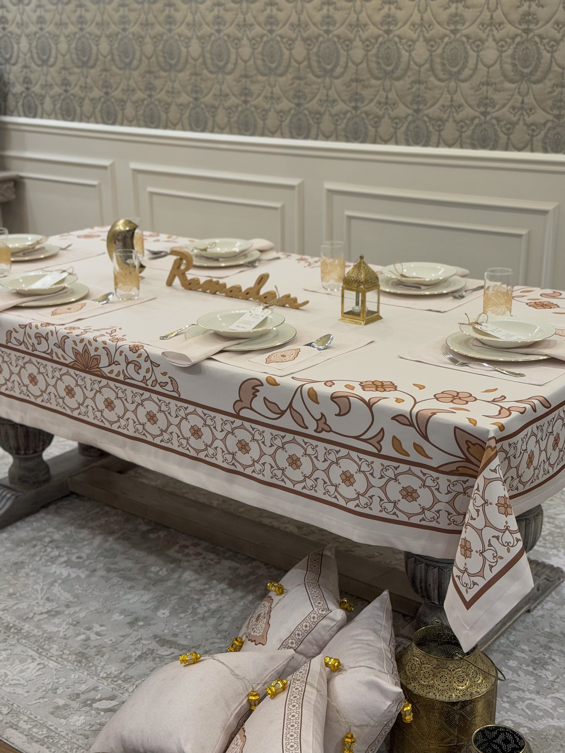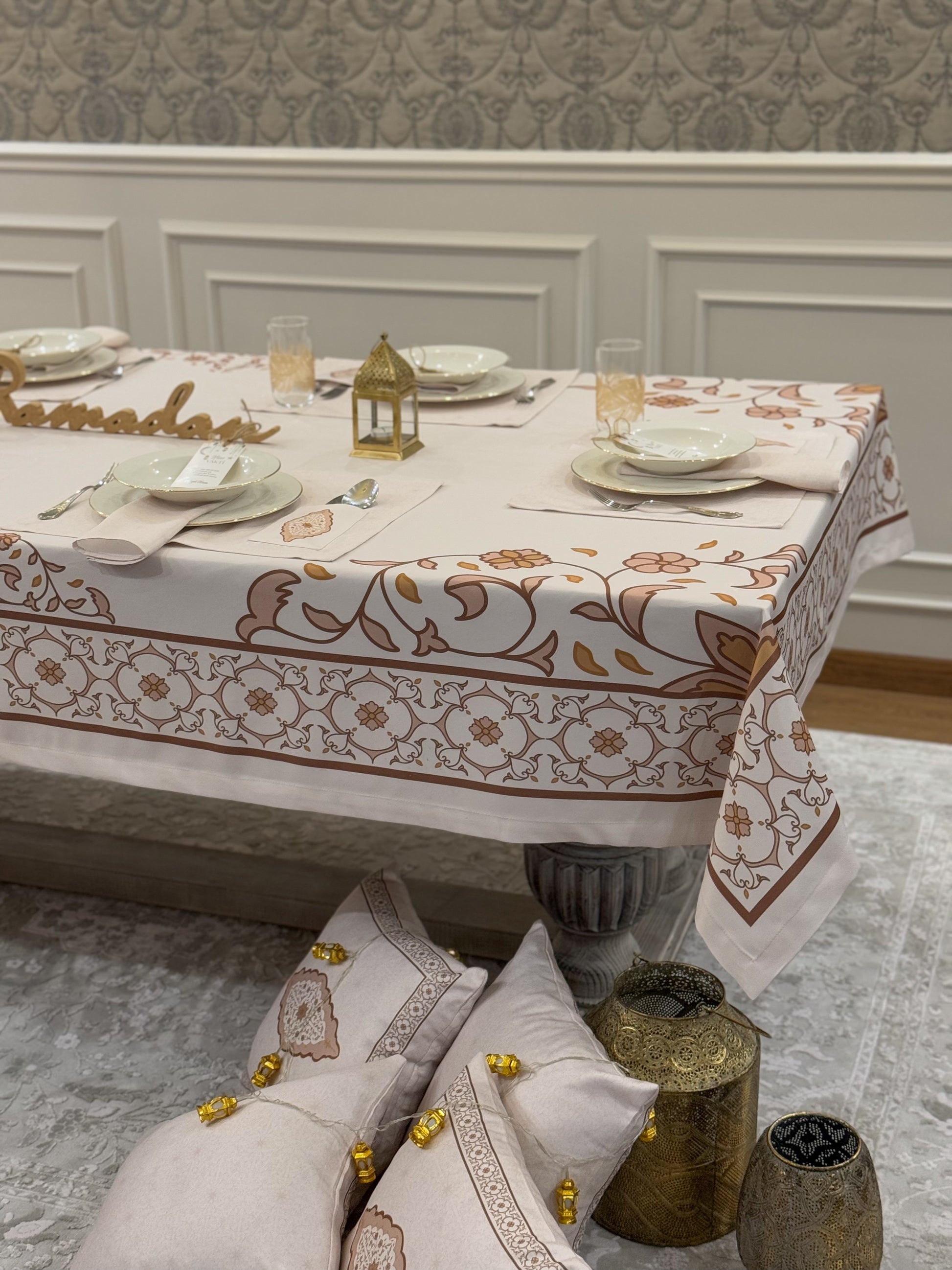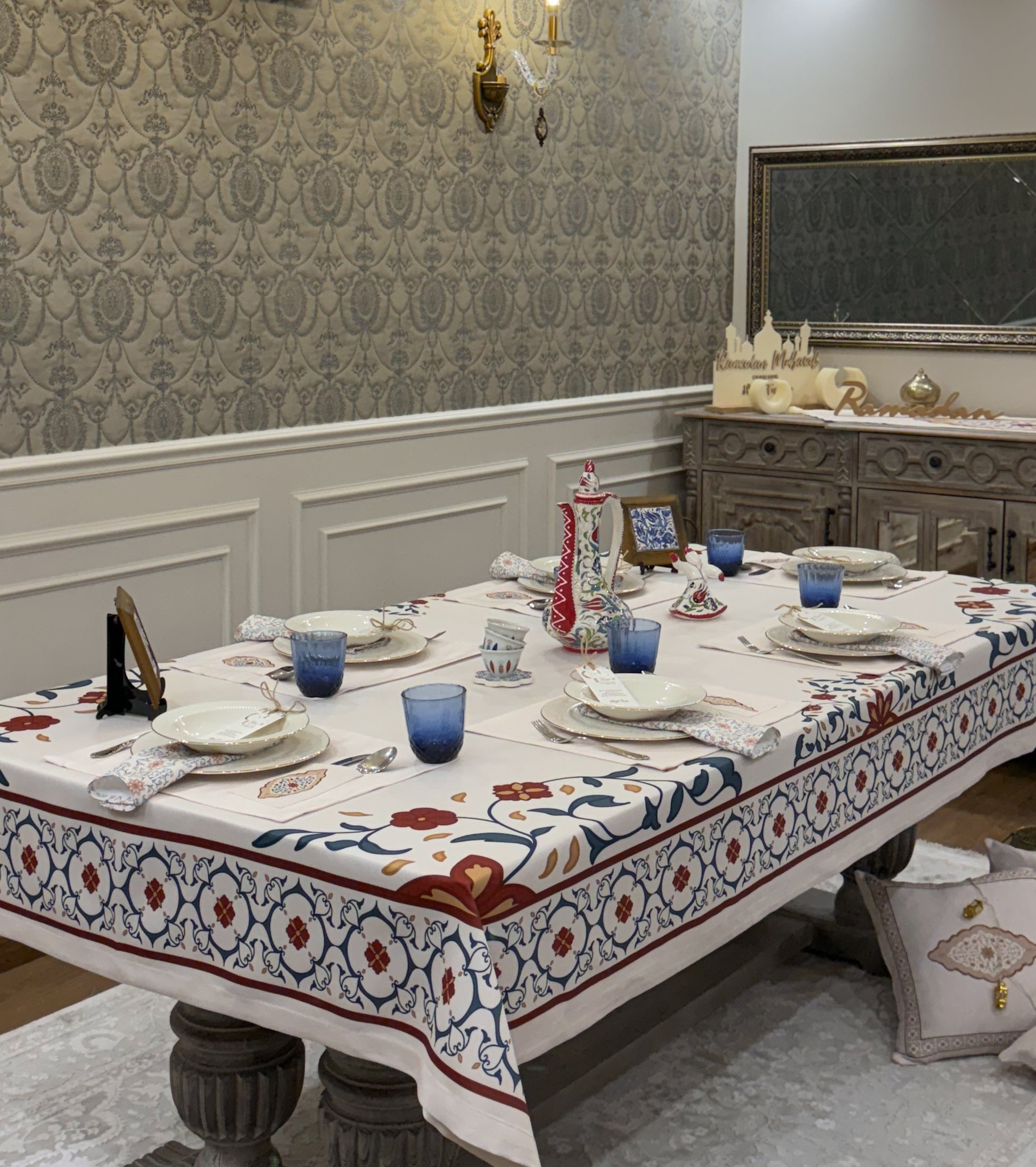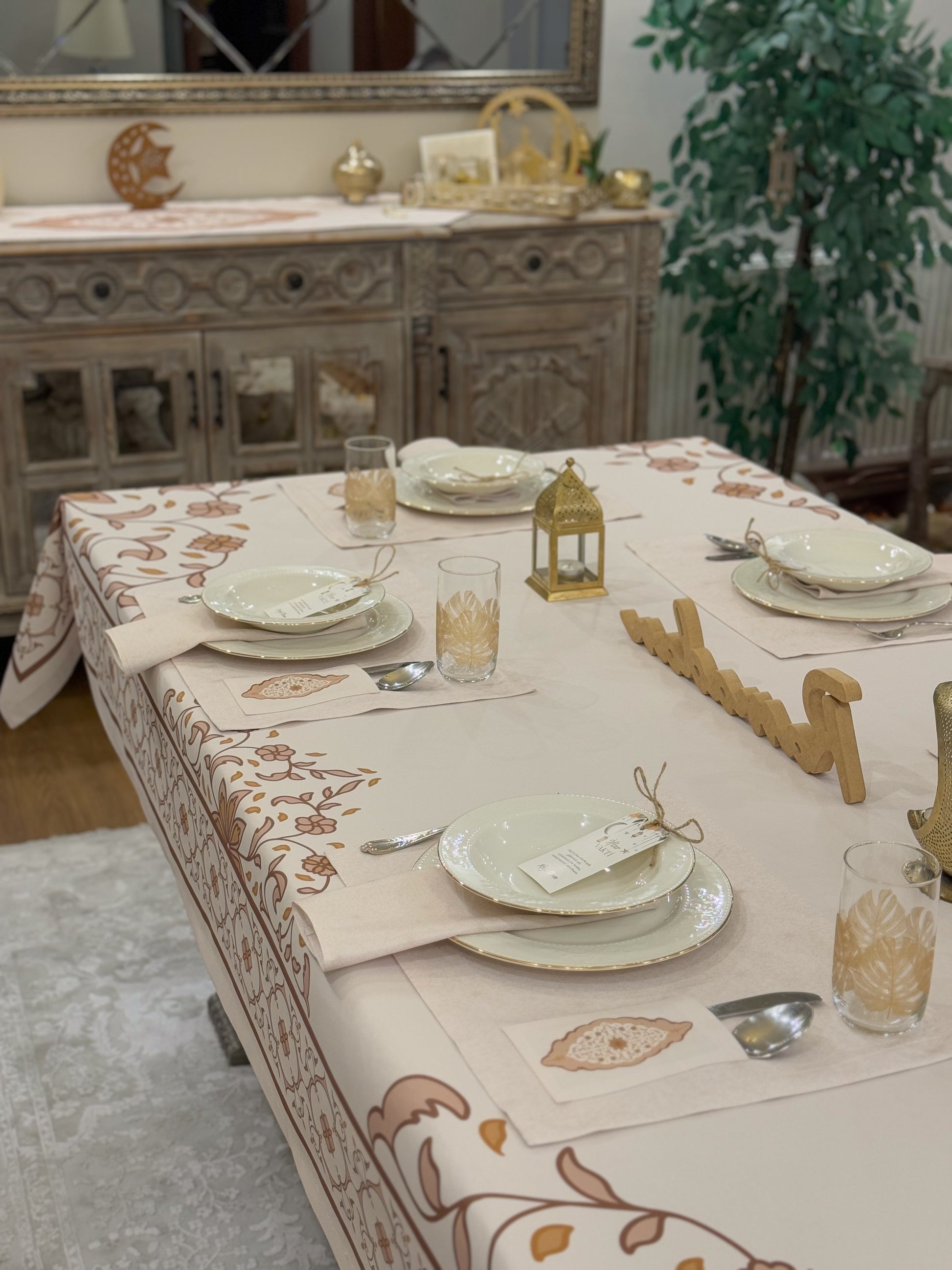 Perfect for welcoming family and loved ones during this sacred month, Zahra creates an inviting atmosphere of generosity and togetherness. Crafted with meticulous attention to detail, this exquisite tablecloth transforms your space into a refined and hospitable haven, making every Ramadan evening truly special.
