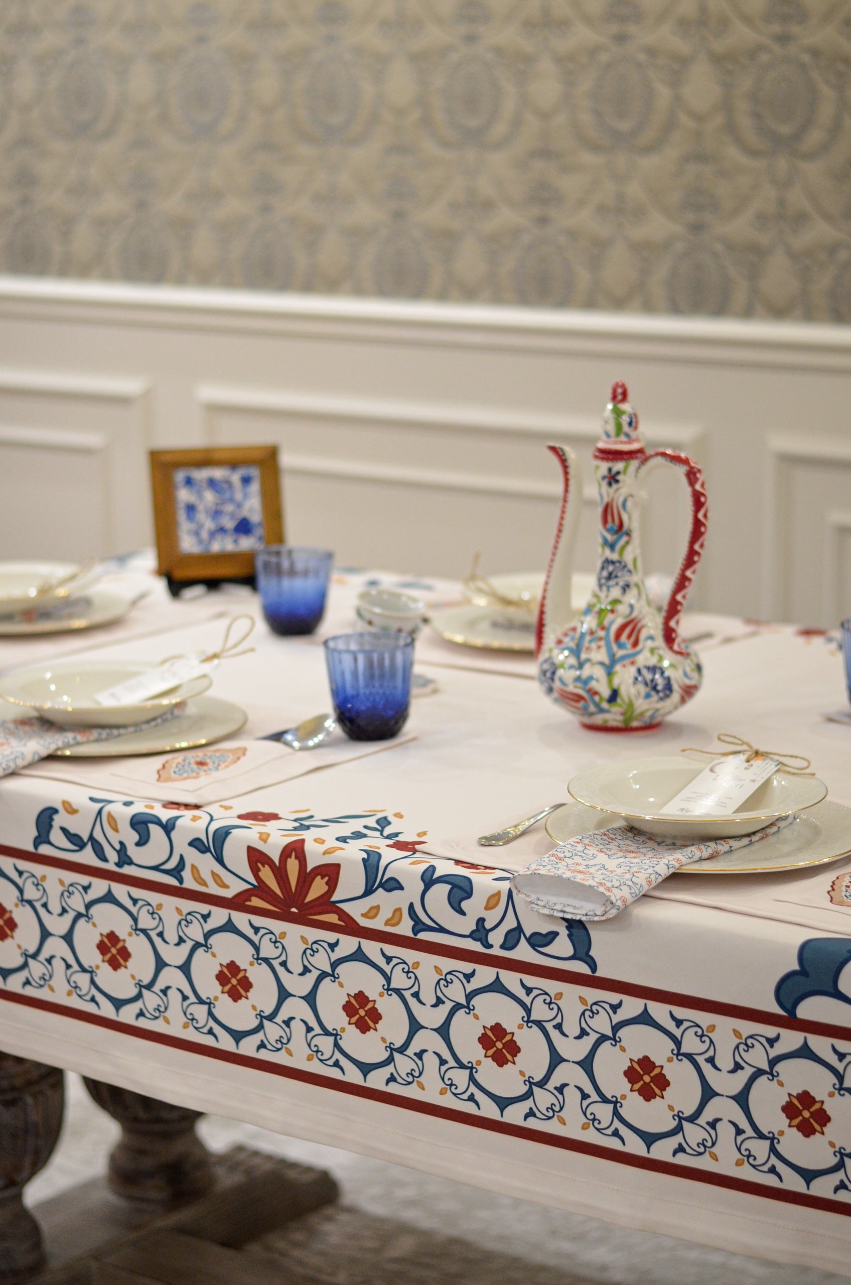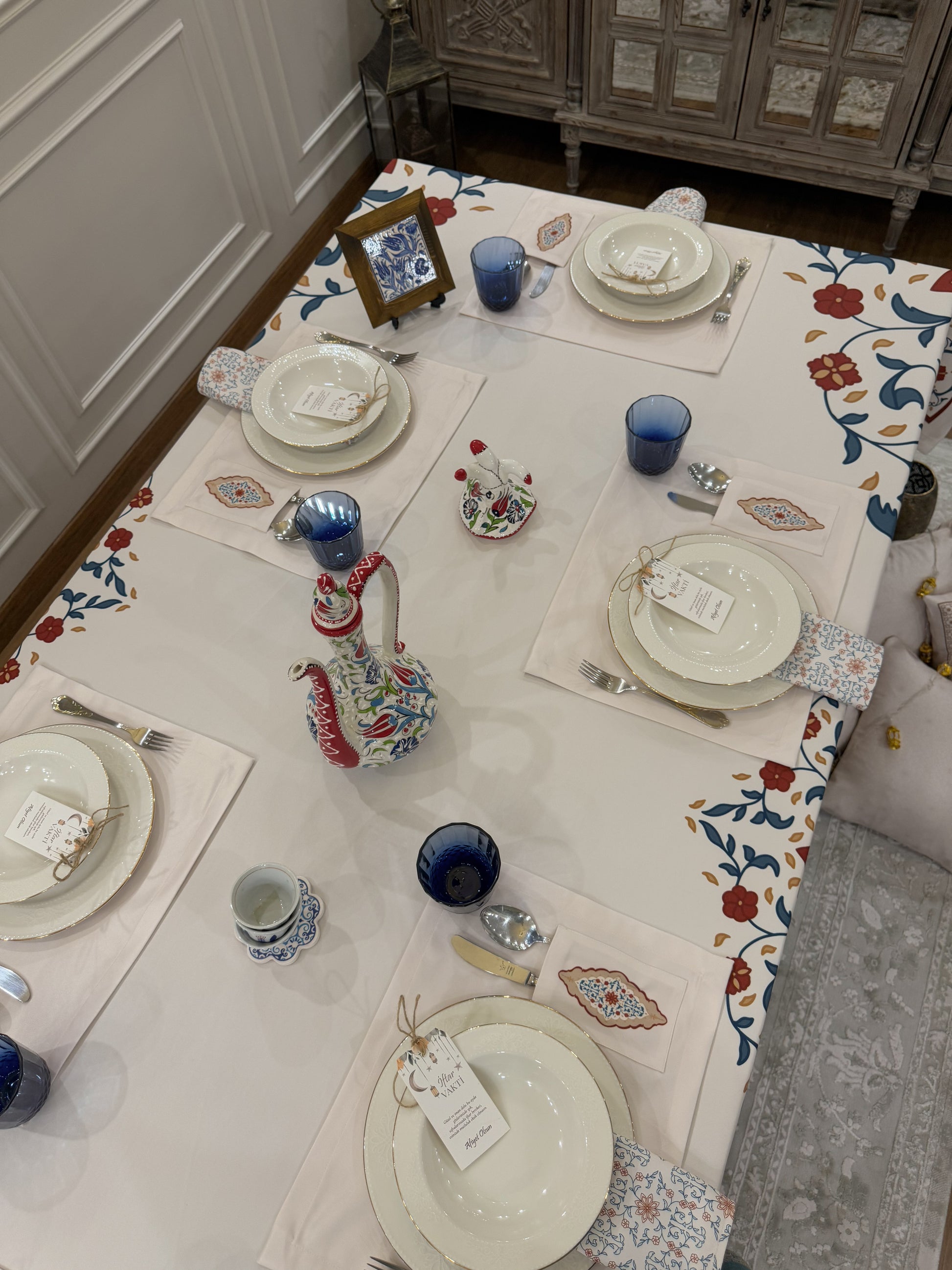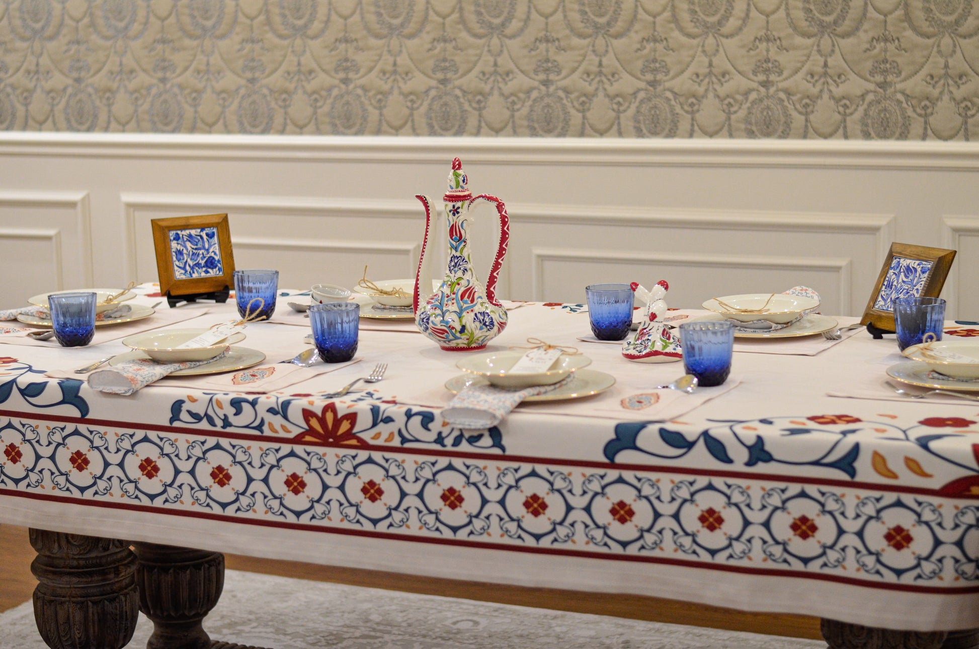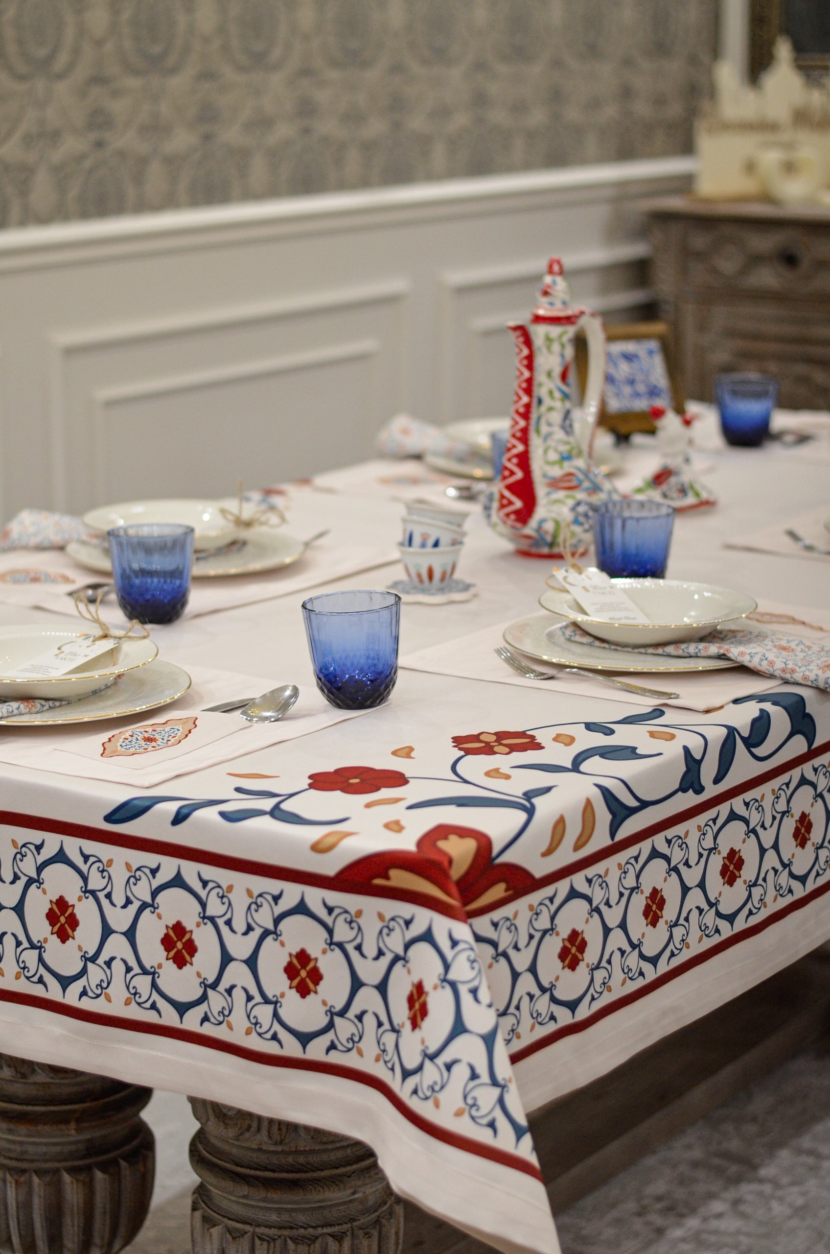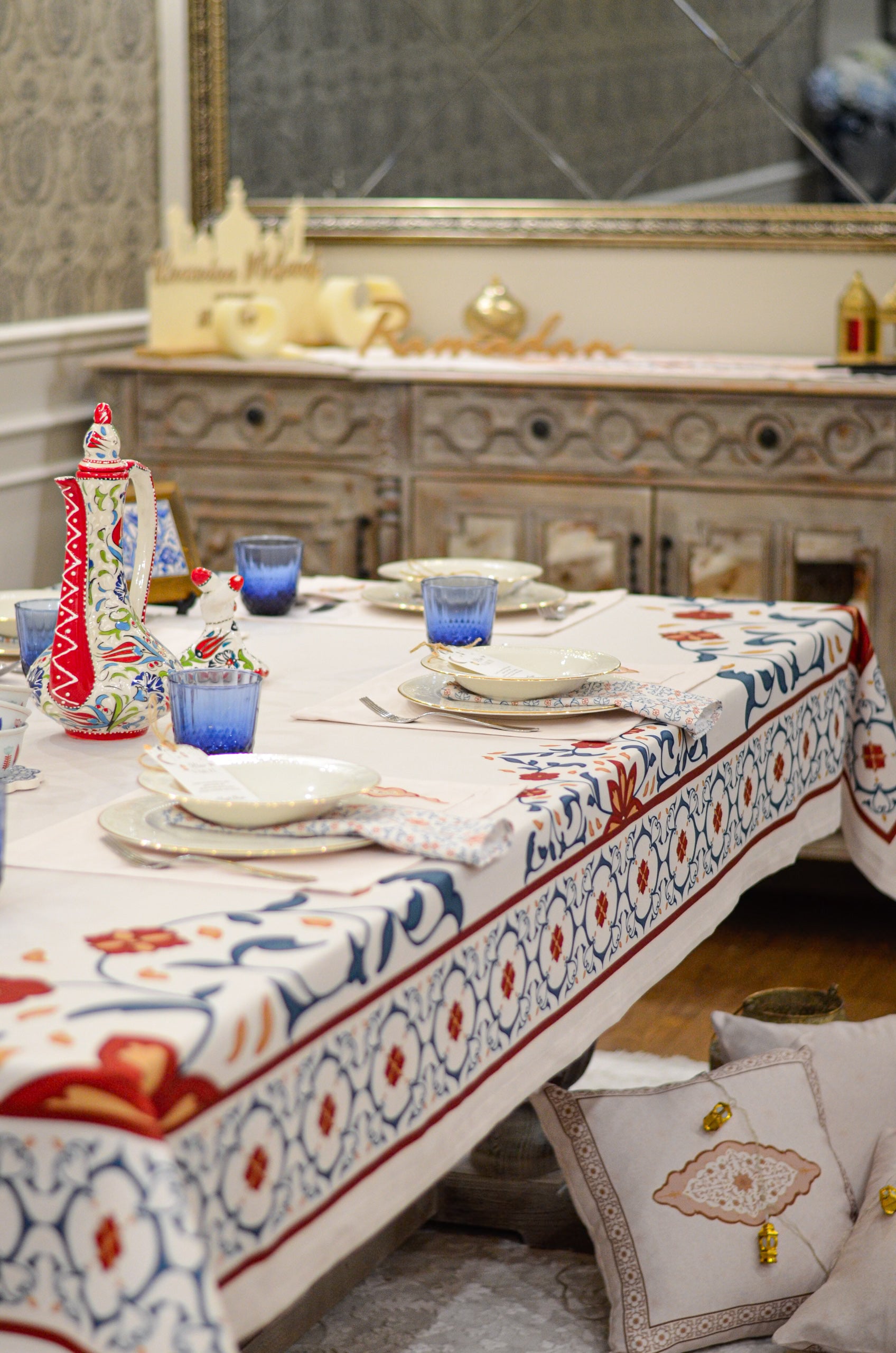 Perfect for welcoming family and loved ones during this sacred month, Zahra creates an inviting atmosphere of generosity and togetherness. Crafted with meticulous attention to detail, this exquisite tablecloth transforms your space into a refined and hospitable haven, making every Ramadan evening truly special.