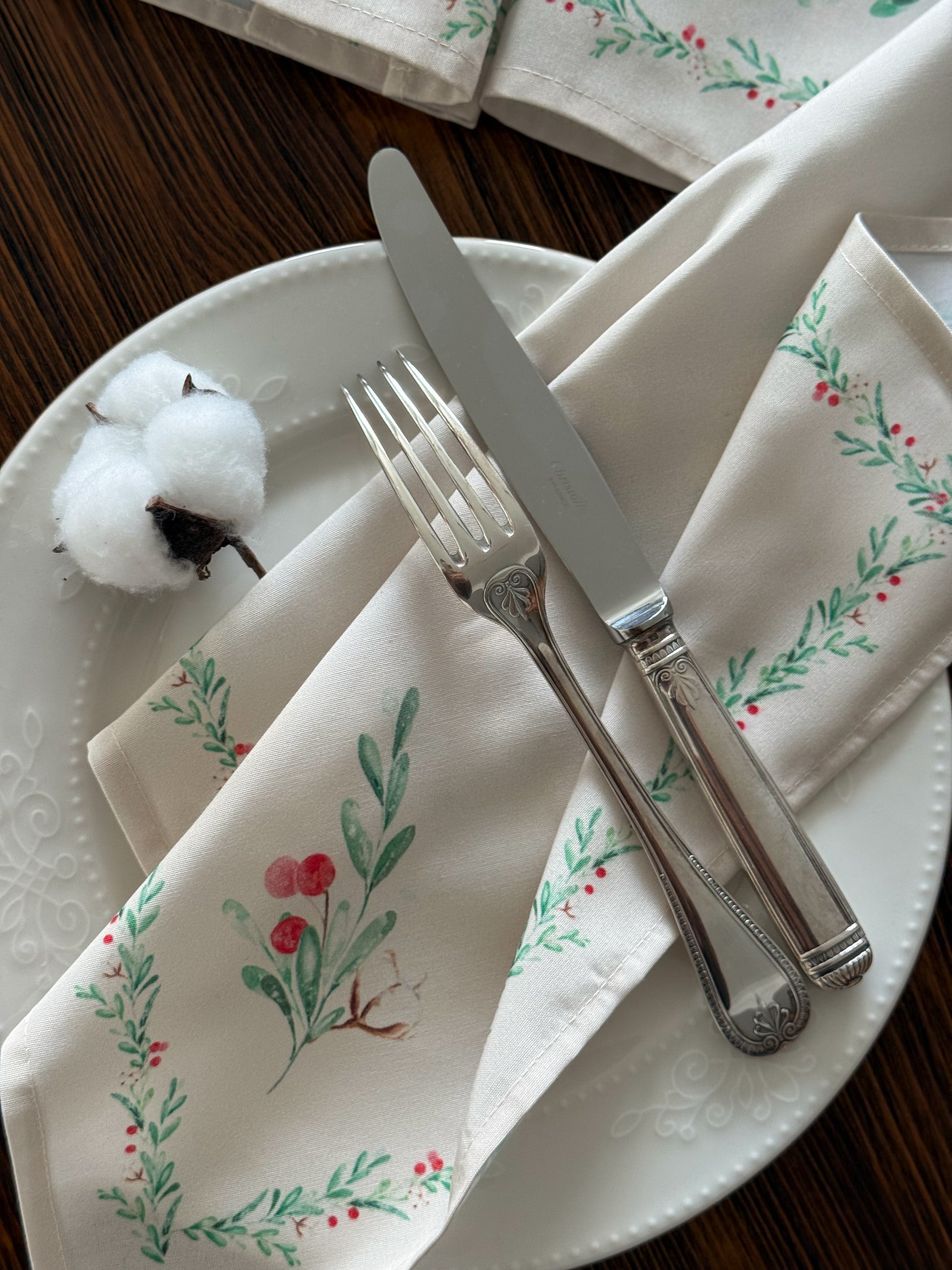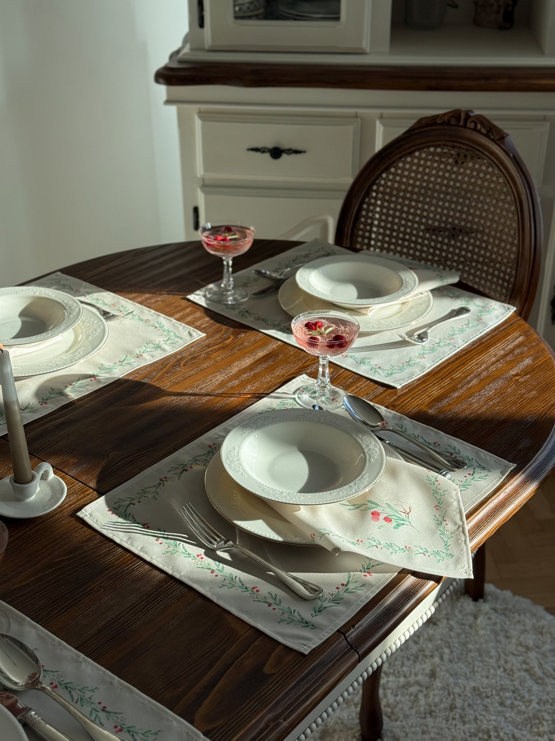 Welcome the serene beauty of winter with Cottonberry, a watercolor-hand-painted placemats and napkins set by artist Emy’s Aquarelle. Inspired by fluffy cotton blossoms, vibrant cranberries, tender wheat flowers, and leaves brushed with snow, its light botanical design brings a gentle seasonal glow to your table. Thoughtfully crafted to enhance winter dinners and New Year gatherings, Cottonberry adds a touch of natural warmth and artistic charm to every celebration.