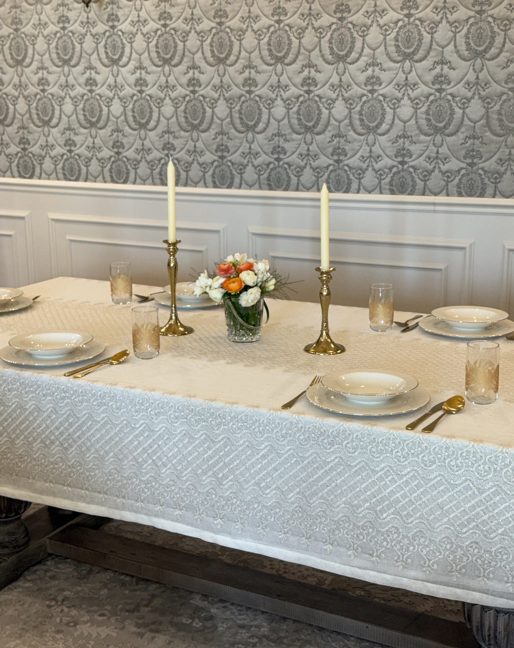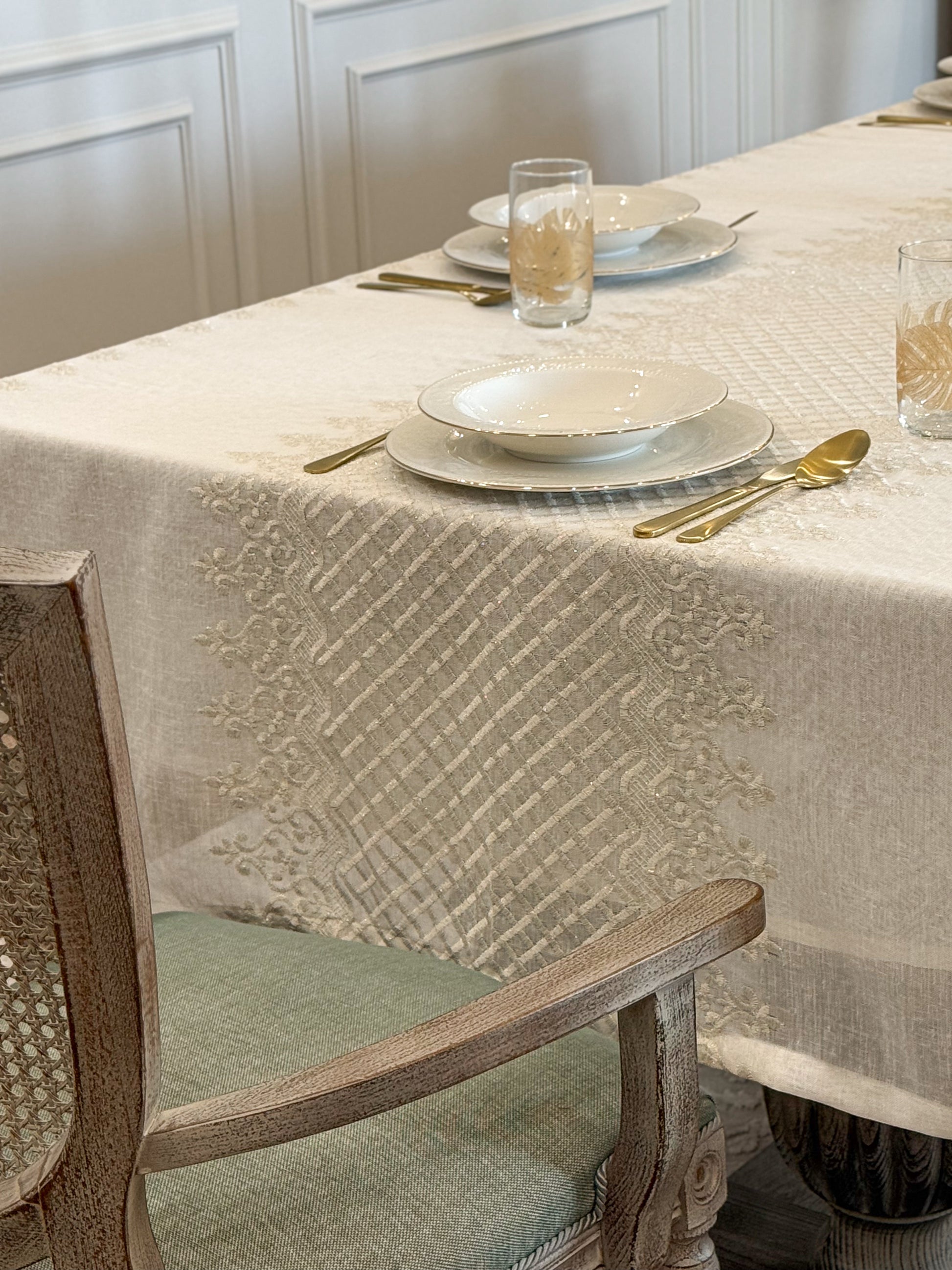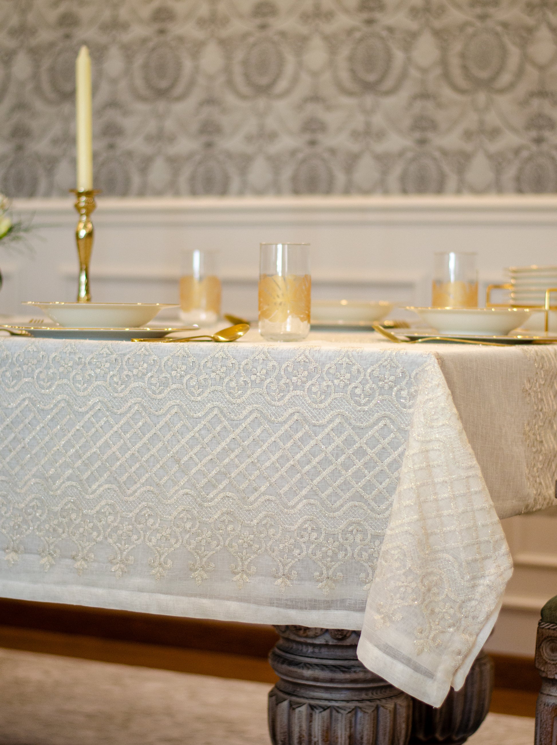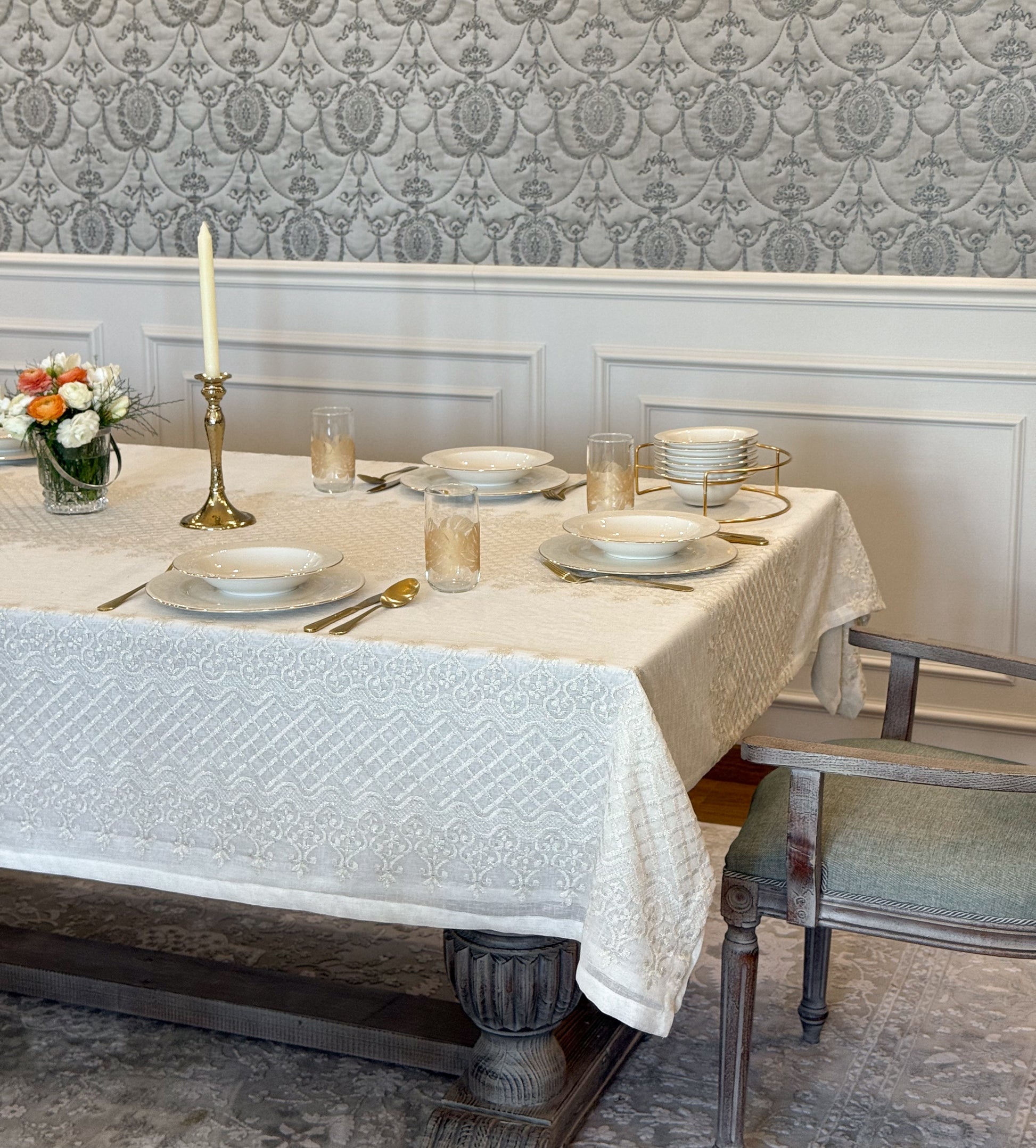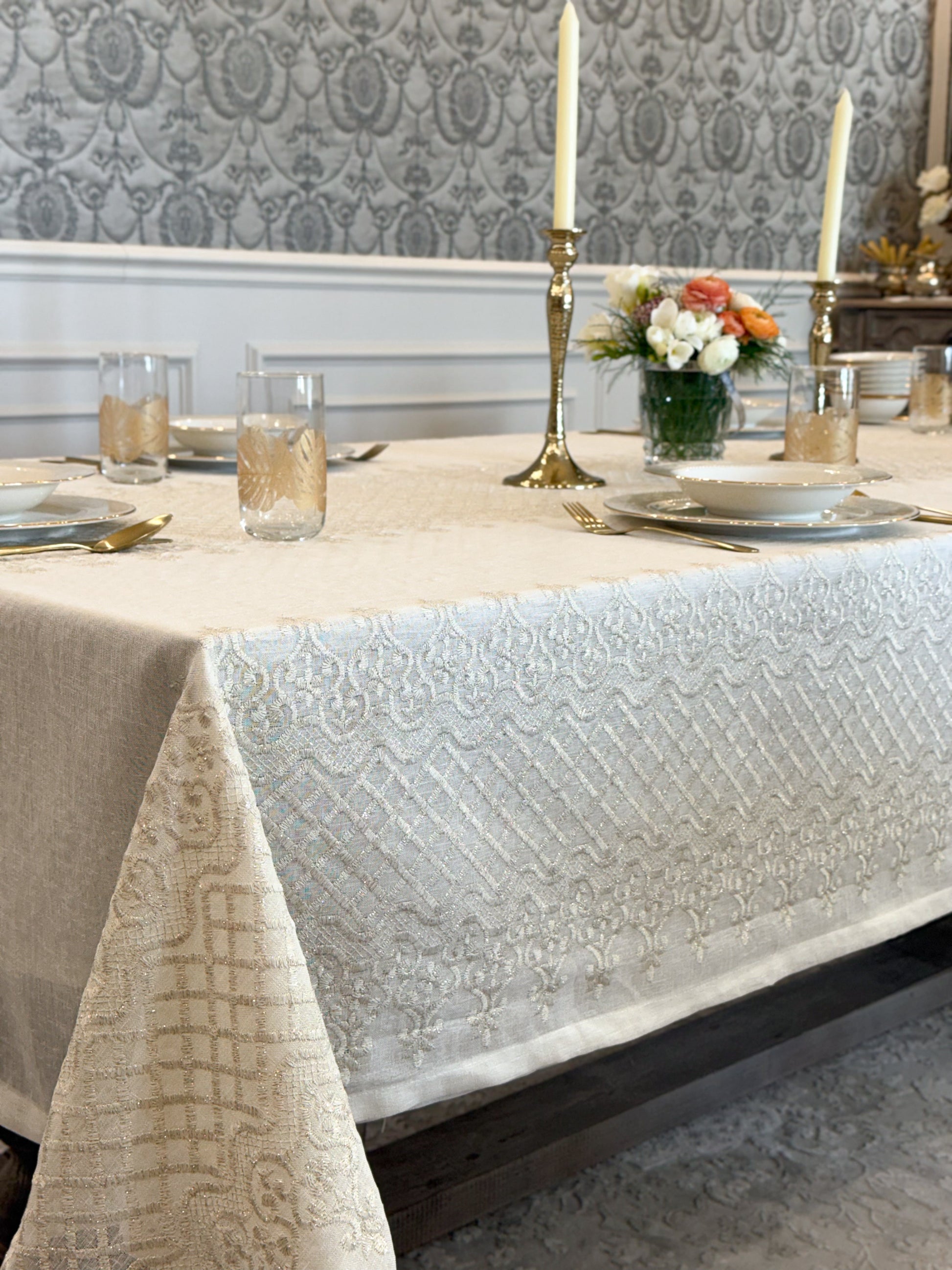 Turn your table into a statement of natural elegance with the Regal Mosaic tablecloth. Crafted from premium linen and embroidered with rich mosaic and damask motif, it blends organic charm with timeless sophistication. Shop now to bring refined beauty and effortless style to your dining space. It is layered with “Linen” tablecloth underneath, but it is sold separately.