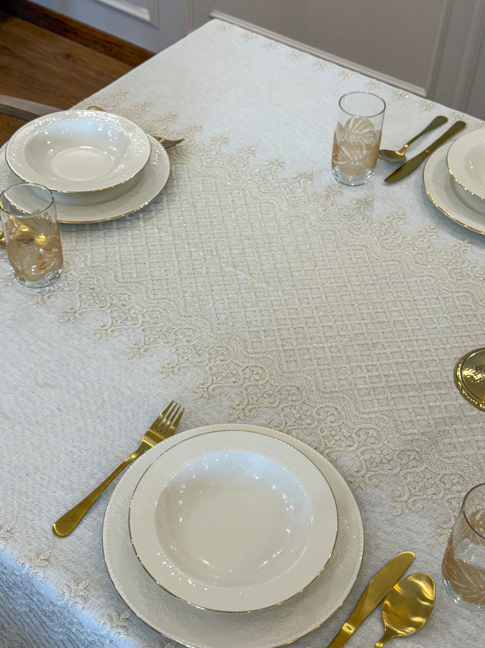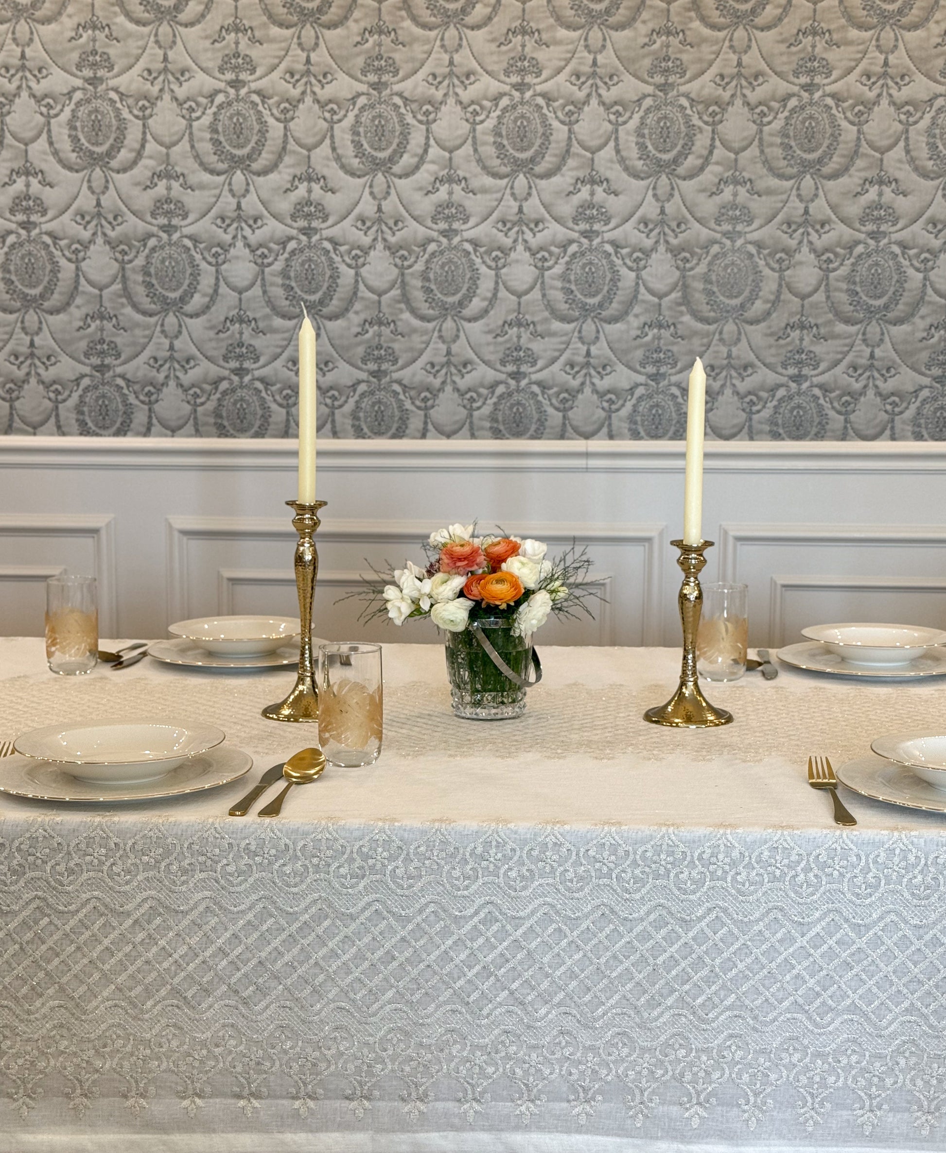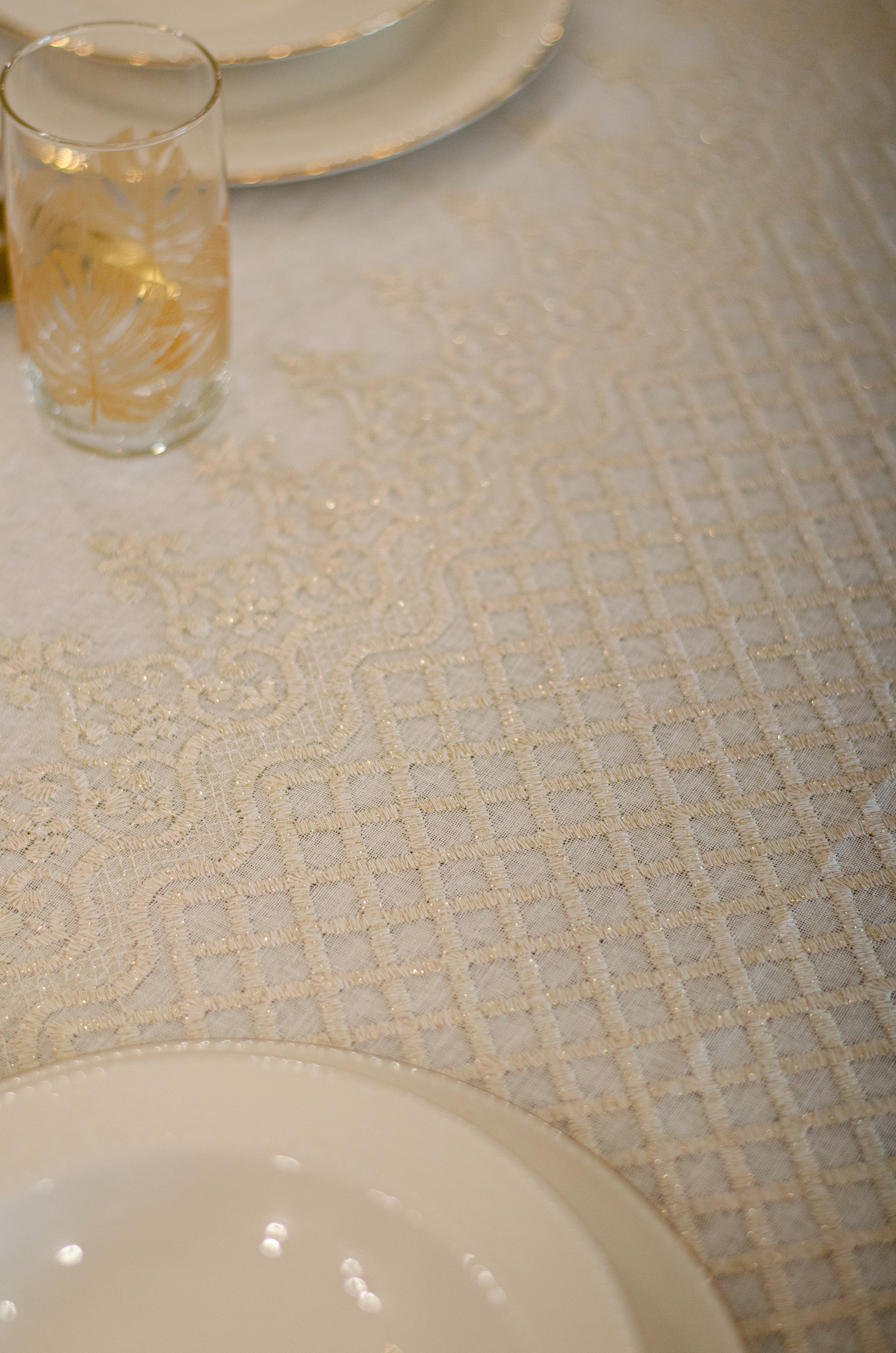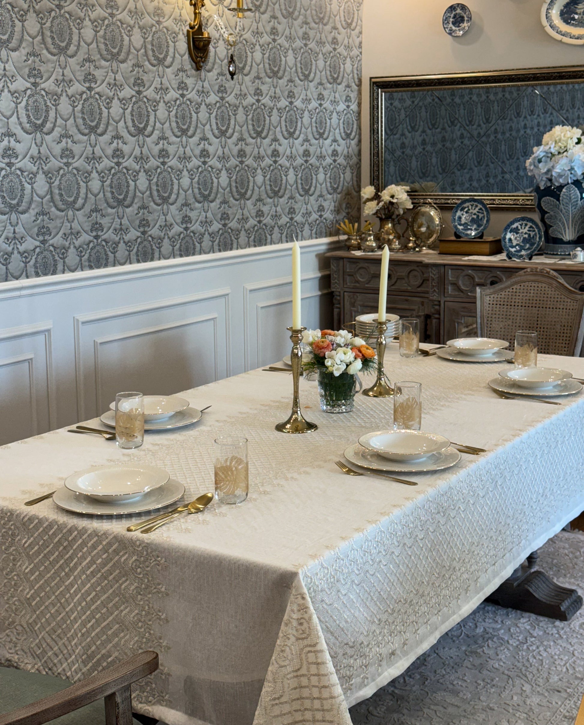Turn your table into a statement of natural elegance with the Regal Mosaic tablecloth. Crafted from premium linen and embroidered with rich mosaic and damask motif, it blends organic charm with timeless sophistication. Shop now to bring refined beauty and effortless style to your dining space. It is layered with “Linen” tablecloth underneath, but it is sold separately.