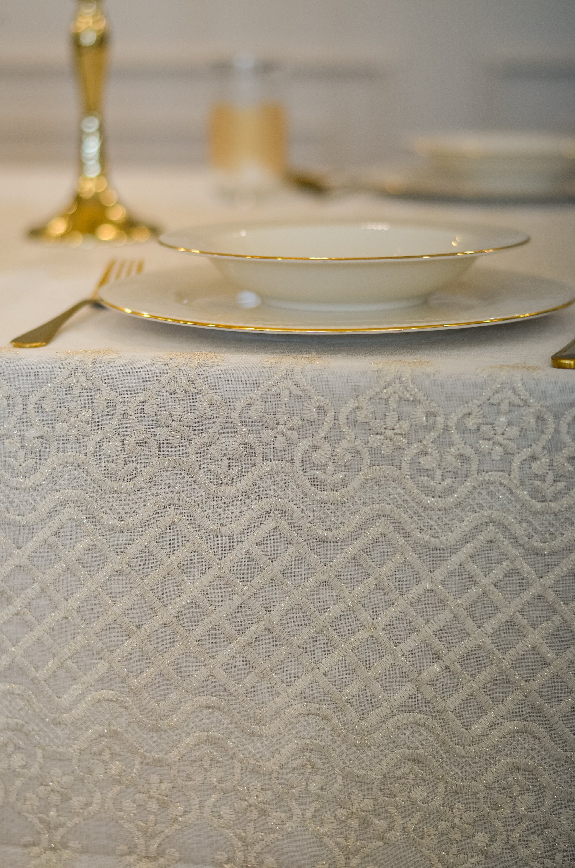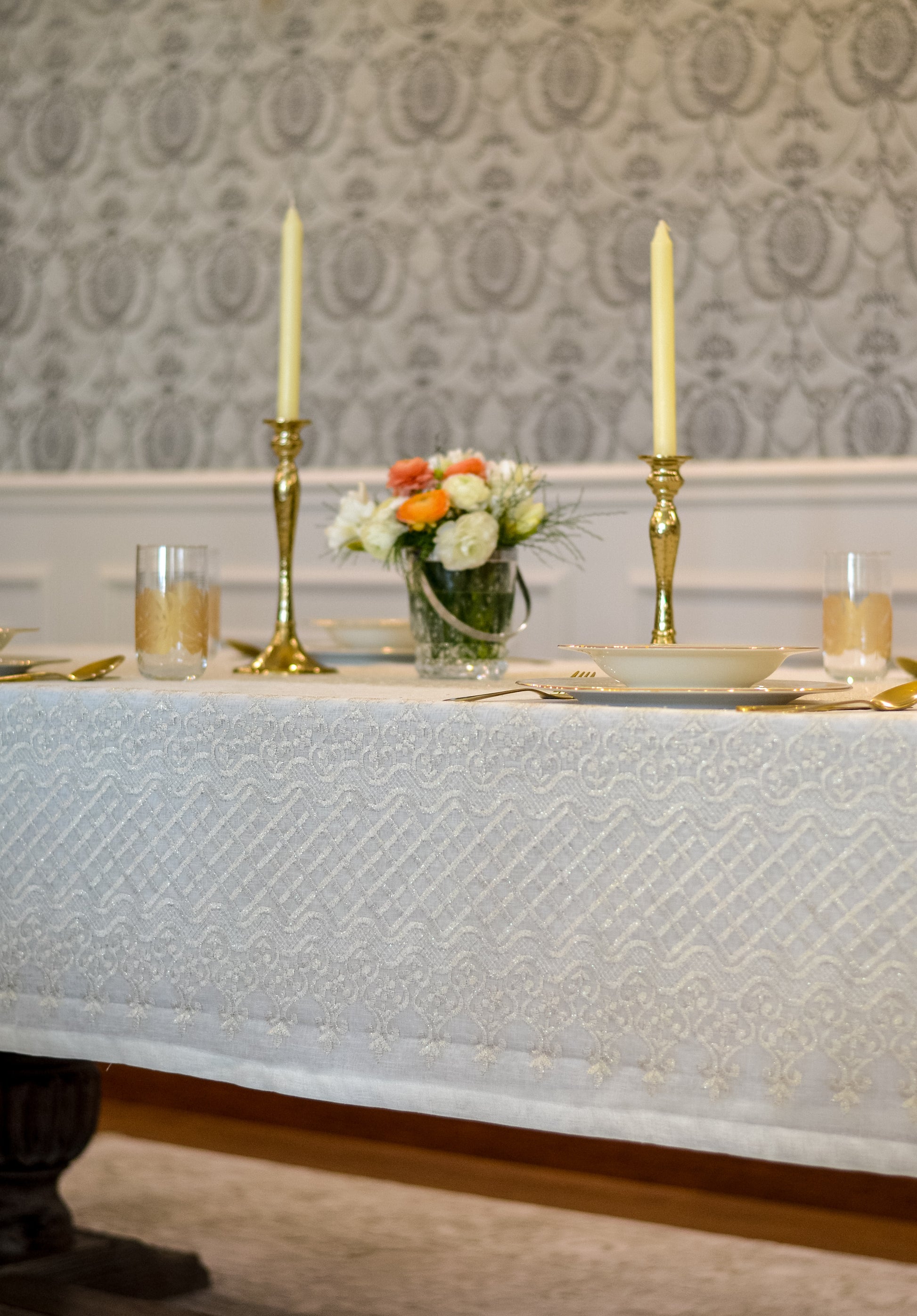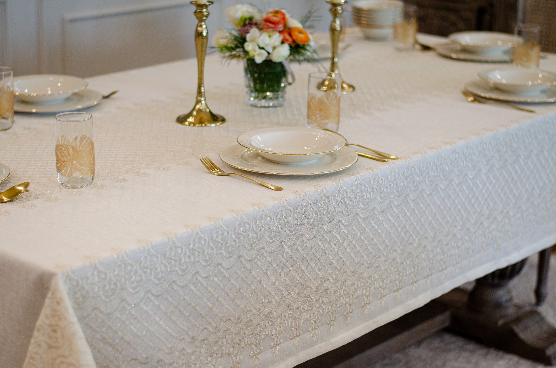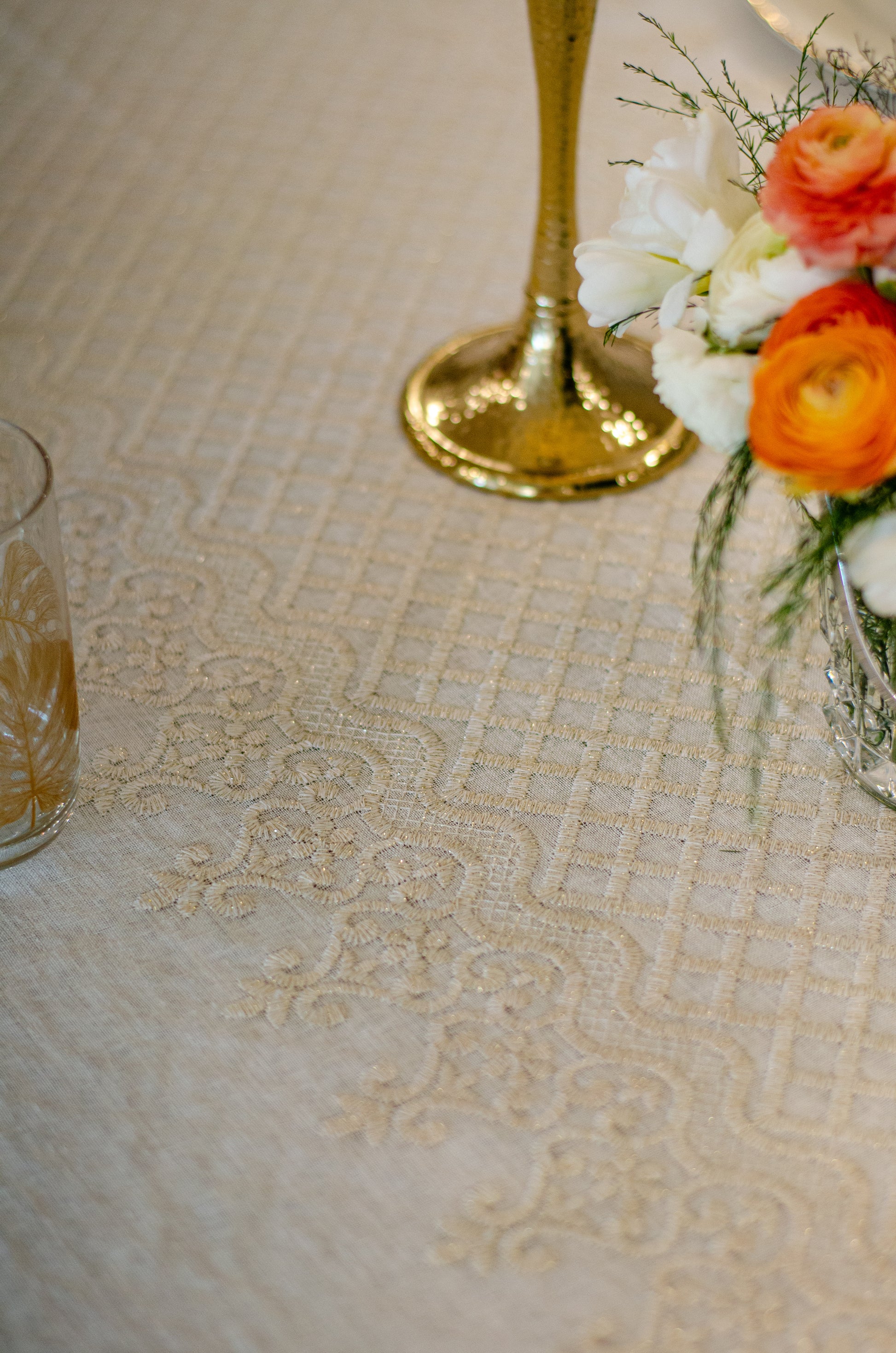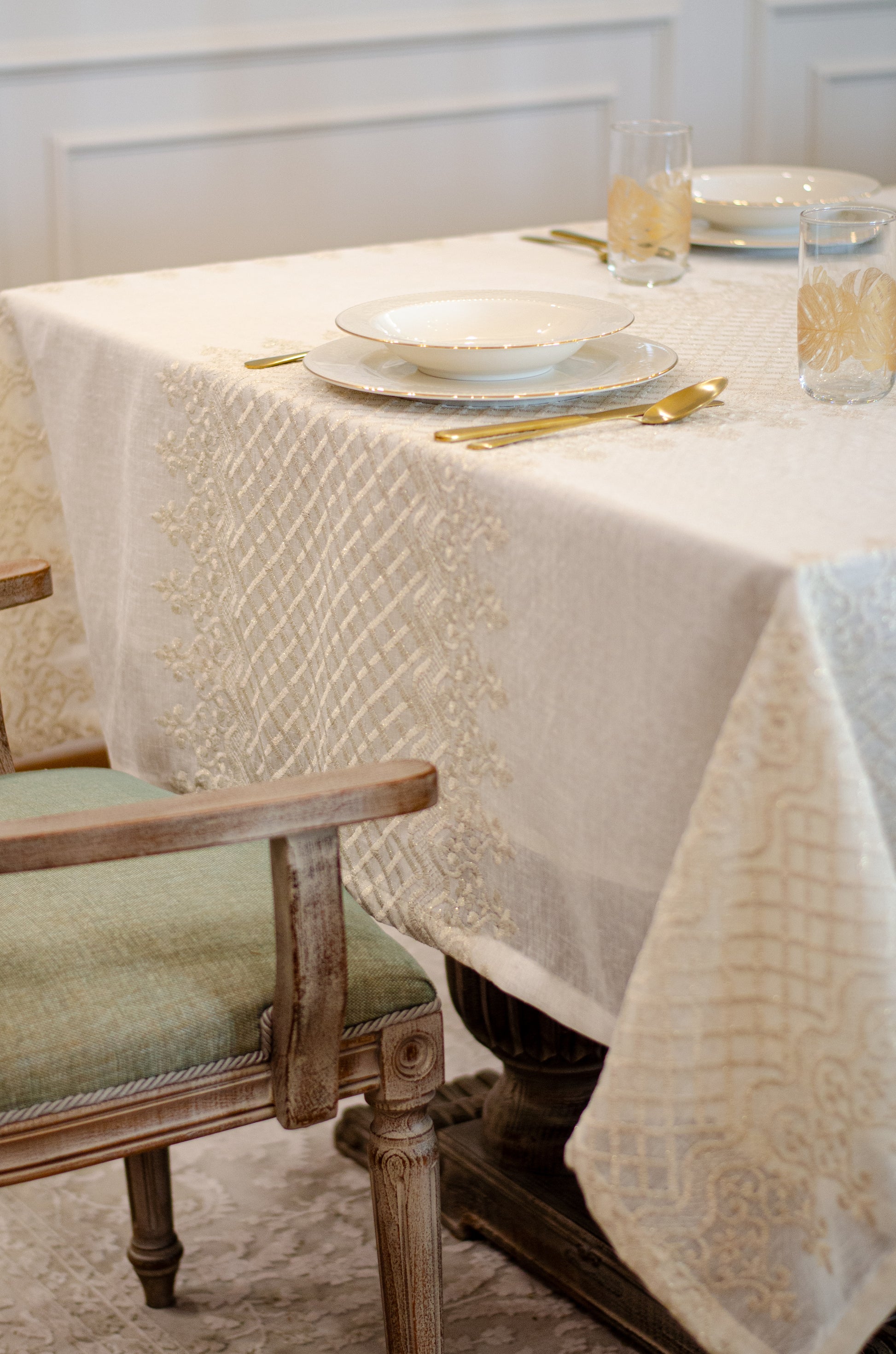 Turn your table into a statement of natural elegance with the Regal Mosaic tablecloth. Crafted from premium linen and embroidered with rich mosaic and damask motif, it blends organic charm with timeless sophistication. Shop now to bring refined beauty and effortless style to your dining space. It is layered with “Linen” tablecloth underneath, but it is sold separately.