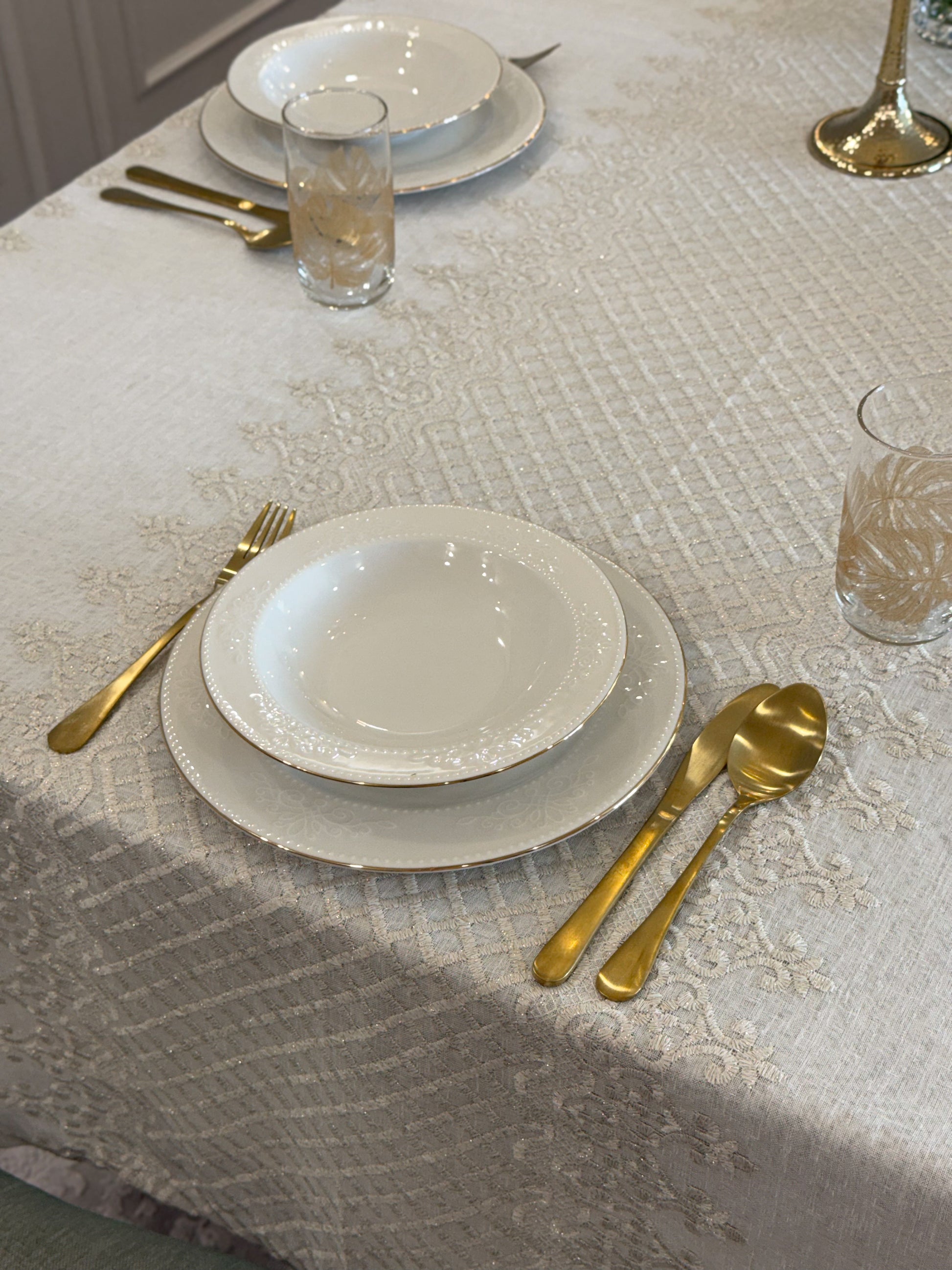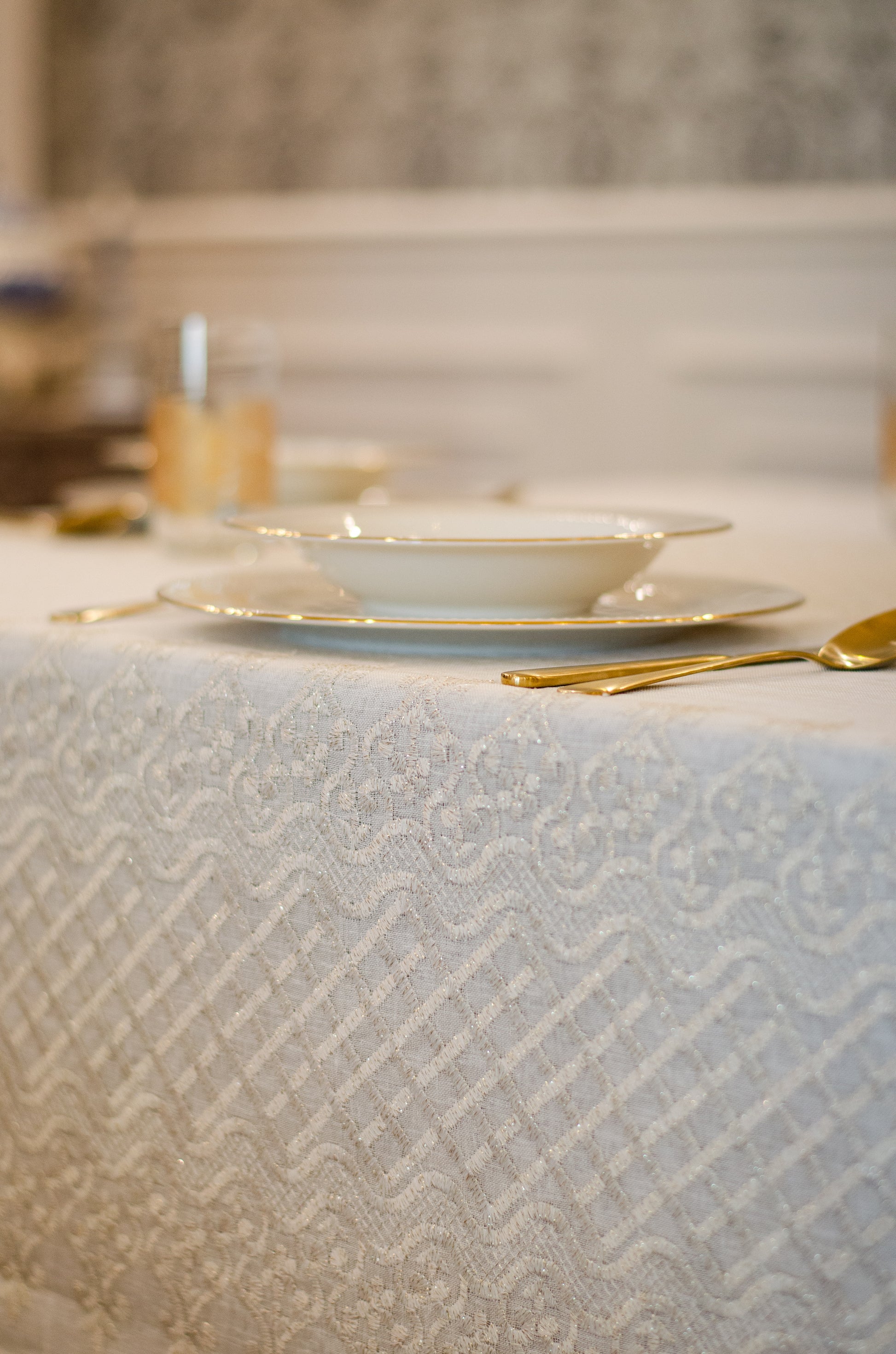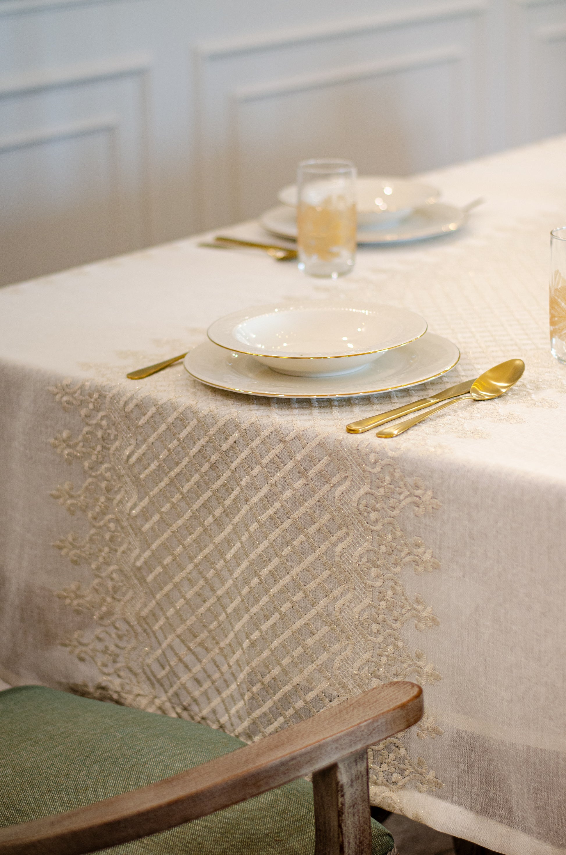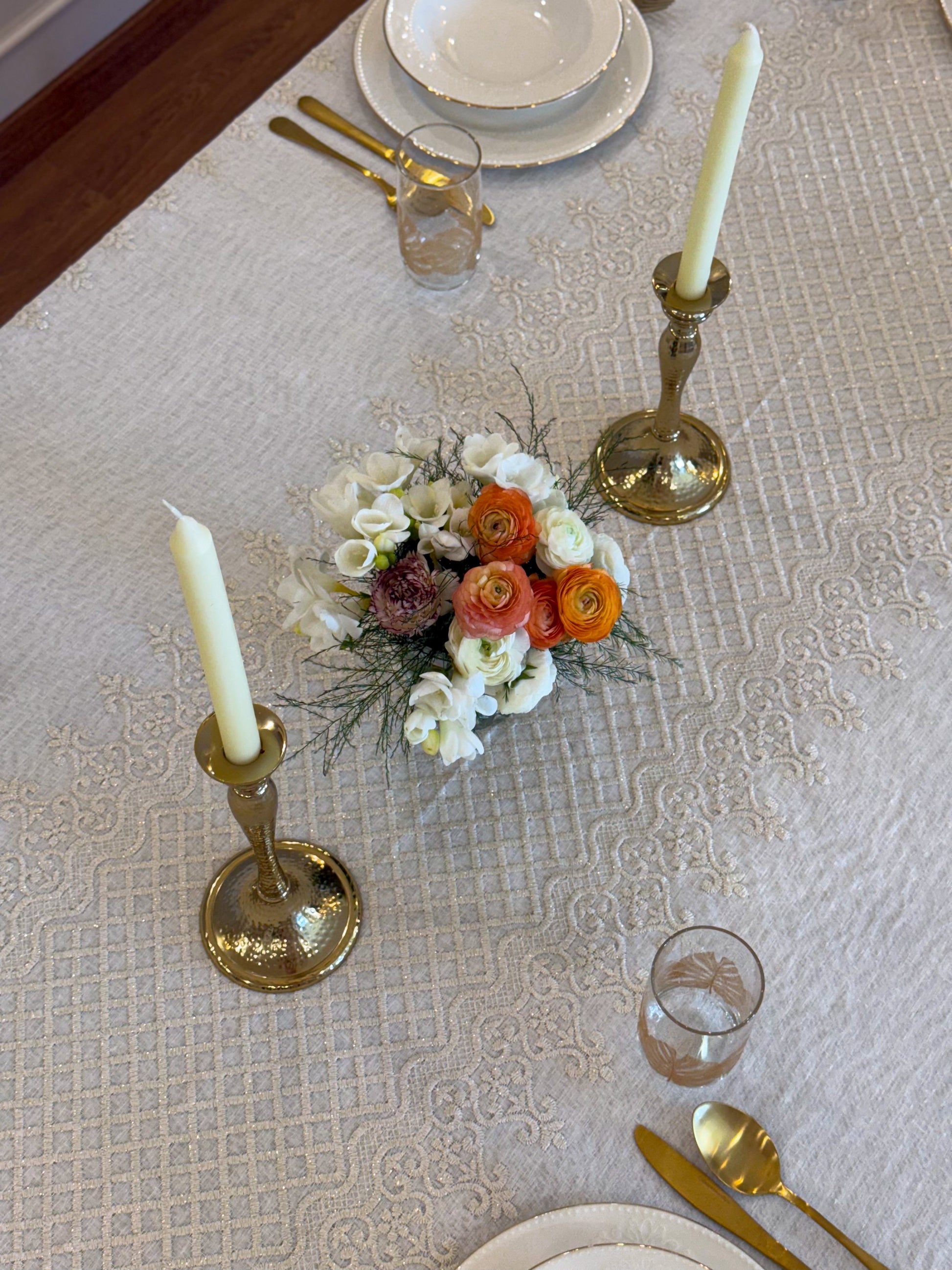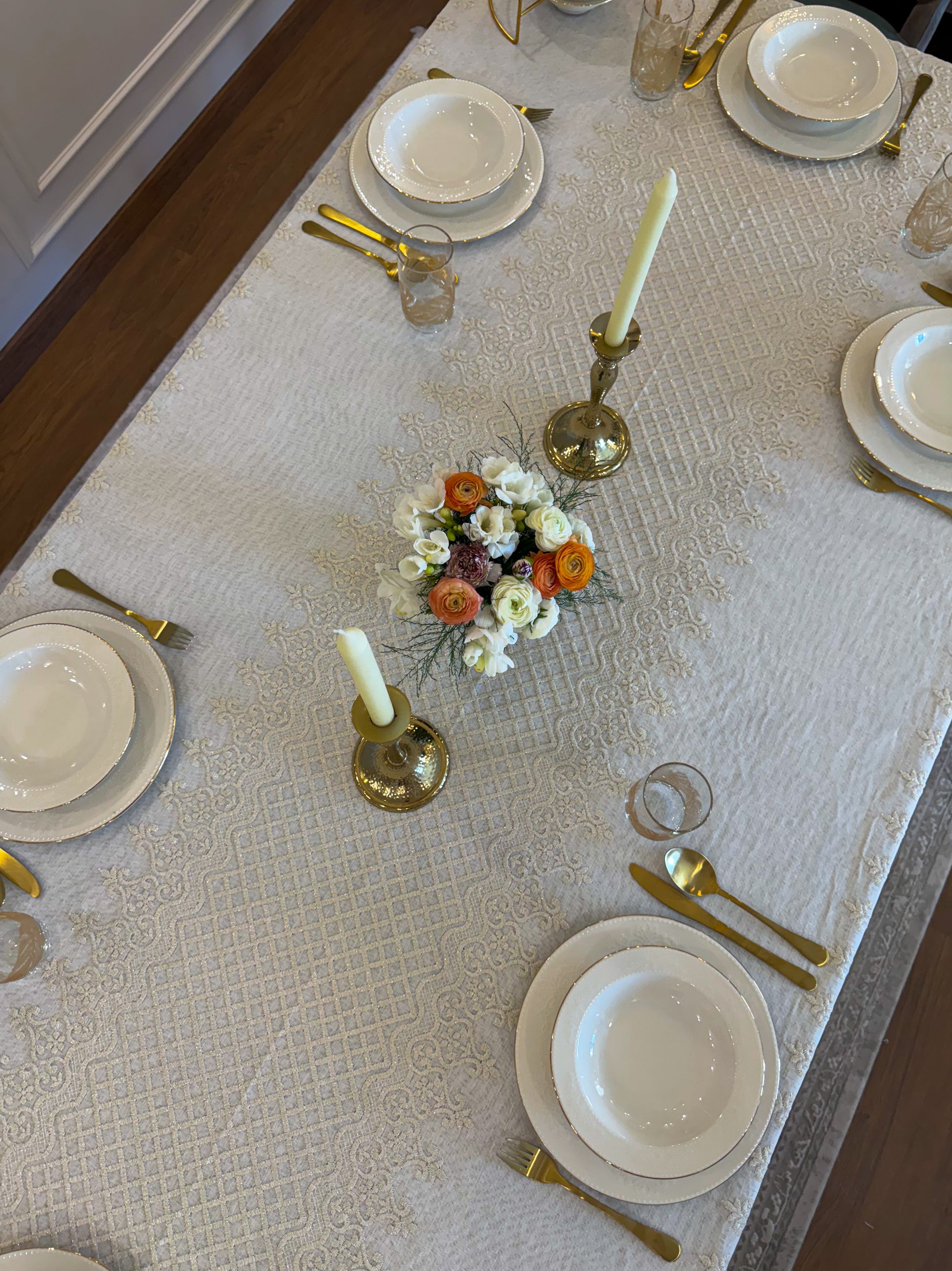 Turn your table into a statement of natural elegance with the Regal Mosaic tablecloth. Crafted from premium linen and embroidered with rich mosaic and damask motif, it blends organic charm with timeless sophistication. Shop now to bring refined beauty and effortless style to your dining space. It is layered with “Linen” tablecloth underneath, but it is sold separately.