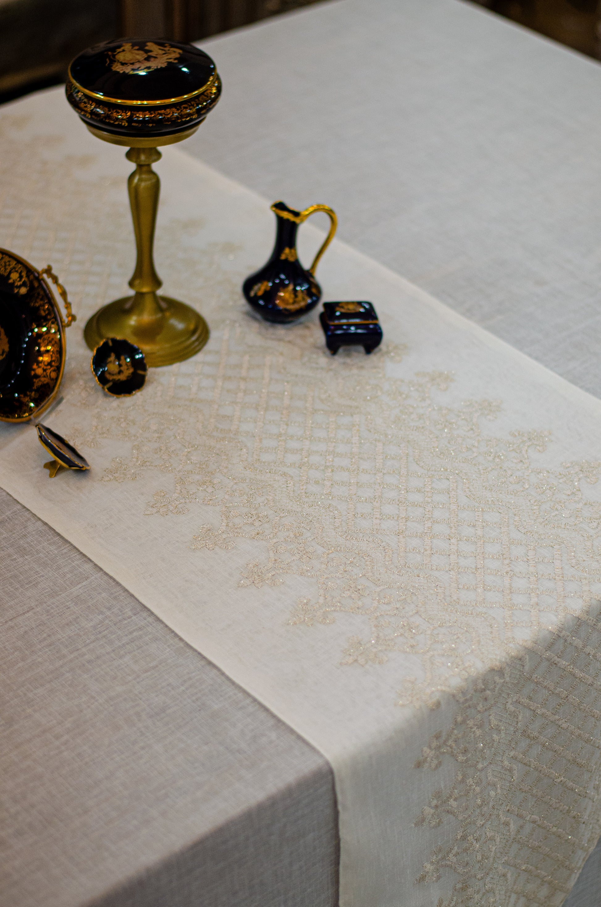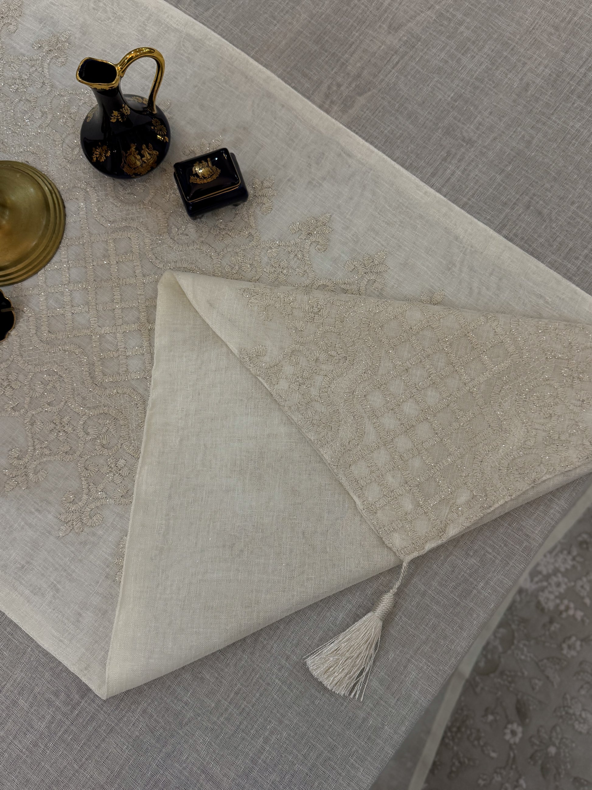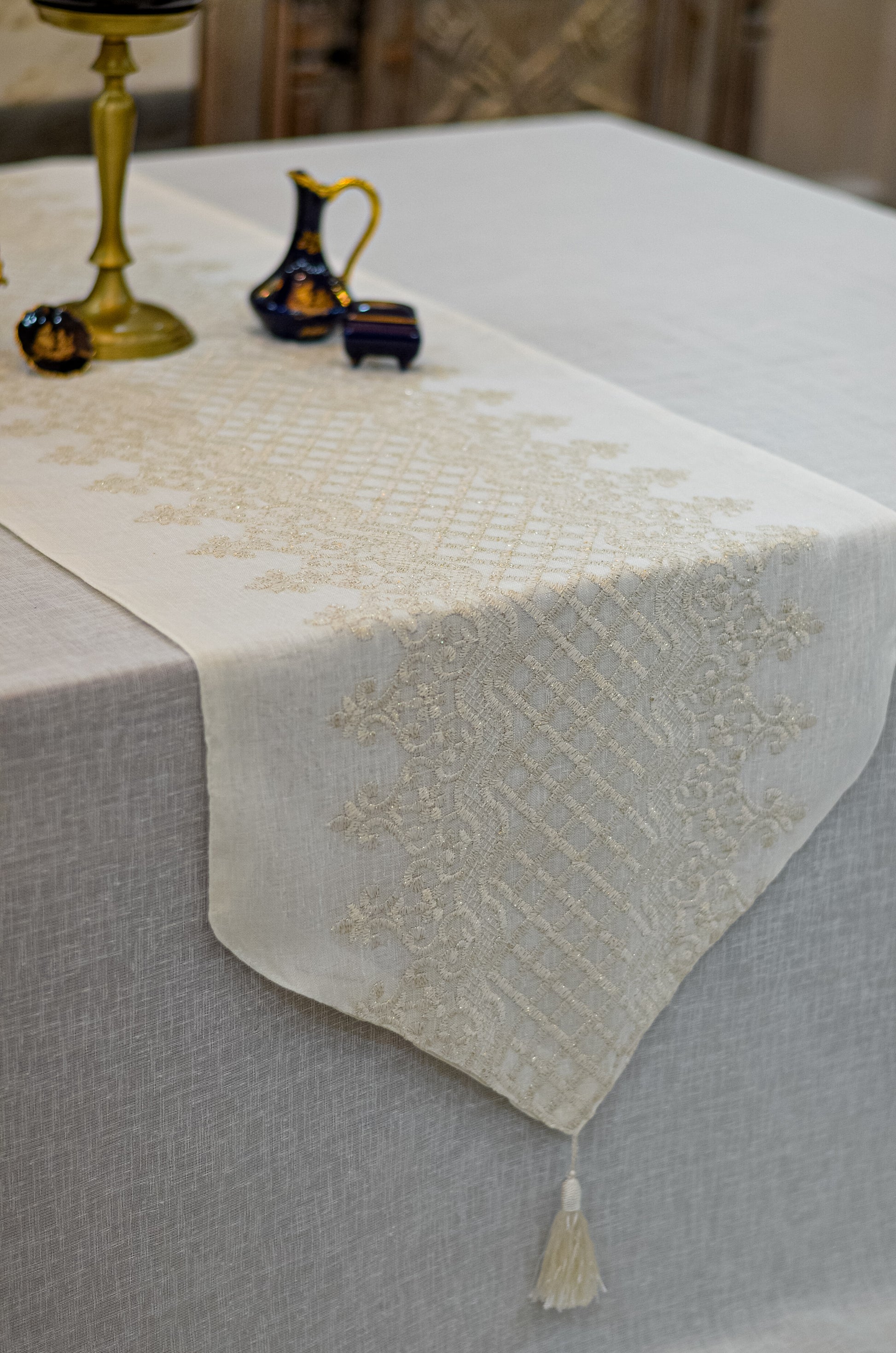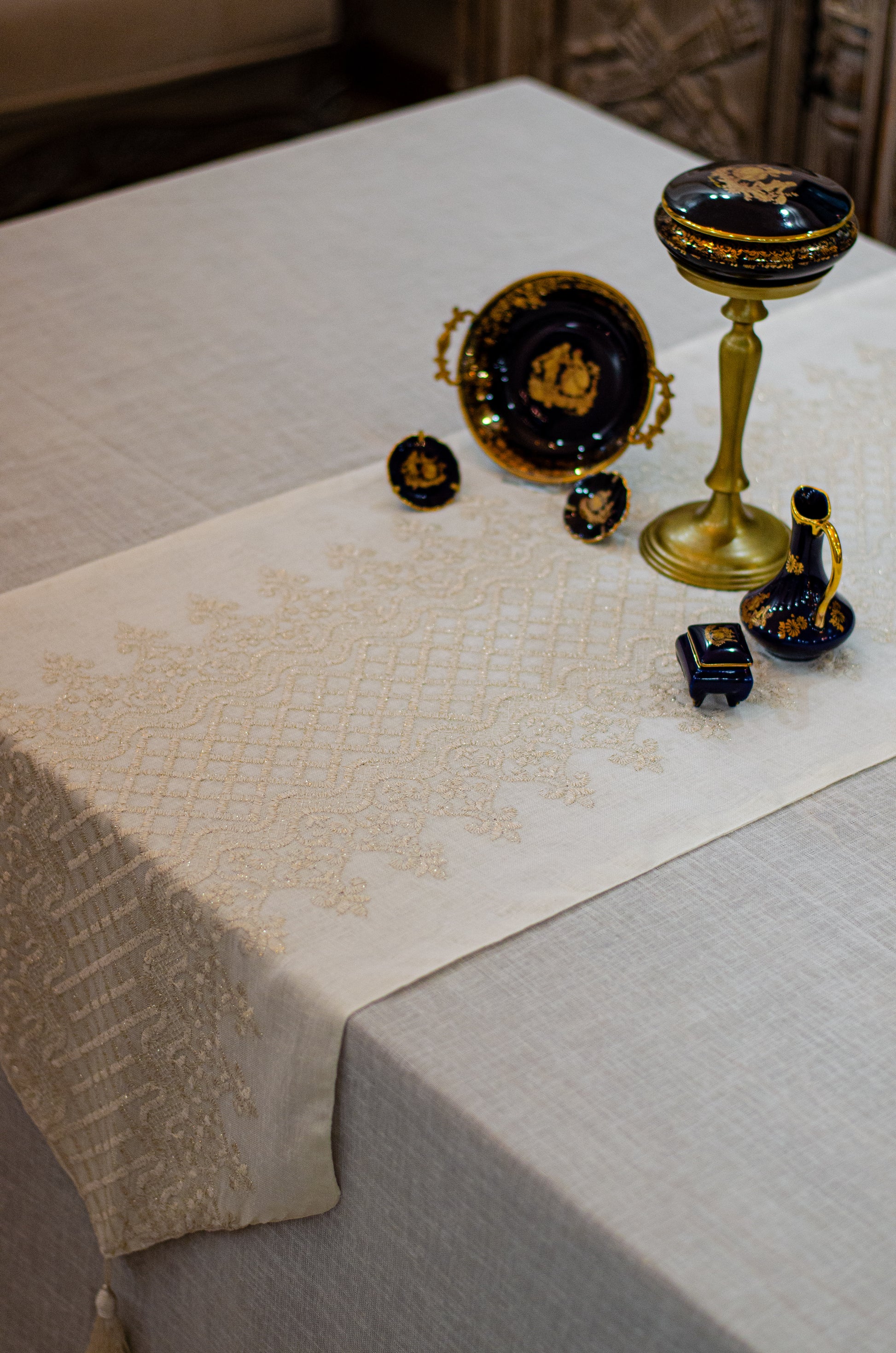 Turn your table into a statement of natural elegance with the Regal Mosaic table runner from Élégance Des Tables. Crafted from premium linen and embroidered with rich mosaic and damask motif, it blends organic charm with timeless sophistication. Shop now to bring refined beauty and effortless style to your dining space.