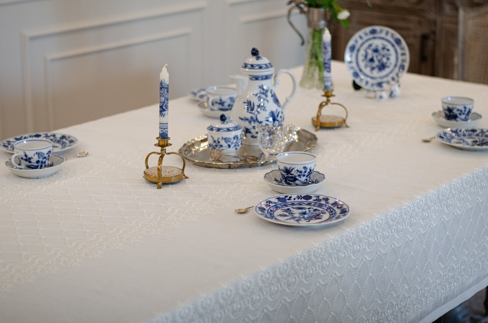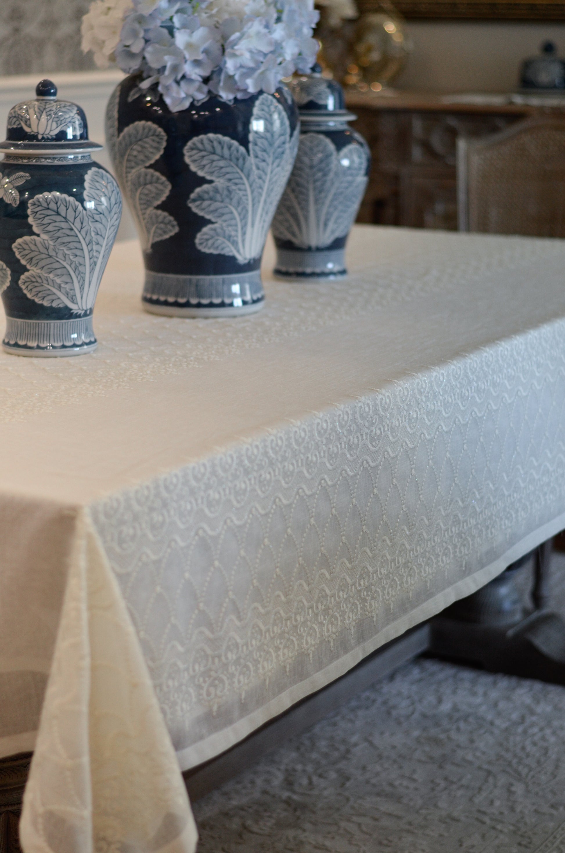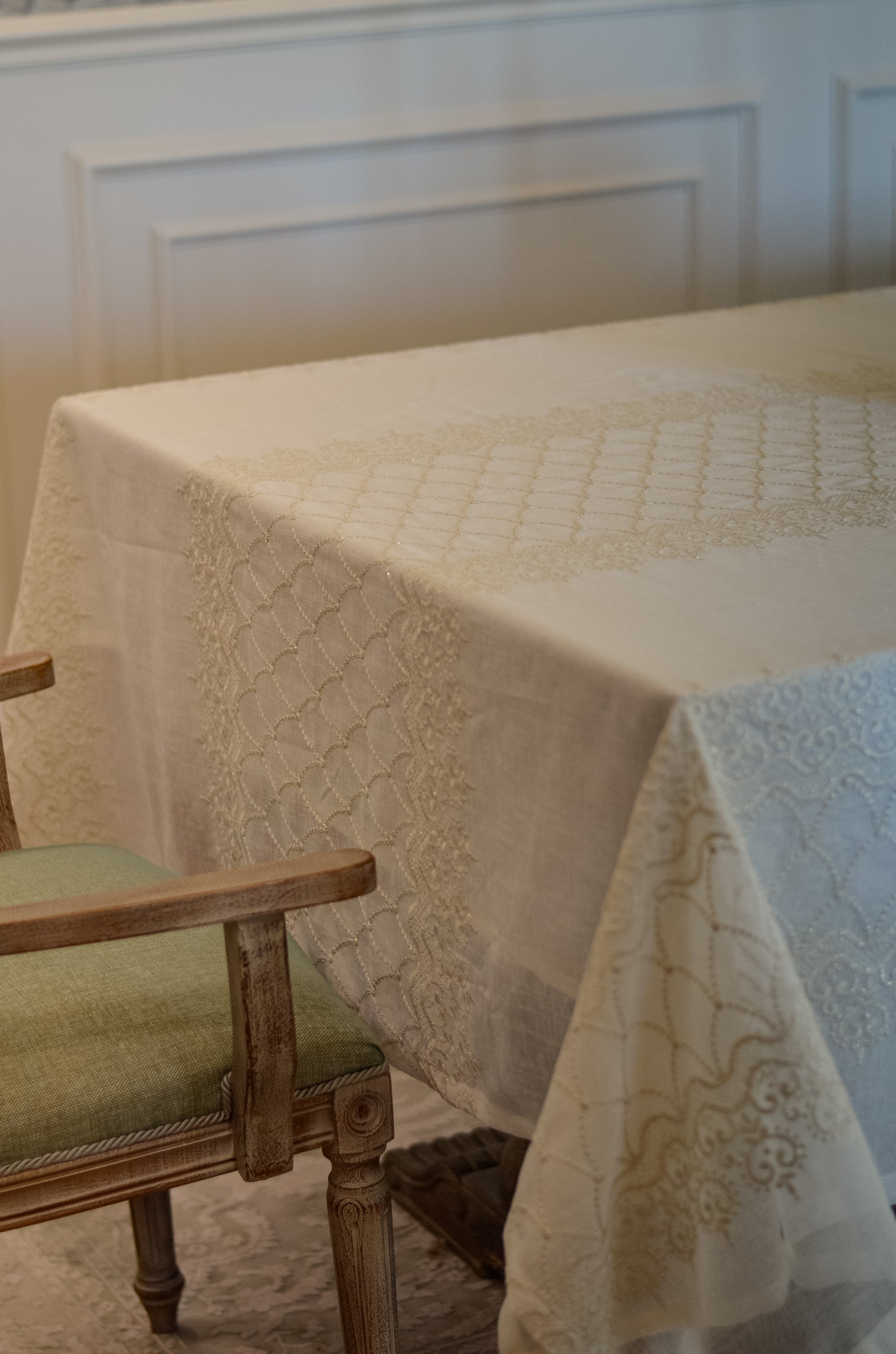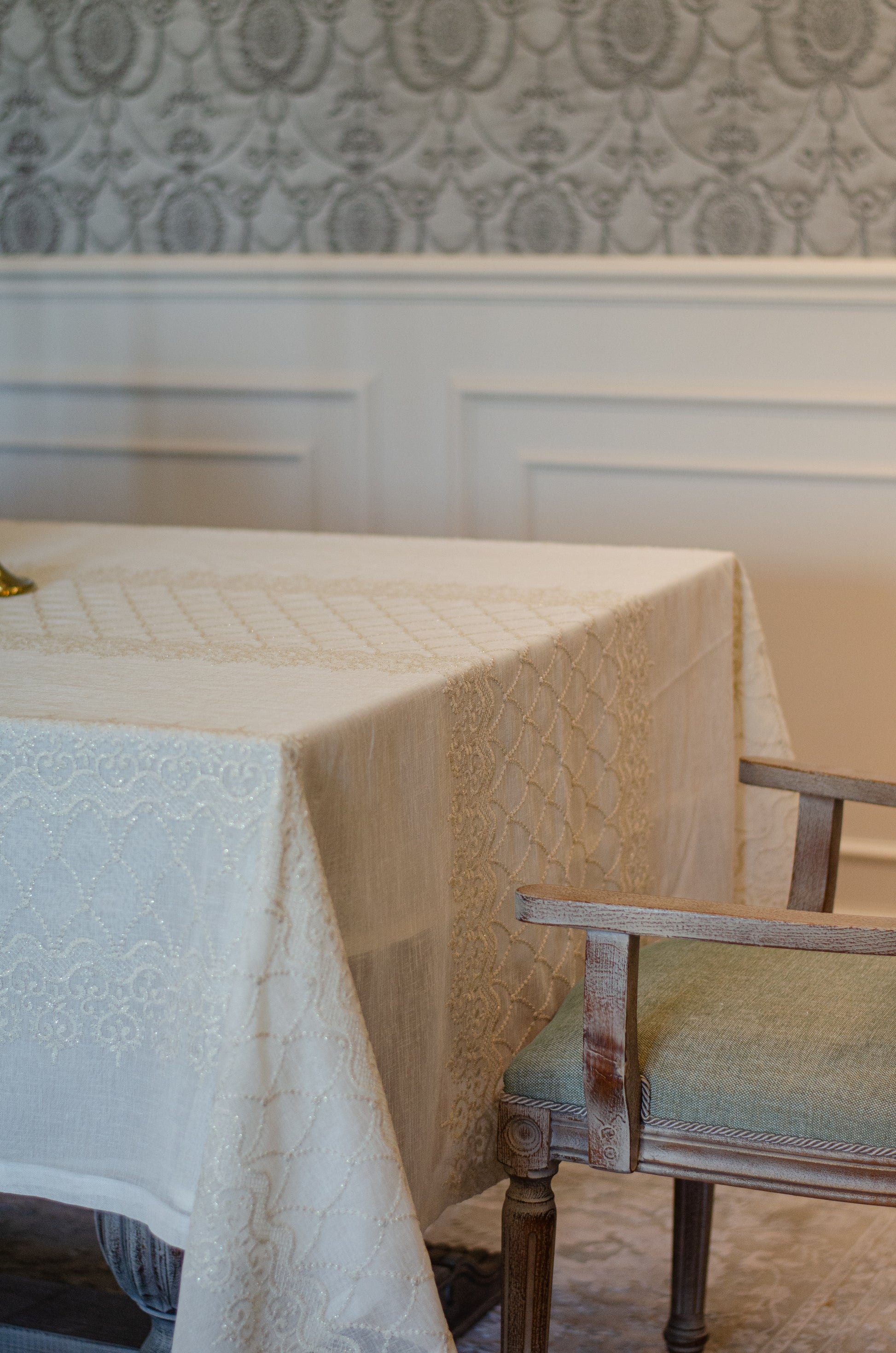 Turn your table into a statement of natural elegance with the Regal Lace tablecloth from Élégance Des Tables. Crafted from premium linen and embroidered with rich lace pattern, it blends organic charm with timeless sophistication. Shop now to bring refined beauty and effortless style to your dining space. It is layered with “Linen” tablecloth underneath, but it is sold separately.