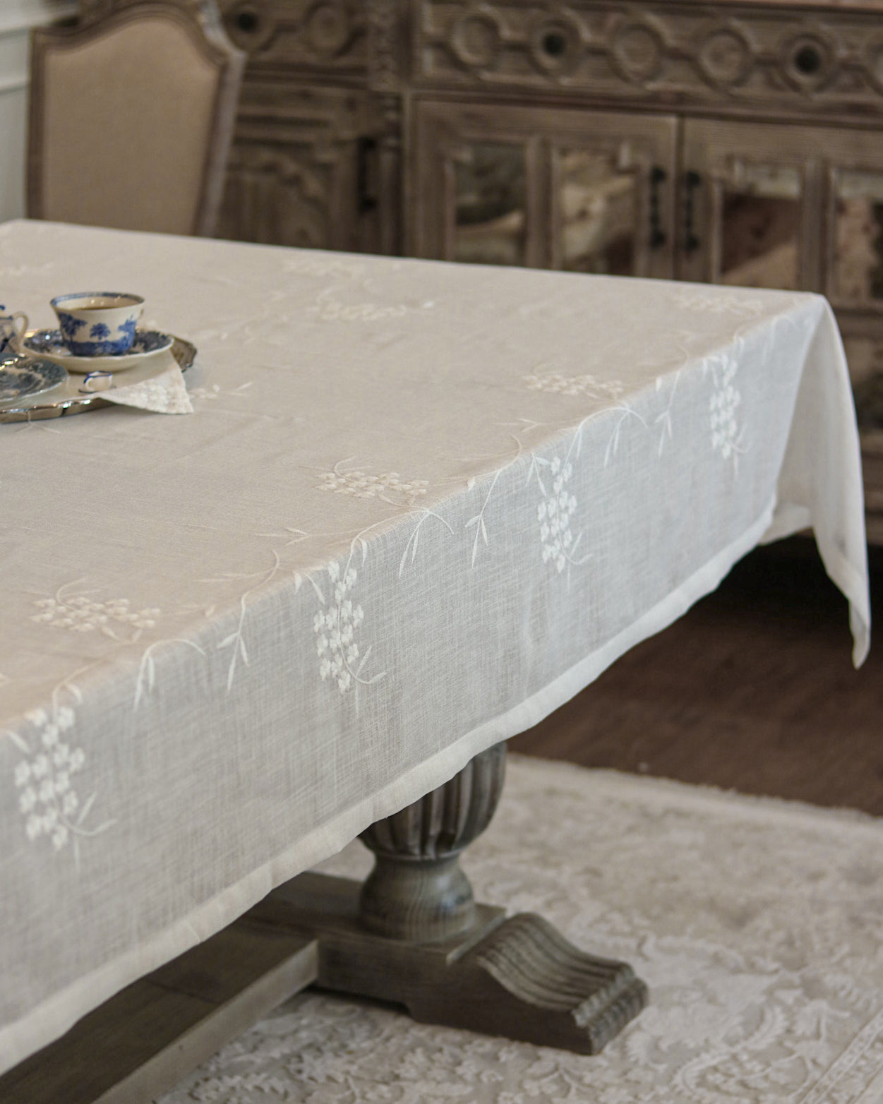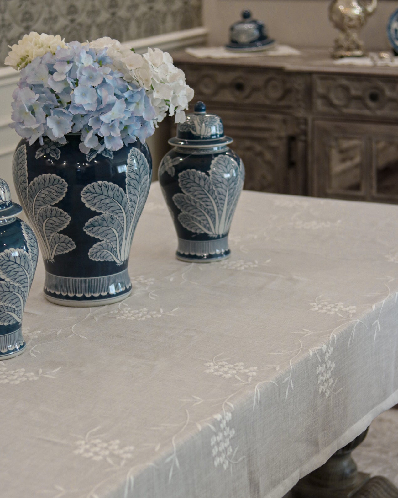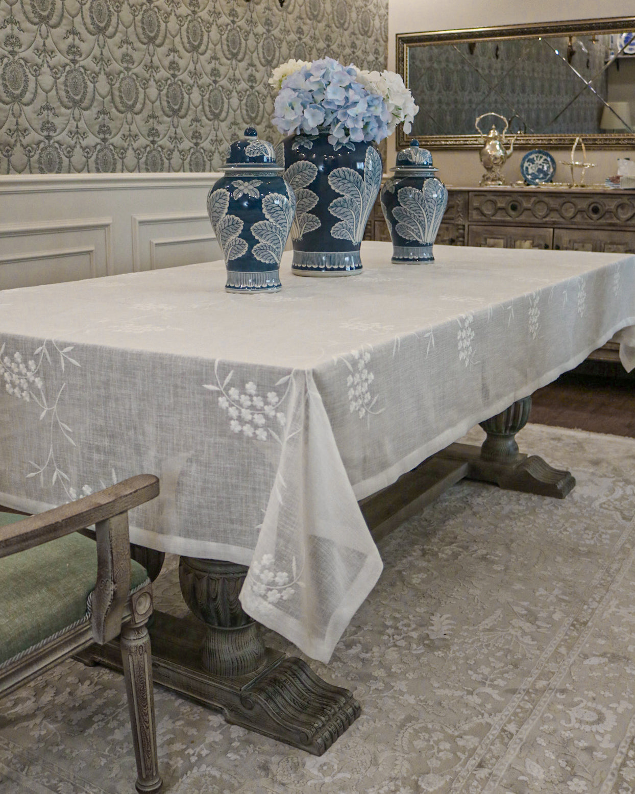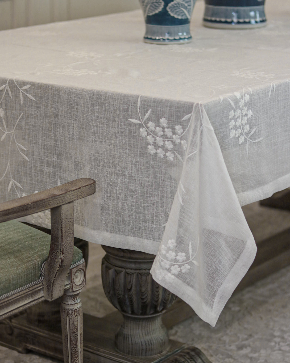 Fleur... a tablecloth meant to transform your table into a year-round summer escape. This floral-embroidered masterpiece adds a touch of simple elegance to any dining setting, capturing the essence of a blooming garden. Perfect for both casual and formal occasions, the Fleur tablecloth brings a fresh, vibrant look to your dining room decor. Shop now to elevate your home with this beautiful, timeless piece.