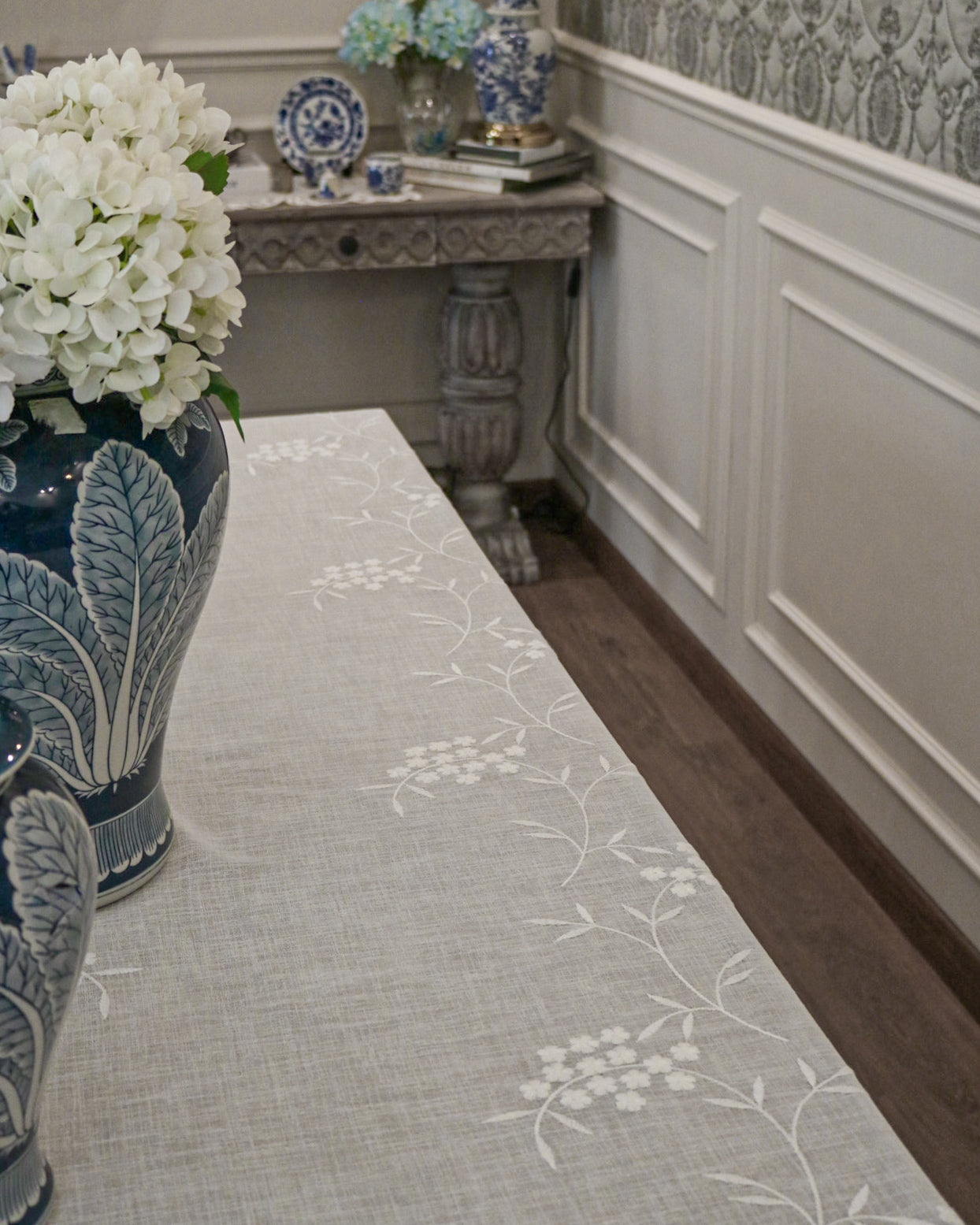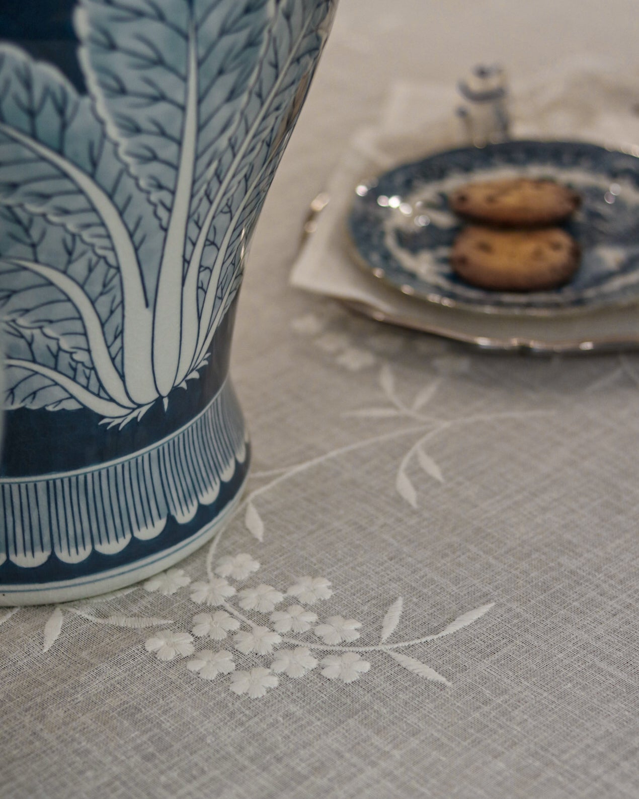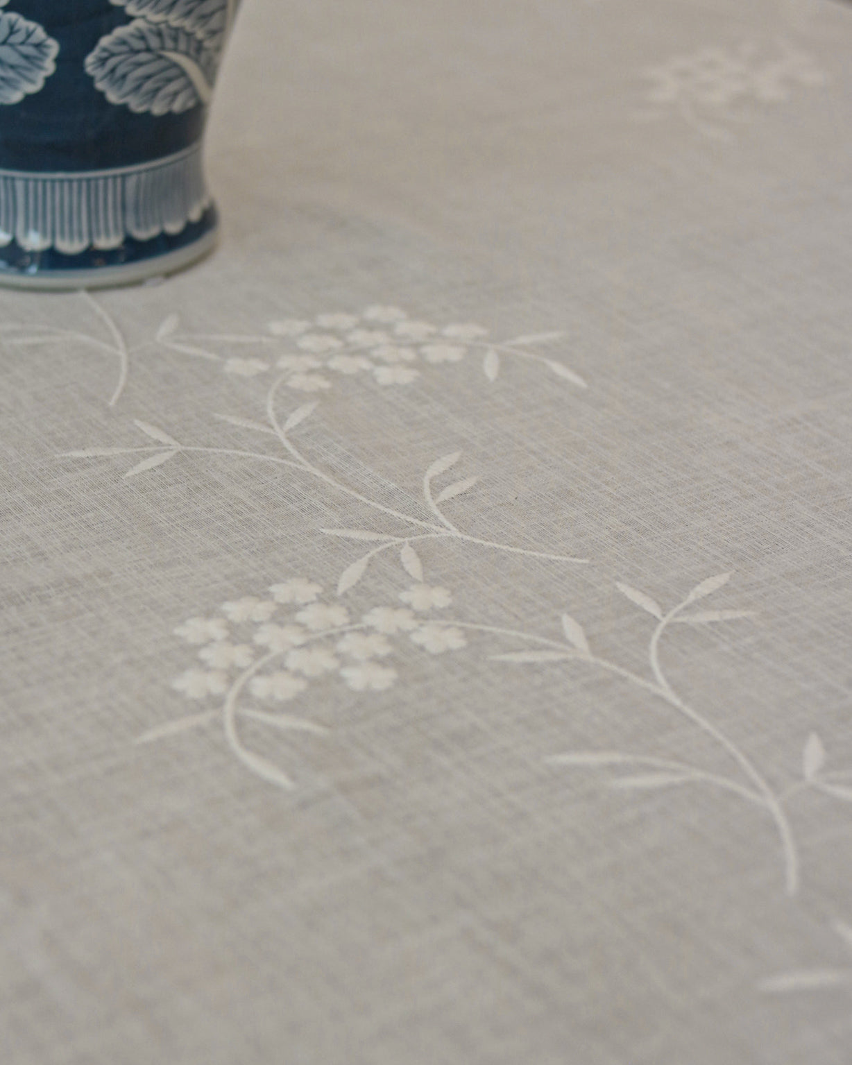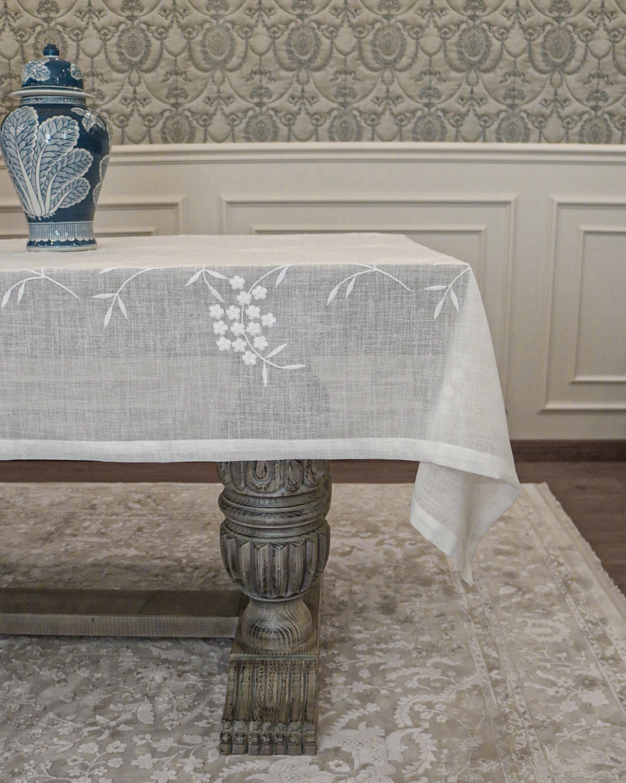 Fleur... a tablecloth meant to transform your table into a year-round summer escape. This floral-embroidered masterpiece adds a touch of simple elegance to any dining setting, capturing the essence of a blooming garden. Perfect for both casual and formal occasions, the Fleur tablecloth brings a fresh, vibrant look to your dining room decor. Shop now to elevate your home with this beautiful, timeless piece.