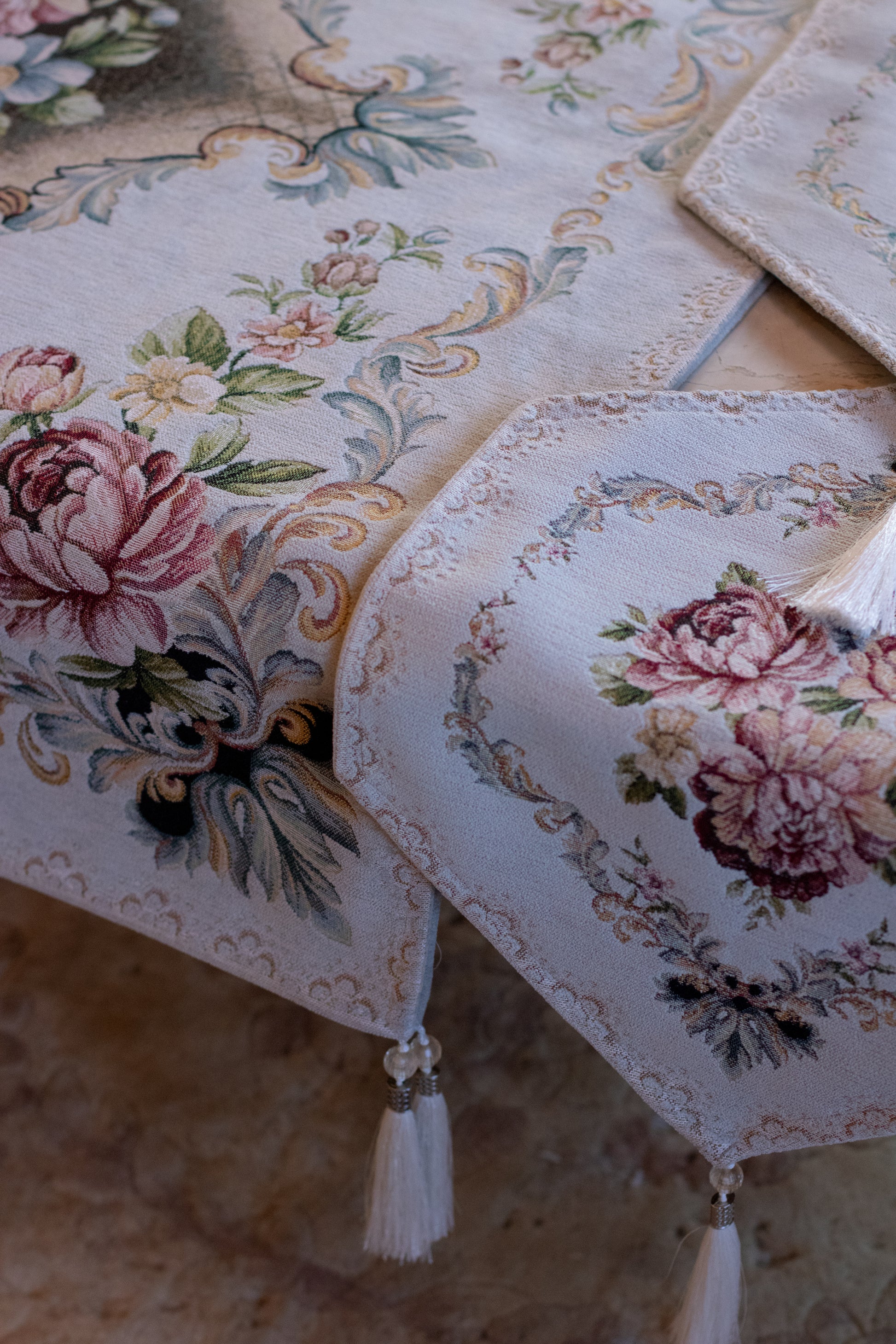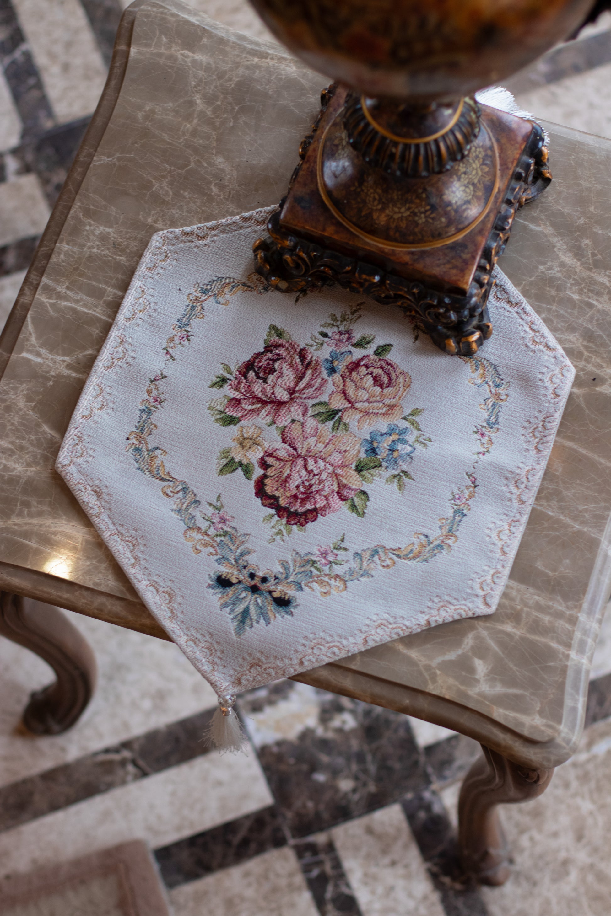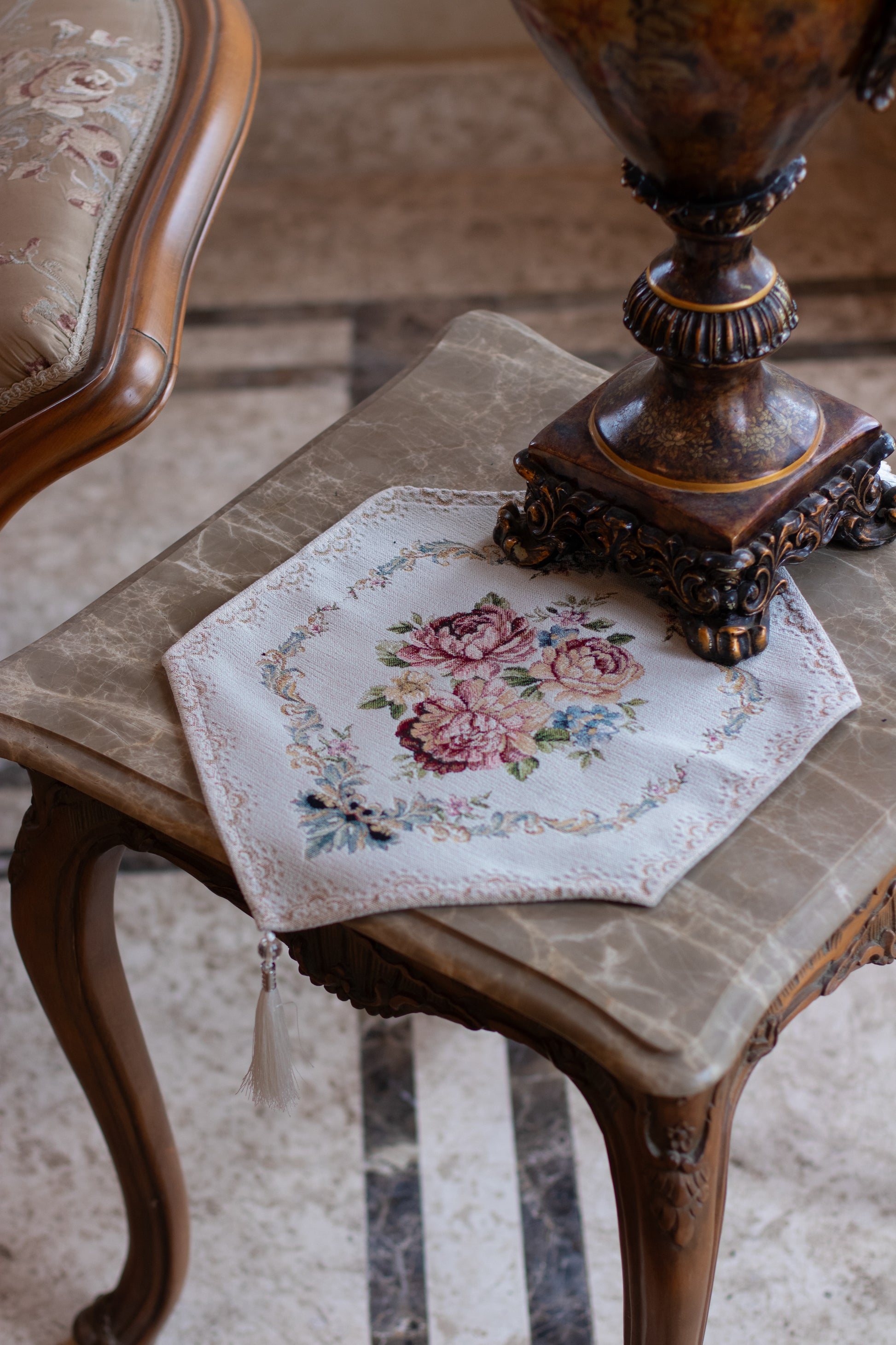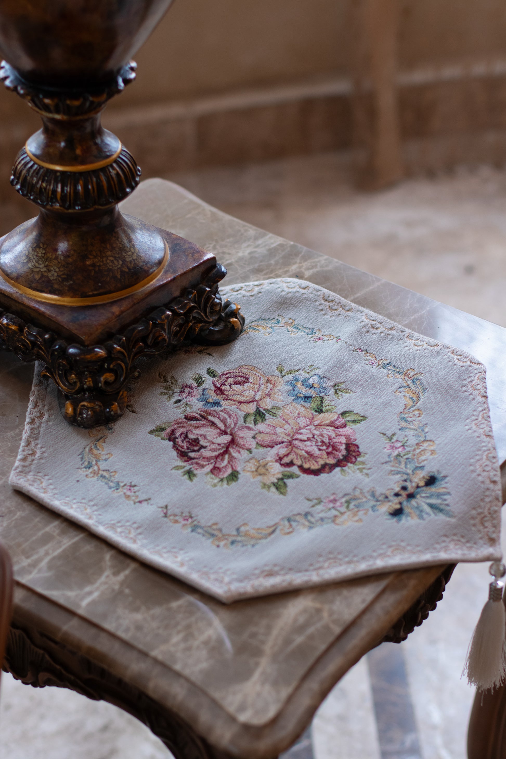 Add a touch of refined charm to your home with the Roses Bouquet set from Élégance Des Tables. Featuring an elegant floral bouquet in the center, this gobelin-crafted set will bring sophistication to consoles, side tables, and dining settings, offering a decorative flourish that blends tradition with timeless style.