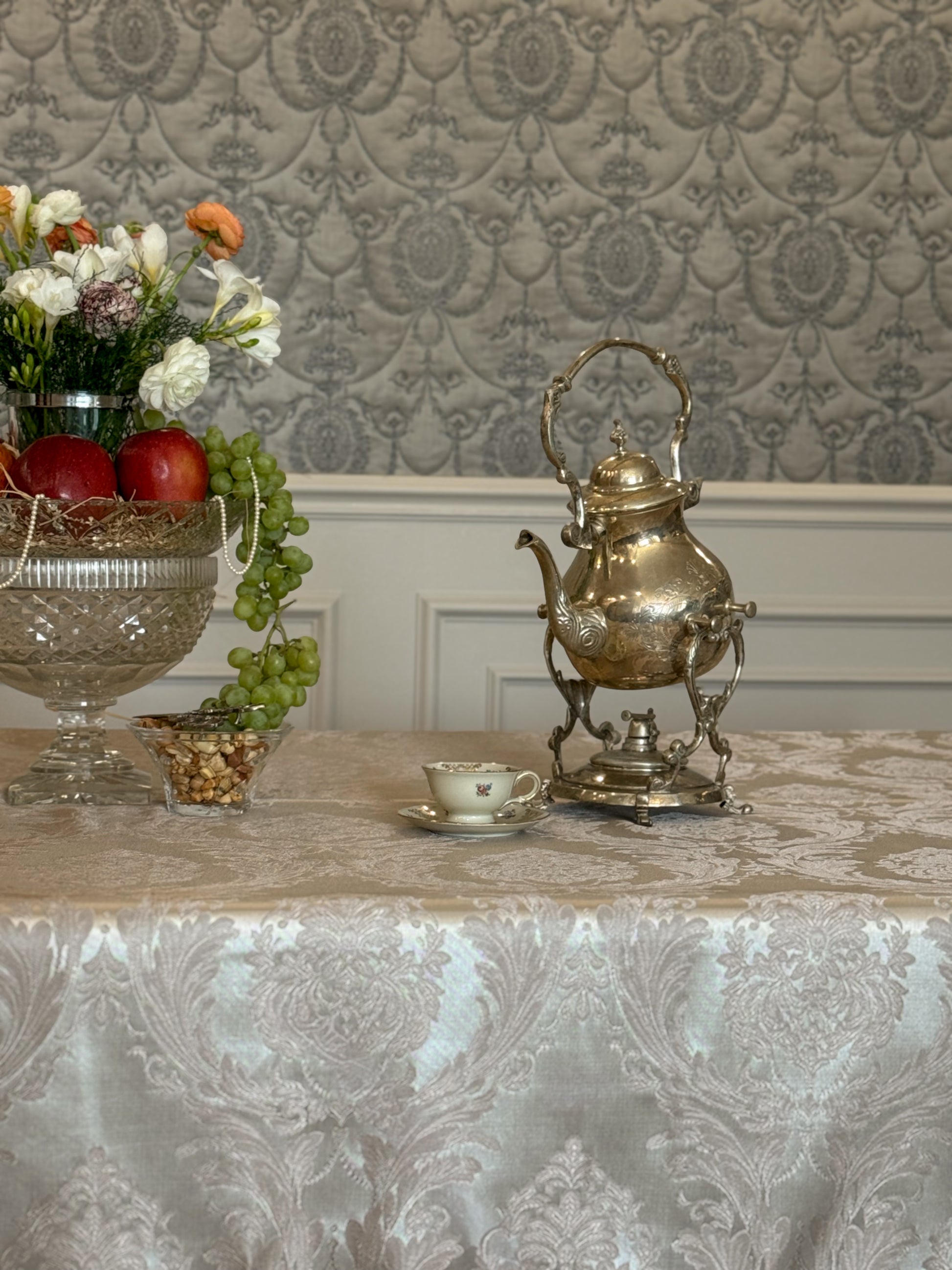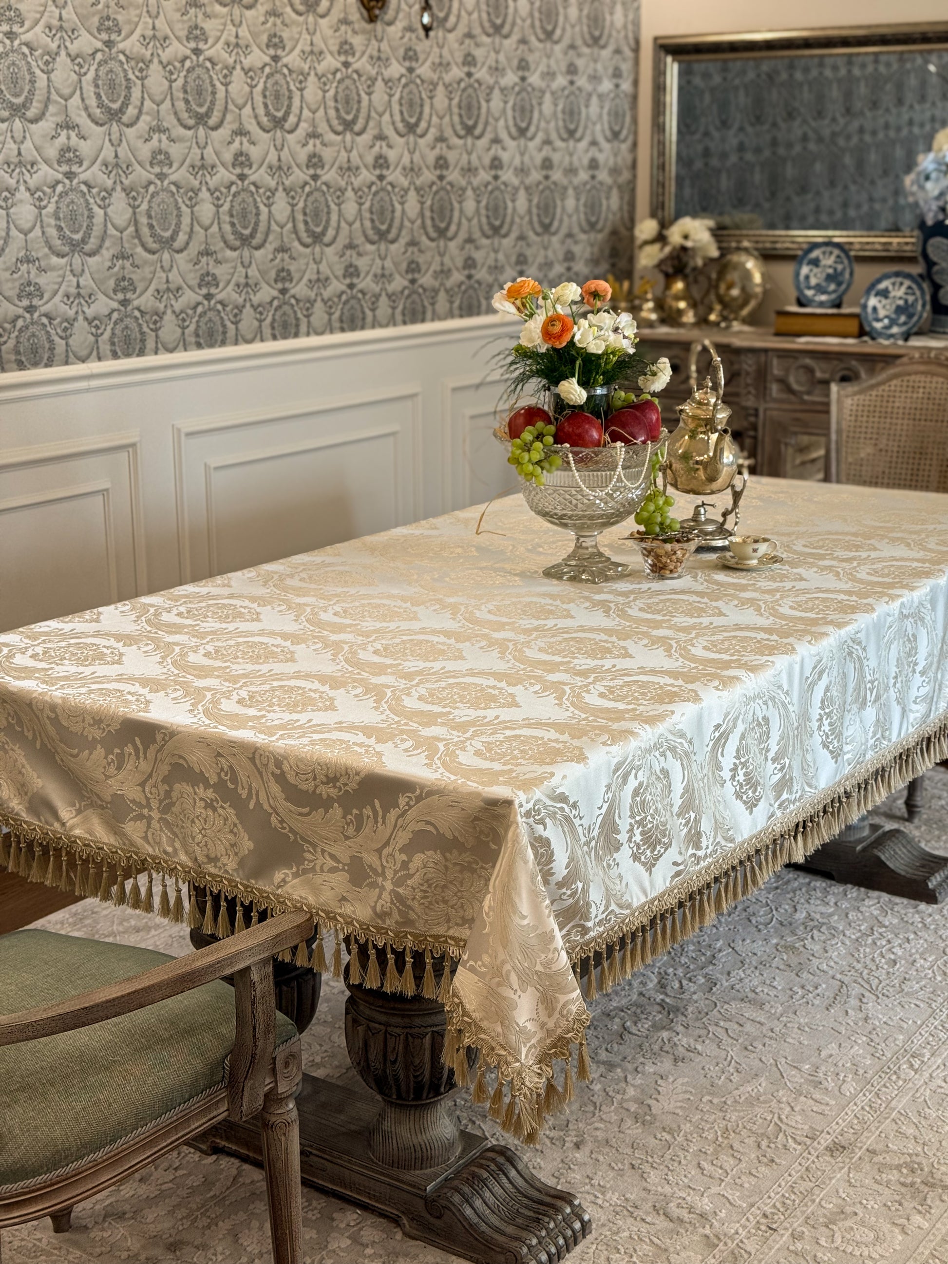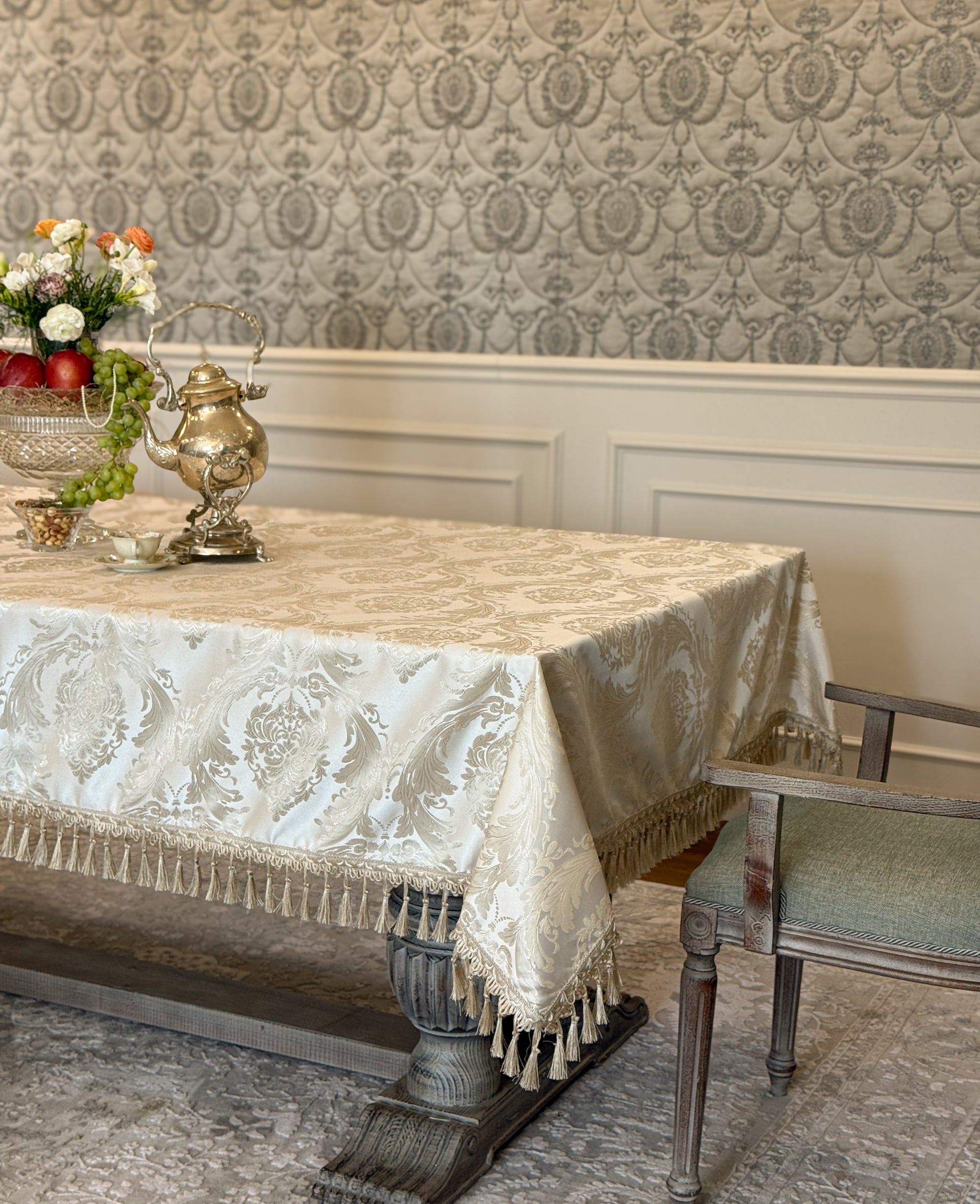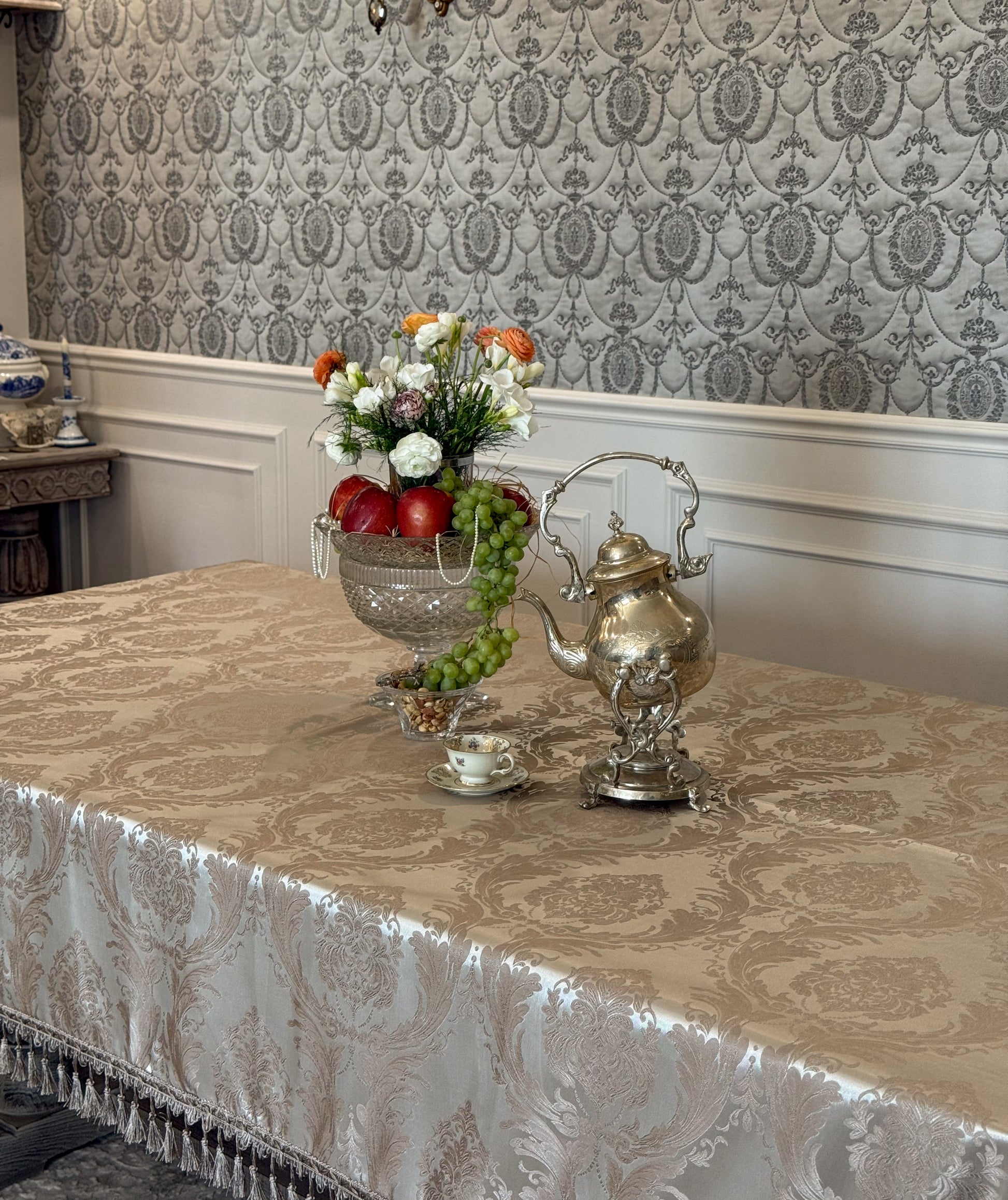 Transform your table decor with the Imperial Grace tablecloth. Inspired by traditional Arabesque motifs, this tablecloth showcases rich, intricate designs that add timeless sophistication to any setting. Shop this exquisite, high-quality tablecloth to elevate your table arrangements.