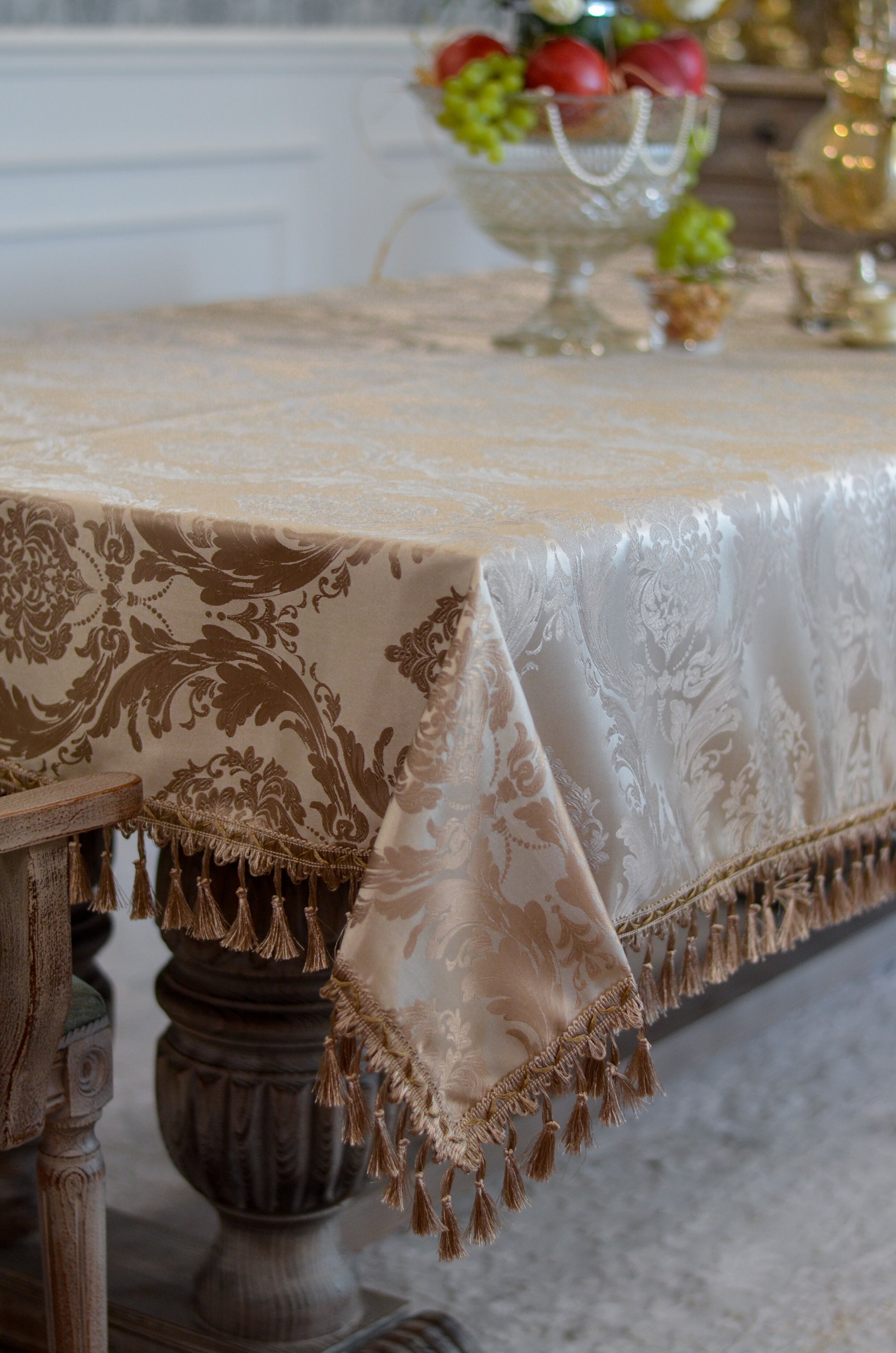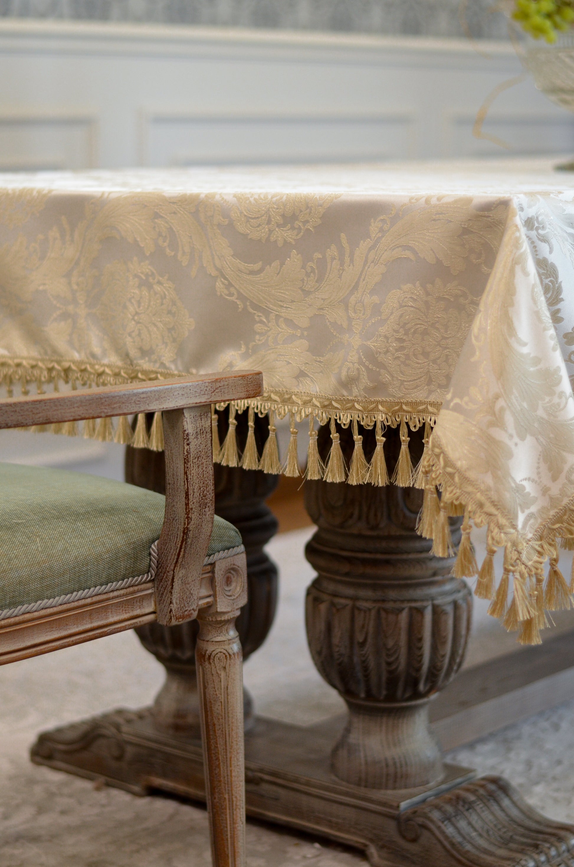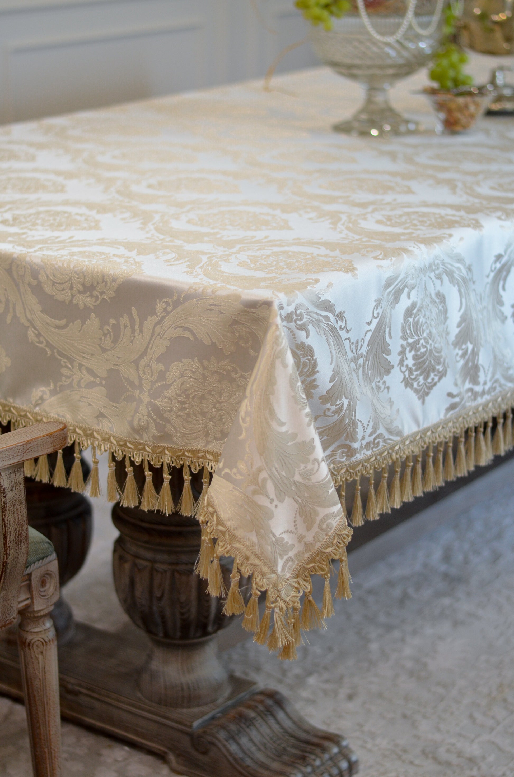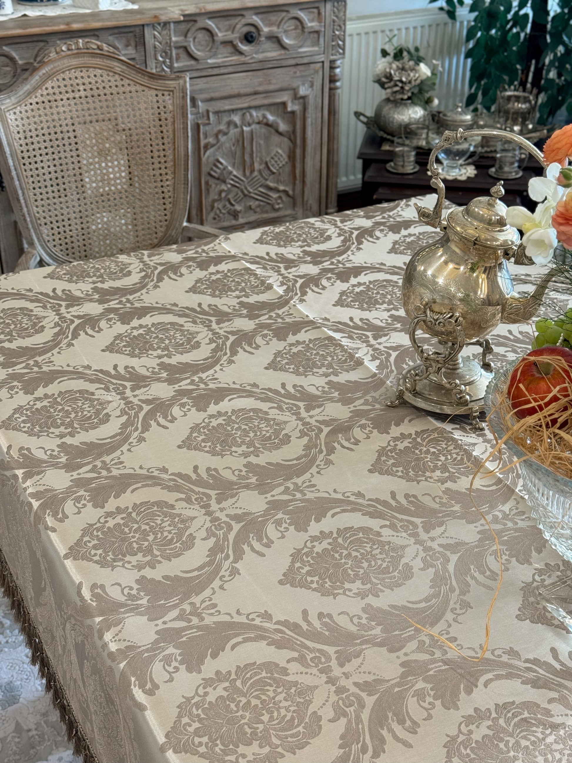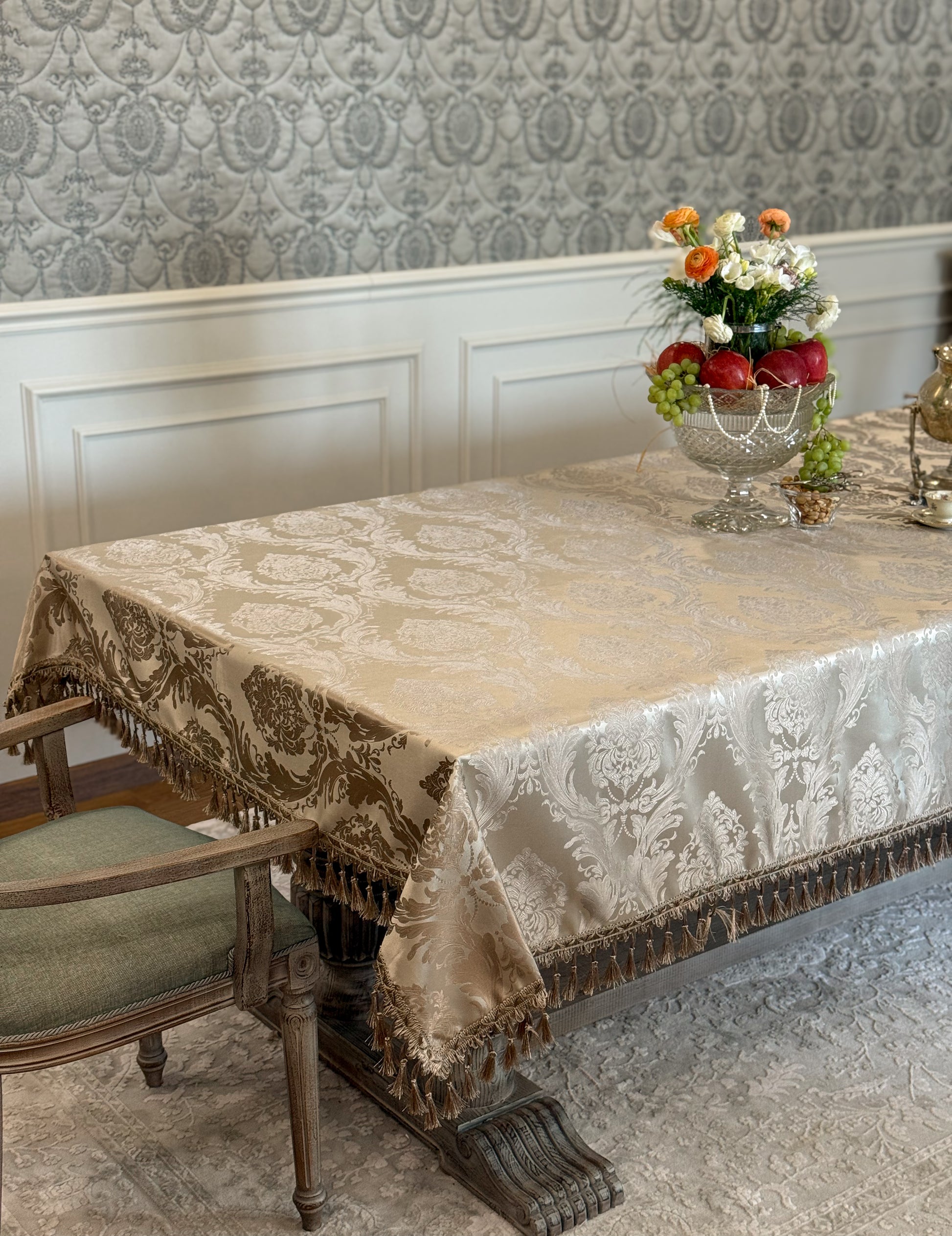 Transform your table decor with the Imperial Grace tablecloth. Inspired by traditional Arabesque motifs, this tablecloth showcases rich, intricate designs that add timeless sophistication to any setting. Shop this exquisite, high-quality tablecloth to elevate your table arrangements.