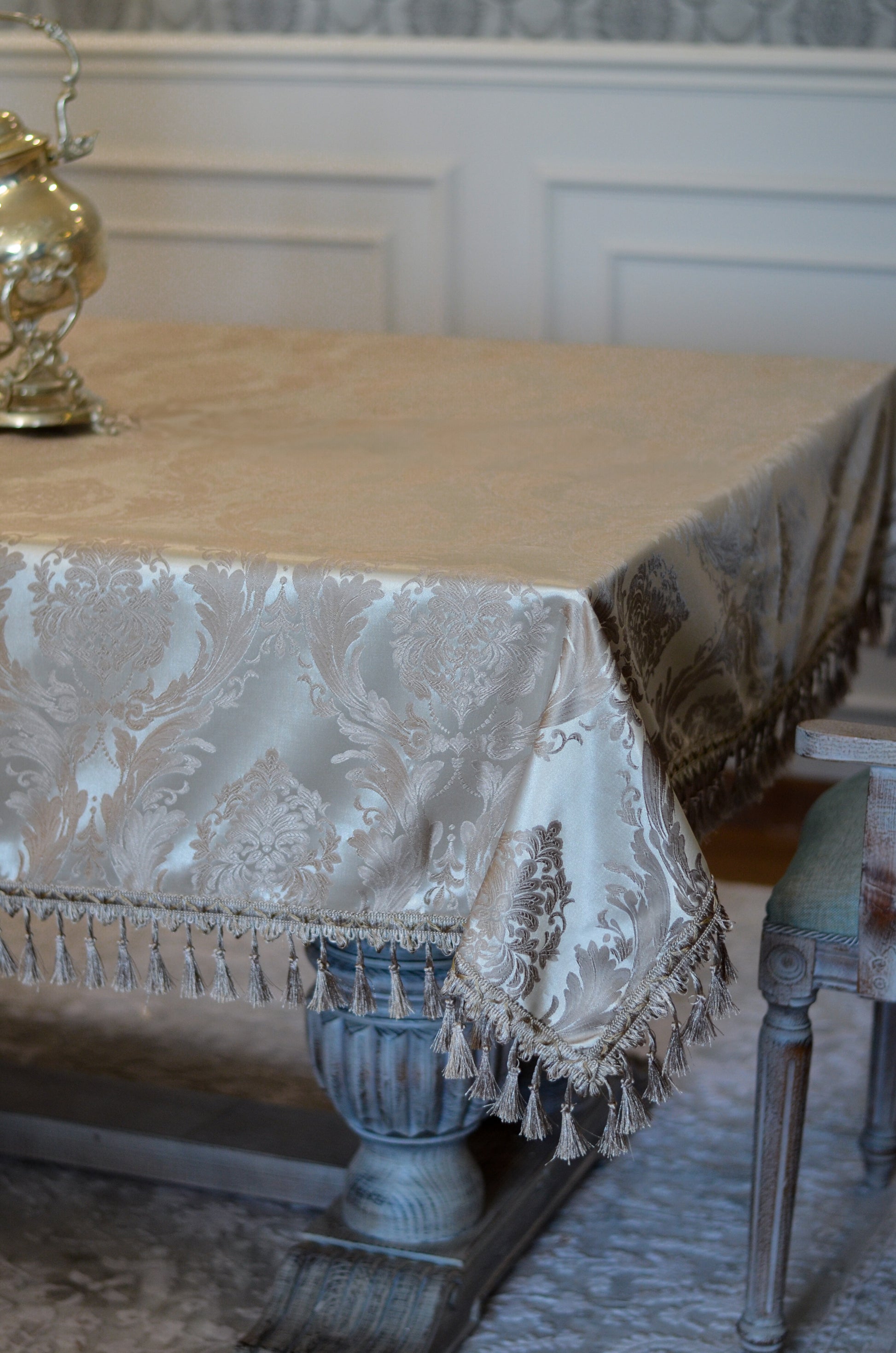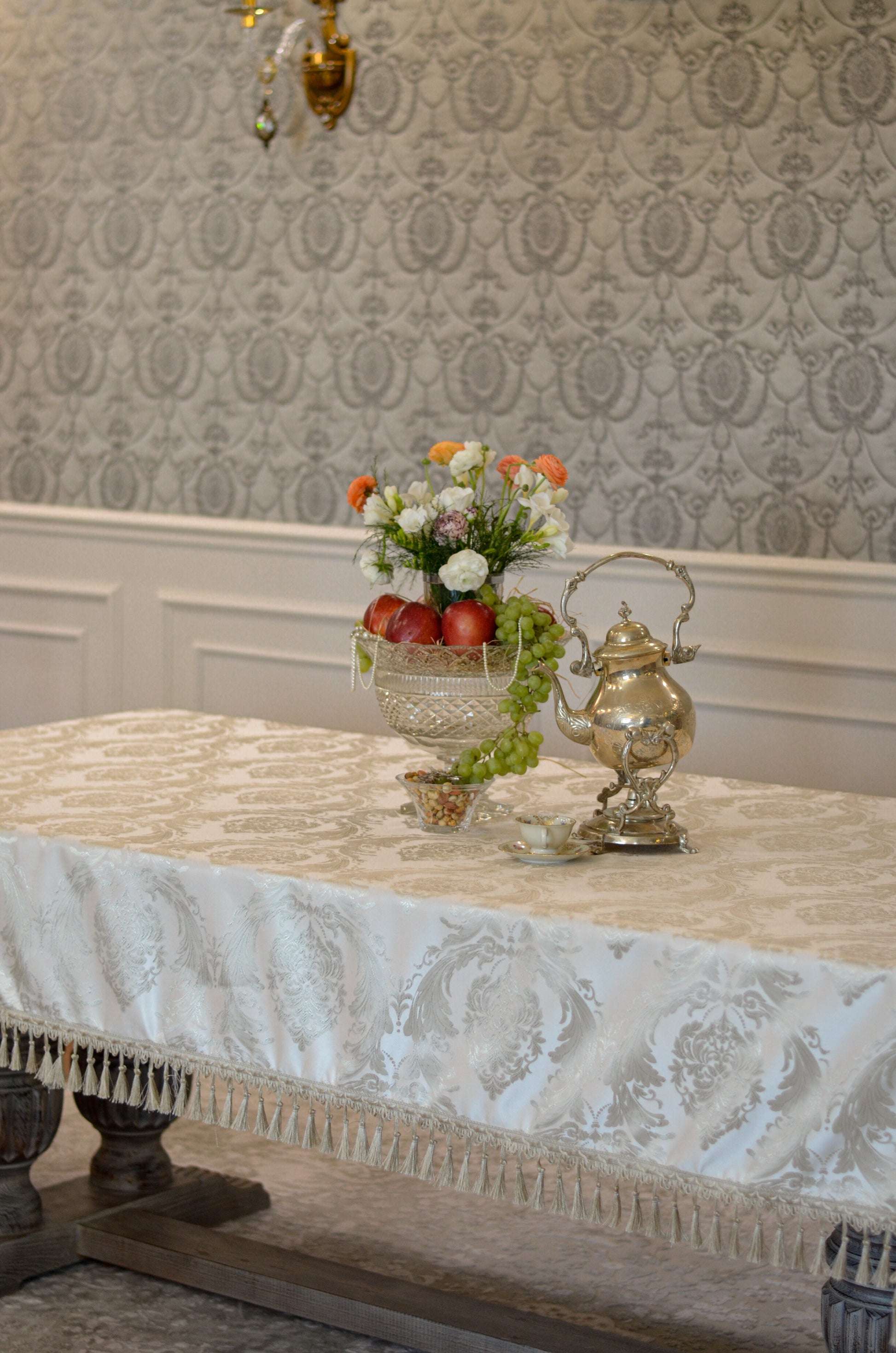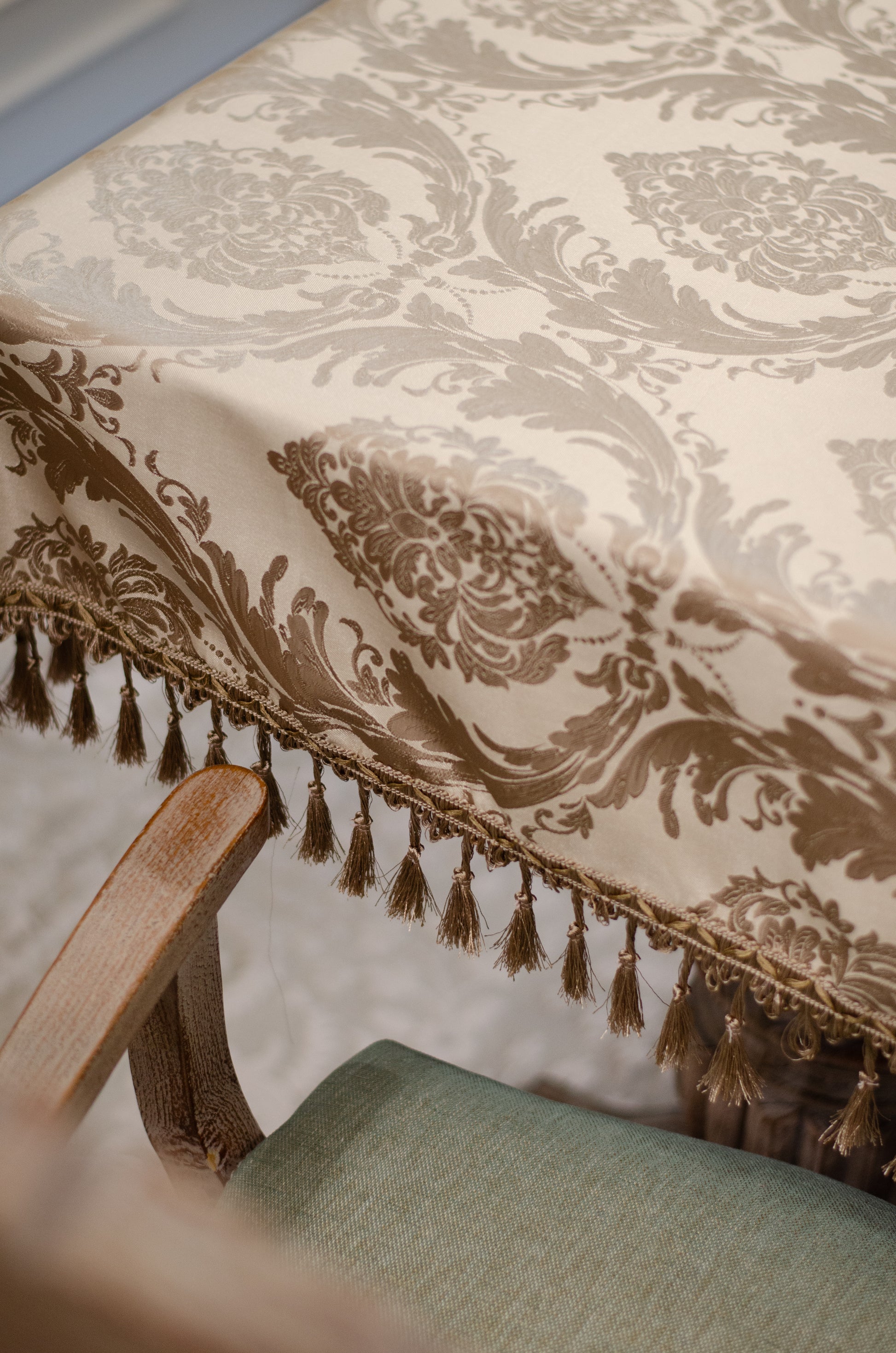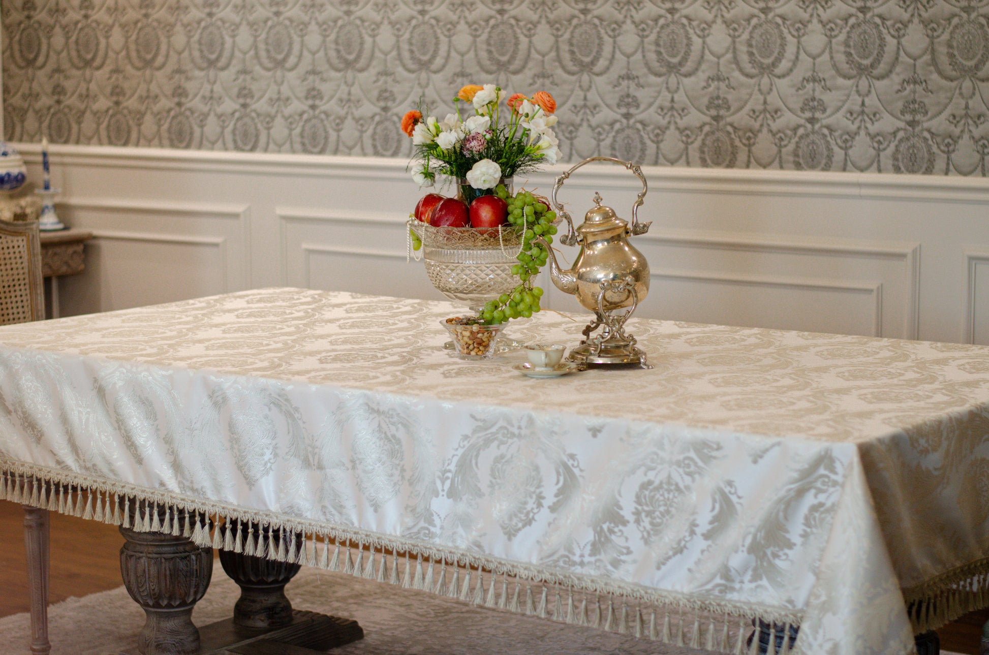 Transform your table decor with the Imperial Grace tablecloth. Inspired by traditional Arabesque motifs, this tablecloth showcases rich, intricate designs that add timeless sophistication to any setting. Shop this exquisite, high-quality tablecloth to elevate your table arrangements.