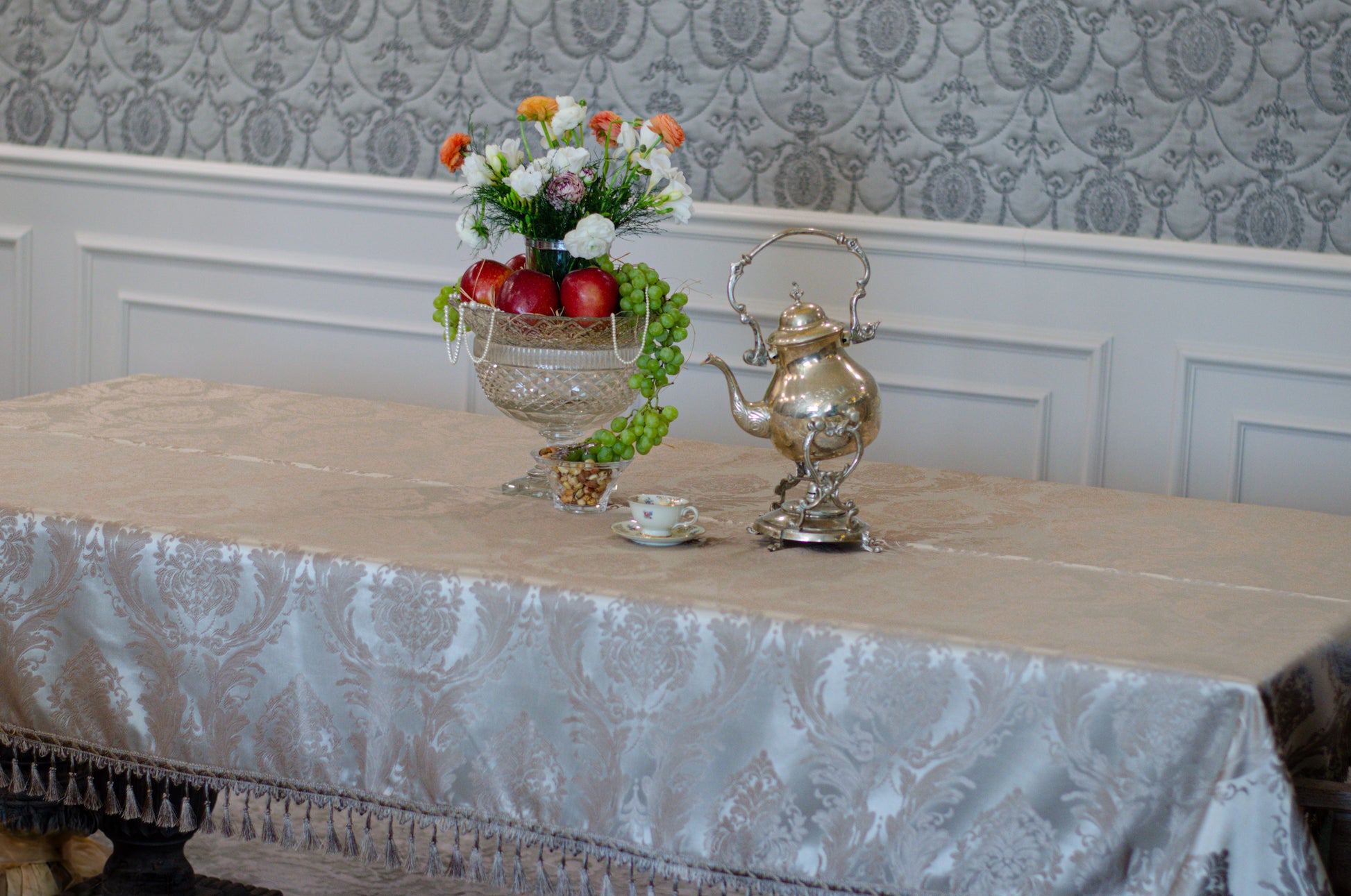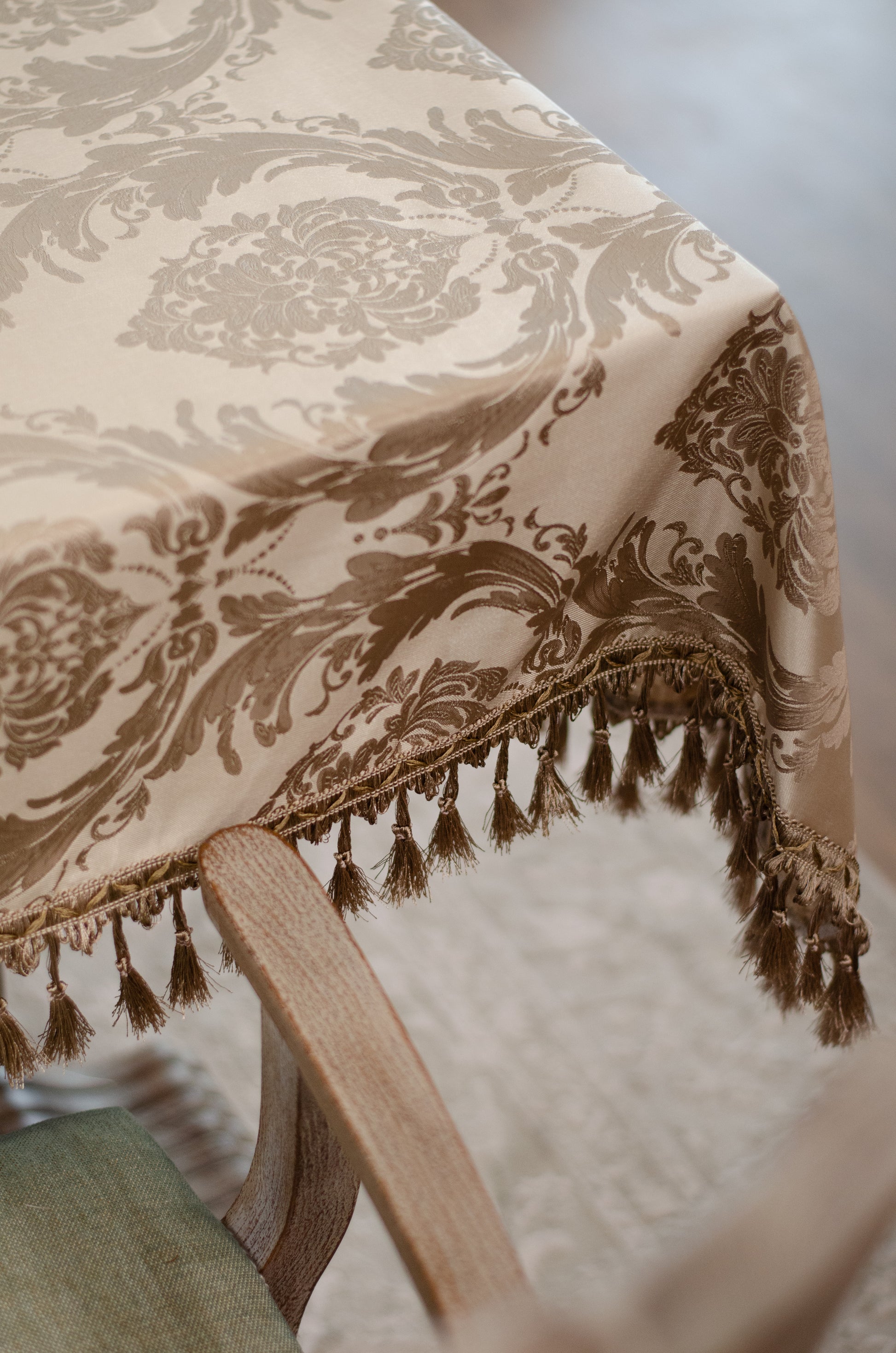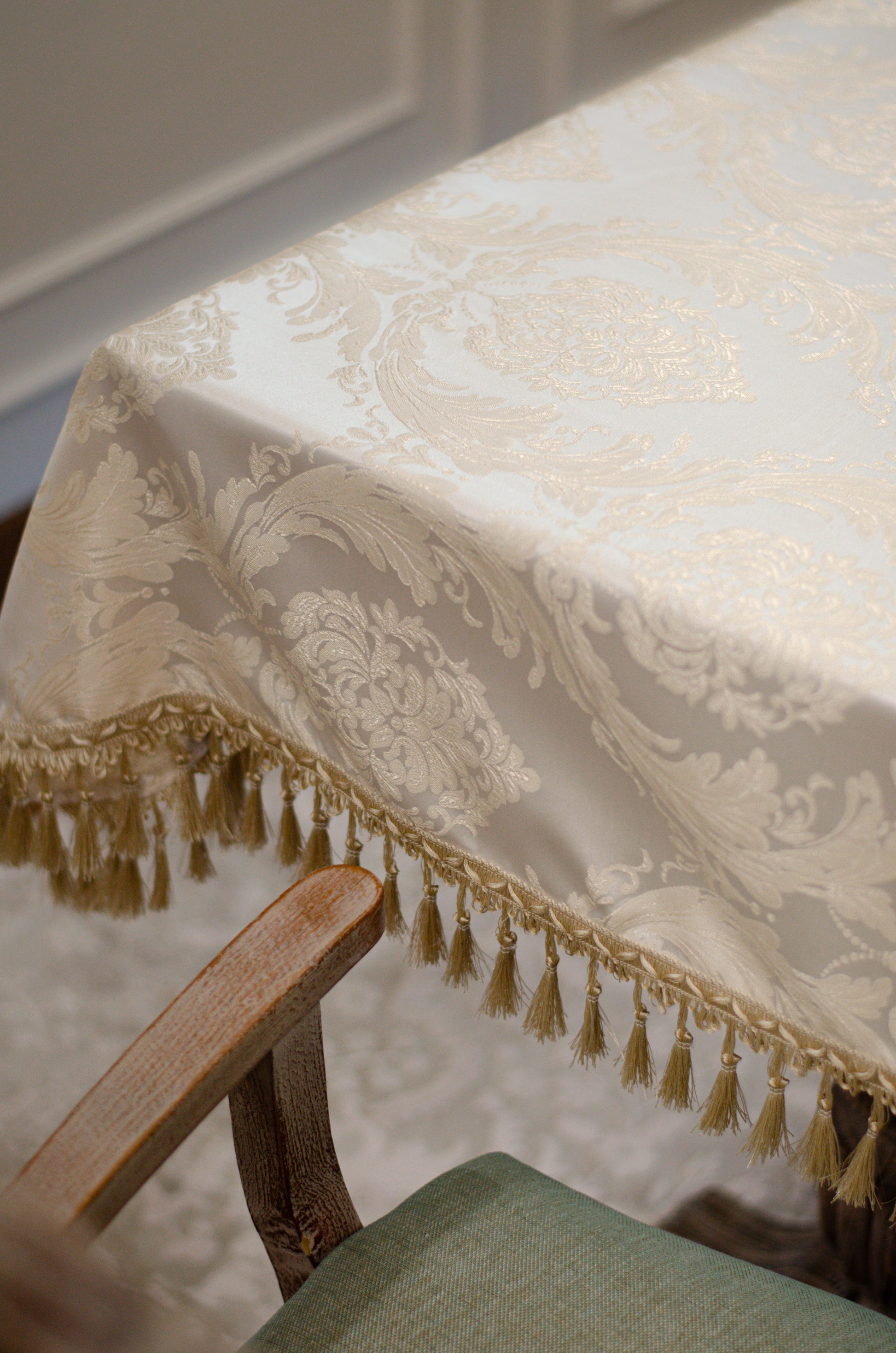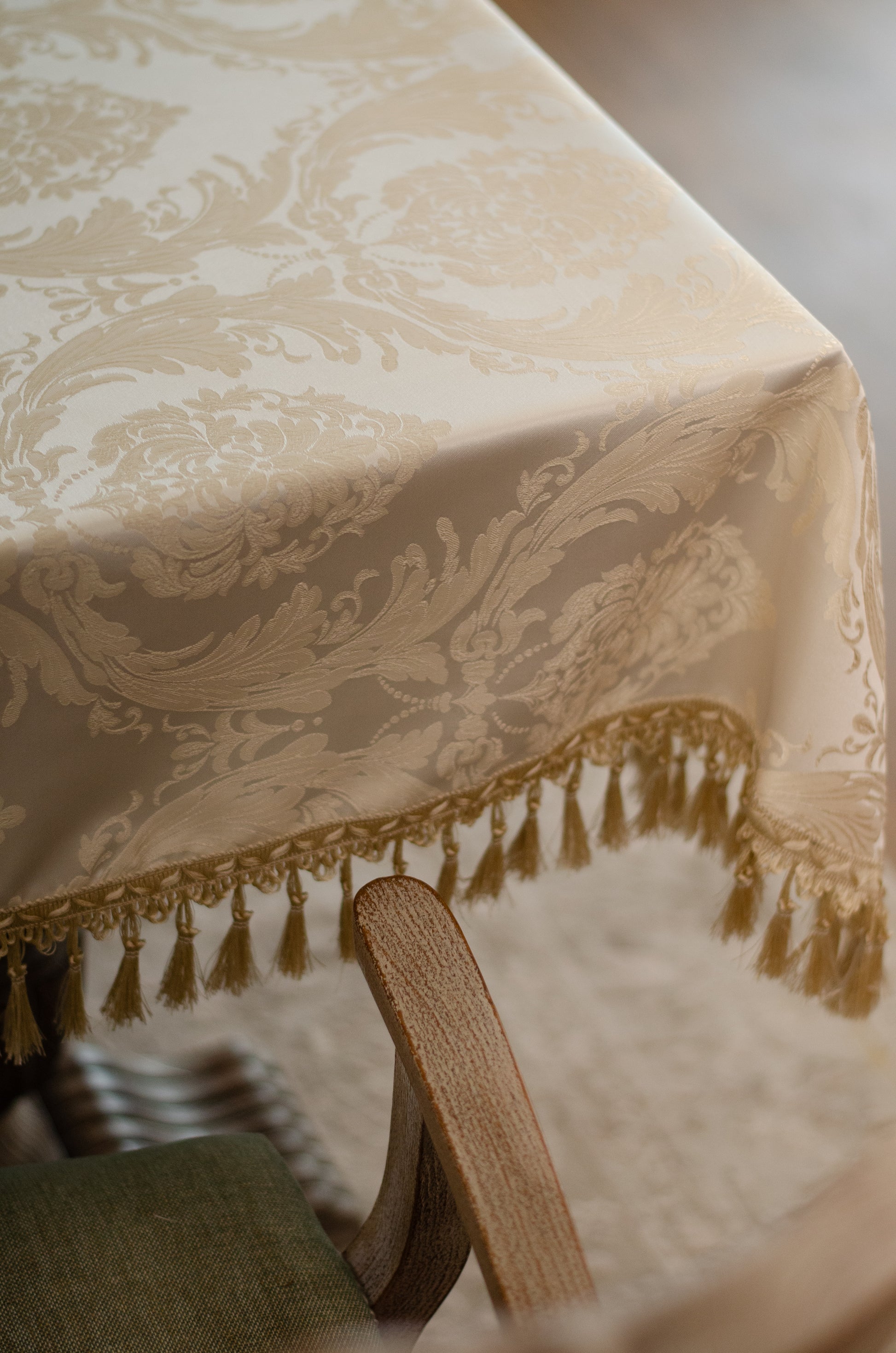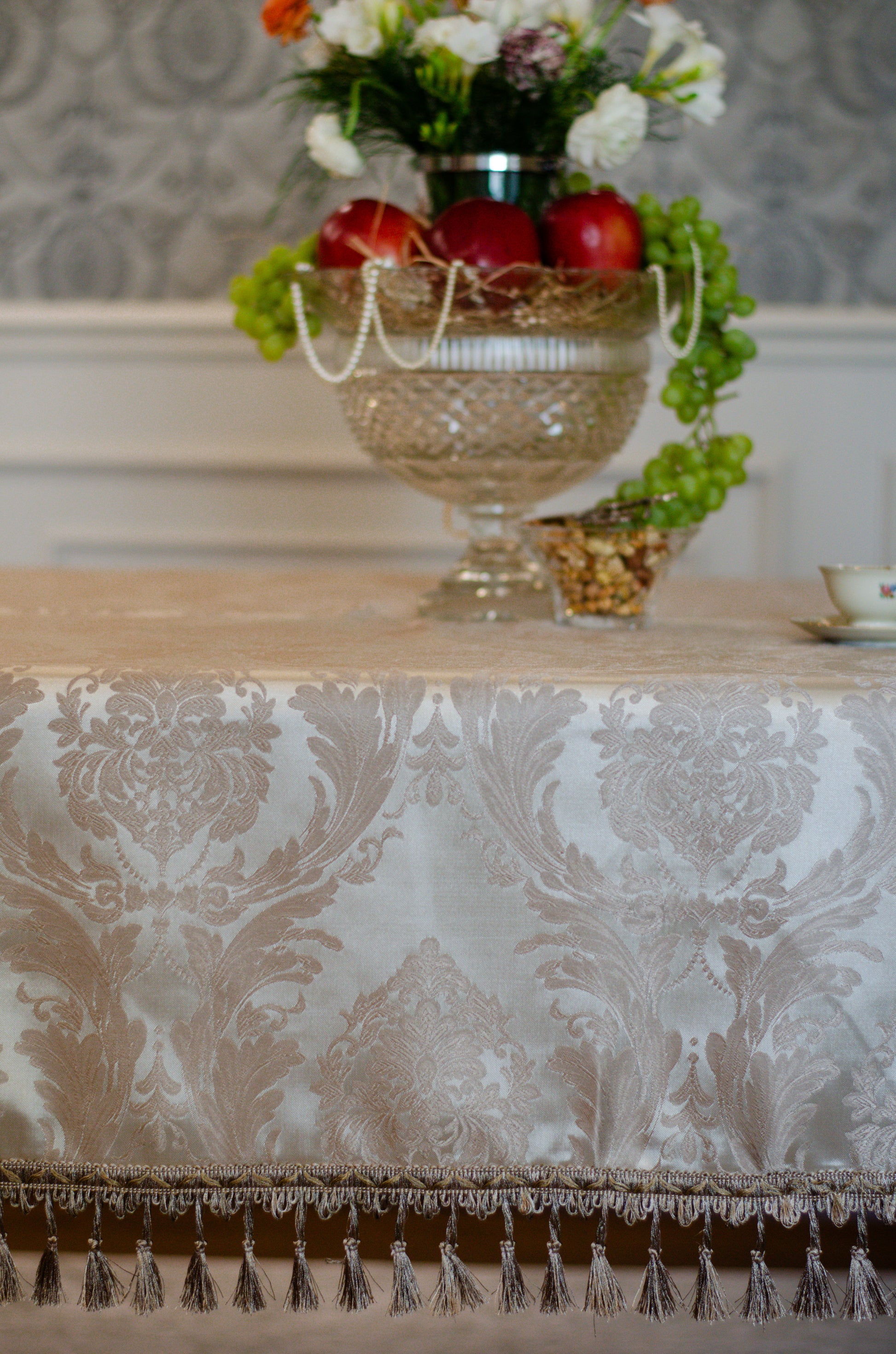 Transform your table decor with the Imperial Grace tablecloth. Inspired by traditional Arabesque motifs, this tablecloth showcases rich, intricate designs that add timeless sophistication to any setting. Shop this exquisite, high-quality tablecloth to elevate your table arrangements.
