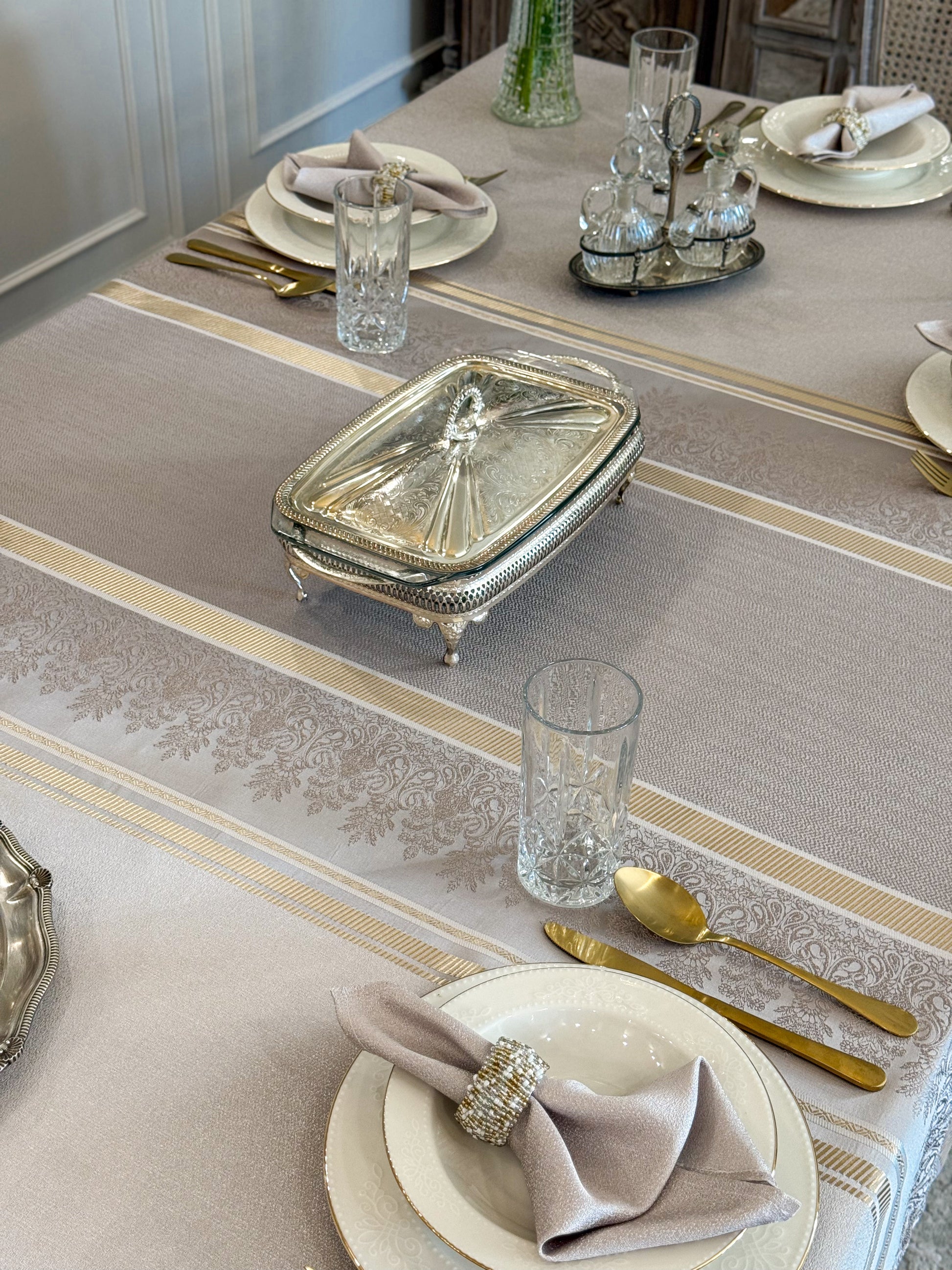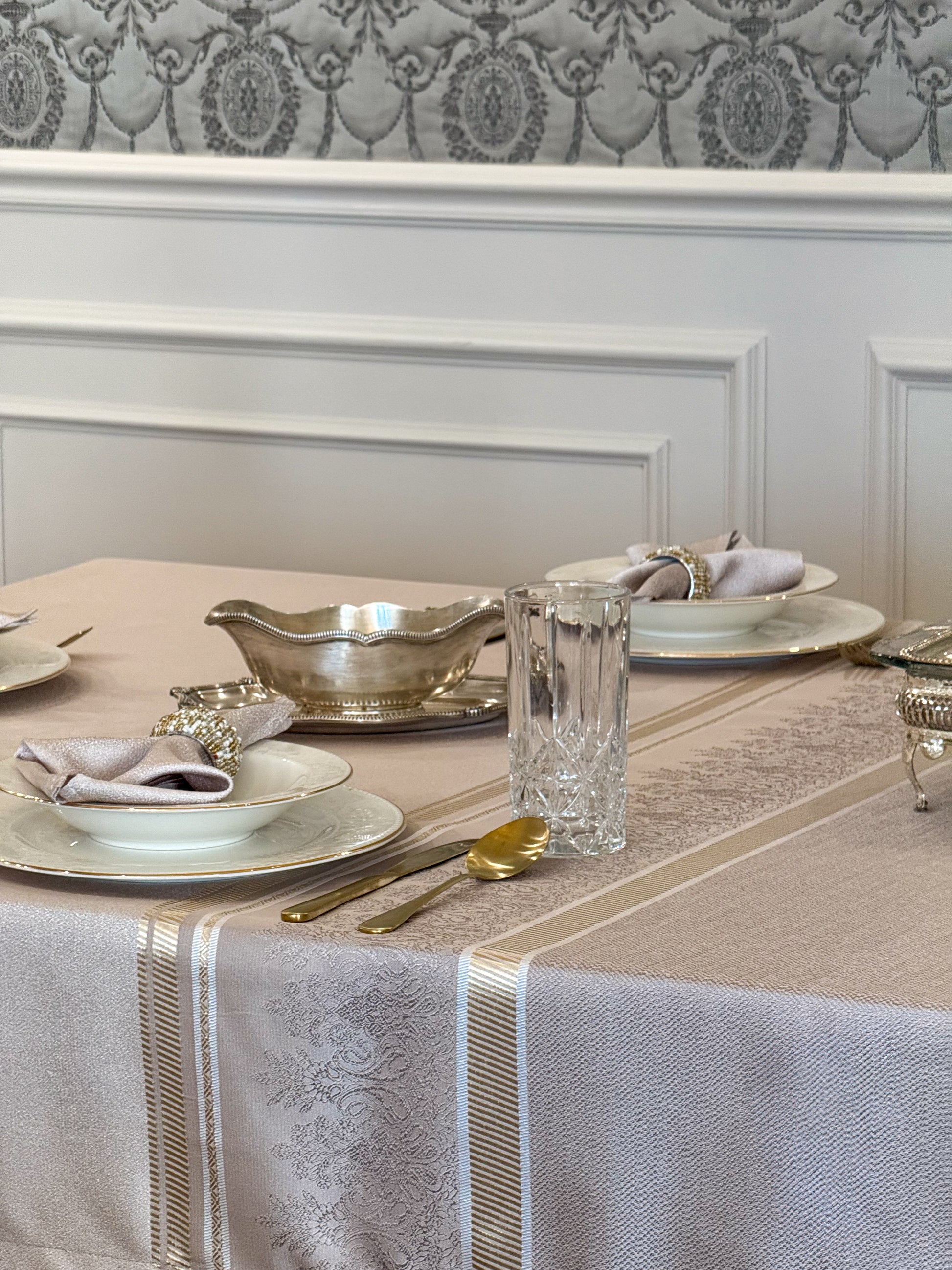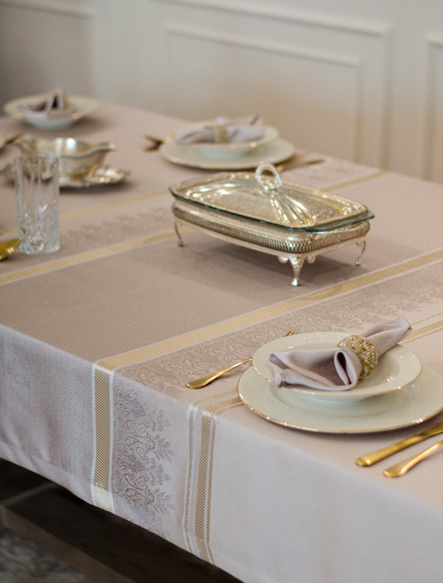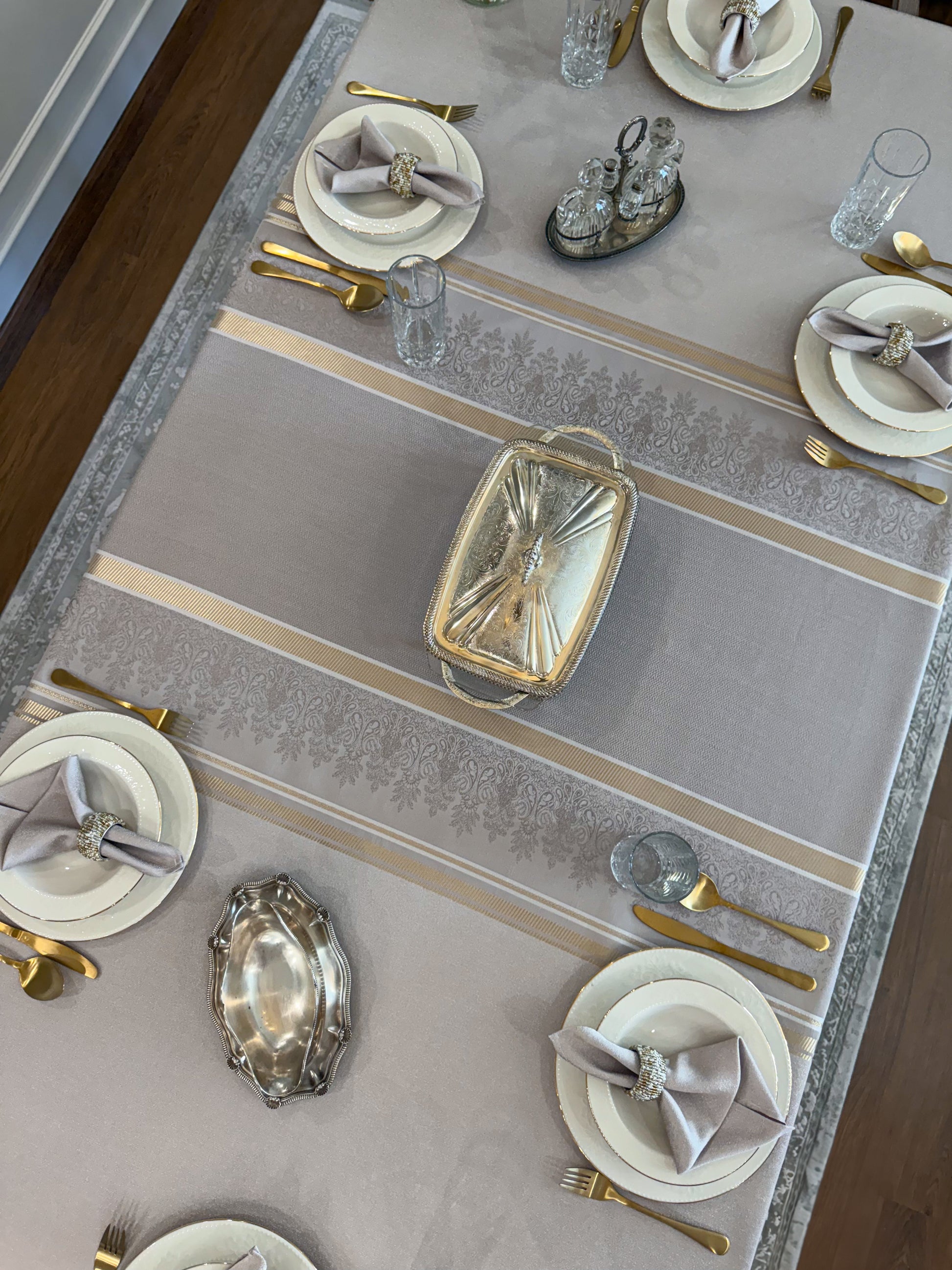 Transform your dining table with the Rococo Grace tablecloth from Élégance Des Tables. This luxurious tablecloth features a rich, intricate Rococo pattern that redefines elegance and adds timeless sophistication to any dining setting. Perfect as a beautiful layer under your tableware to create a luxurious tablescape, and for everyday use as an elegant décor in your dining room. Shop now to elevate your dining experience.