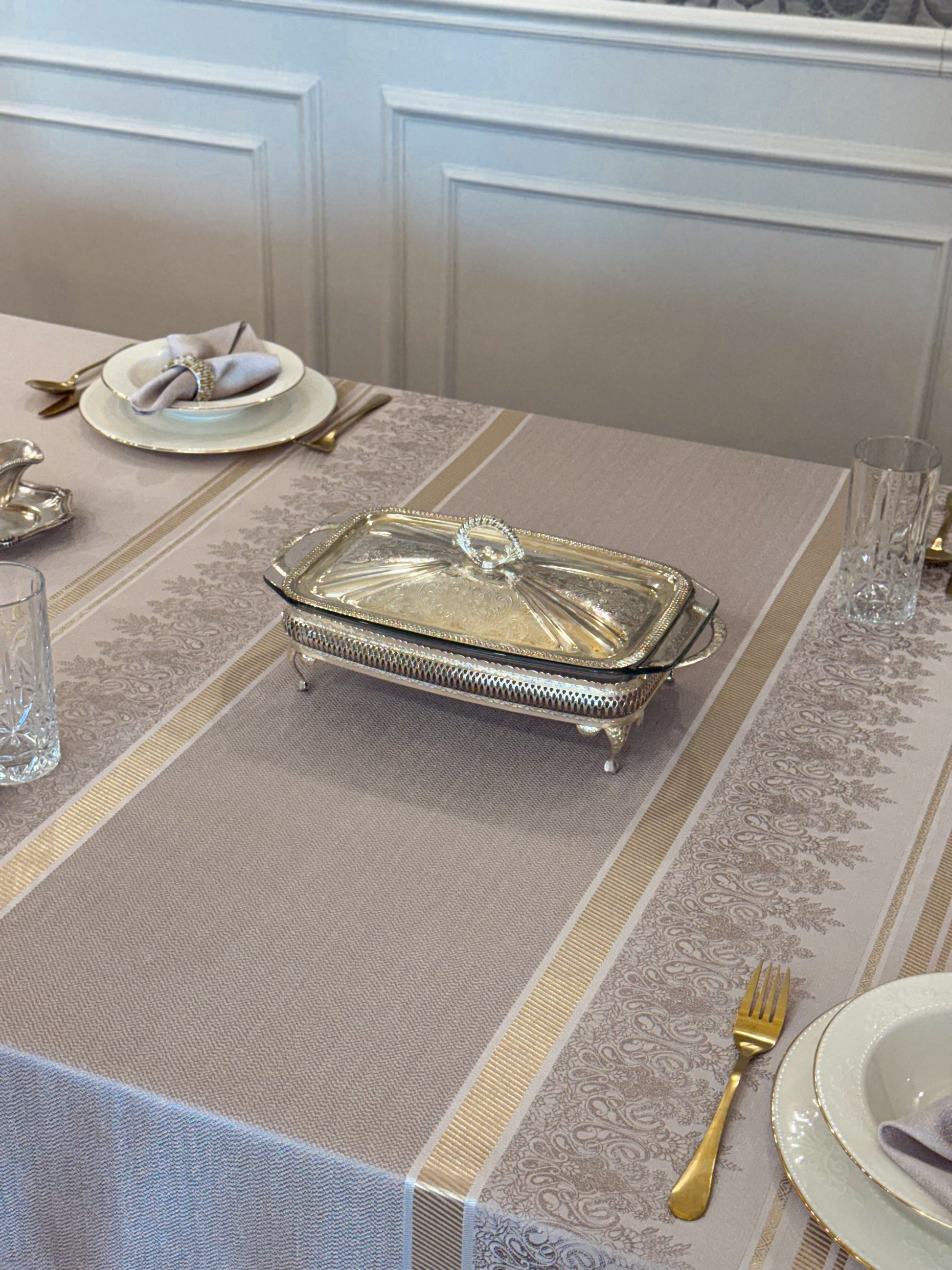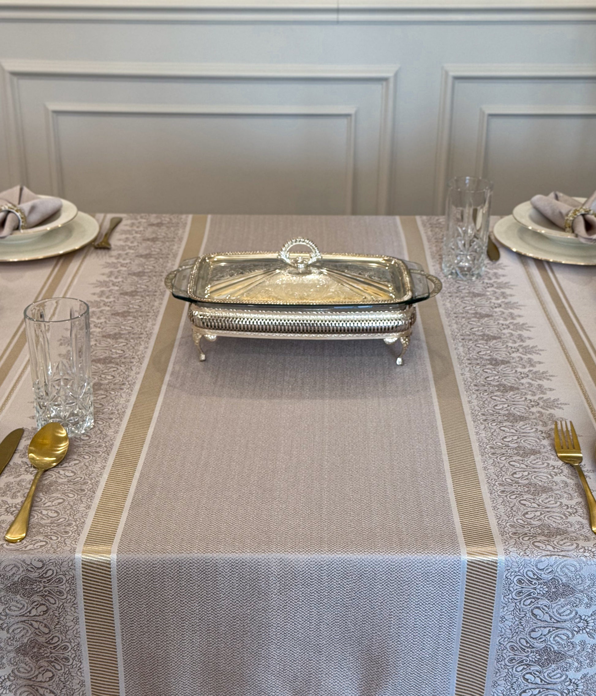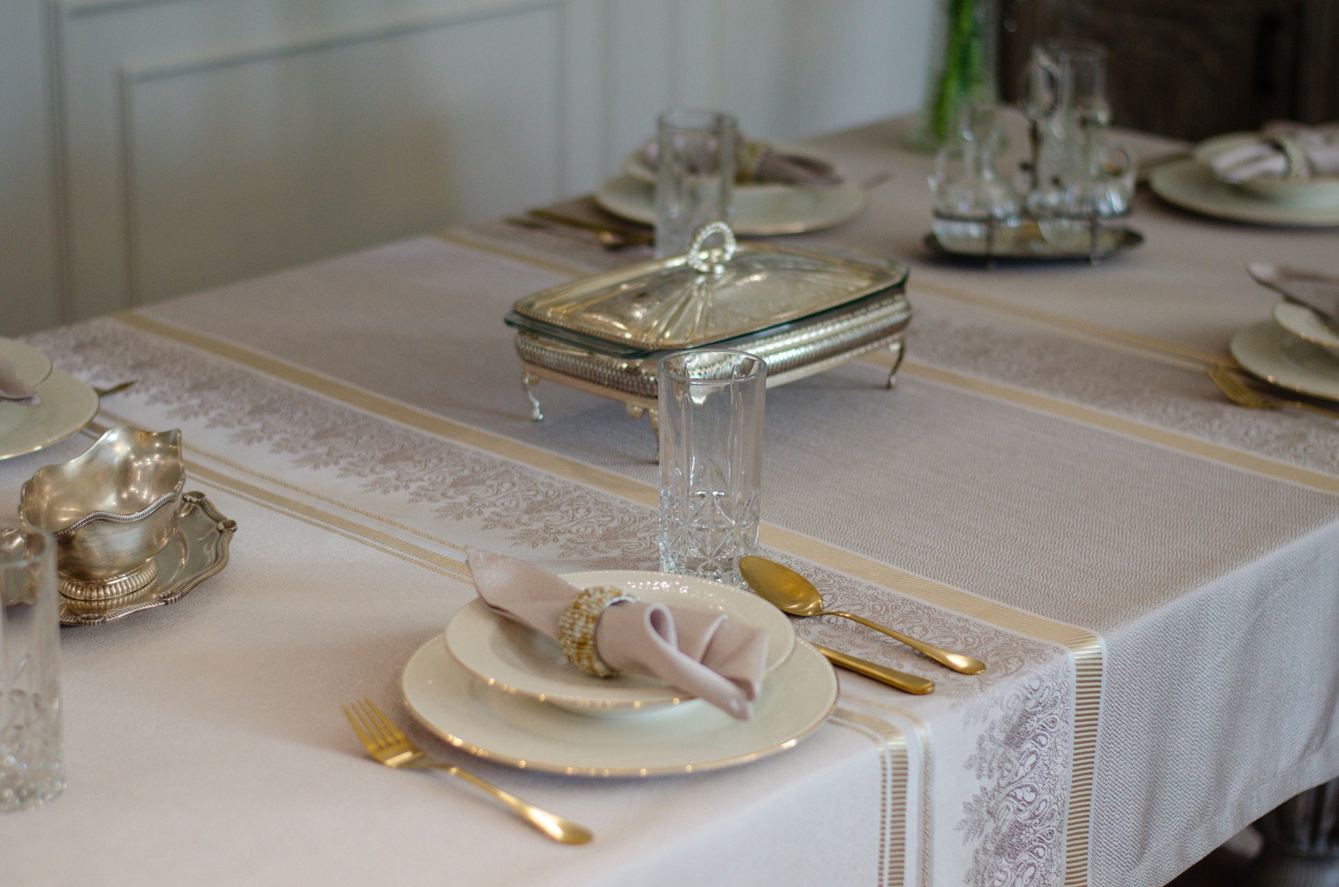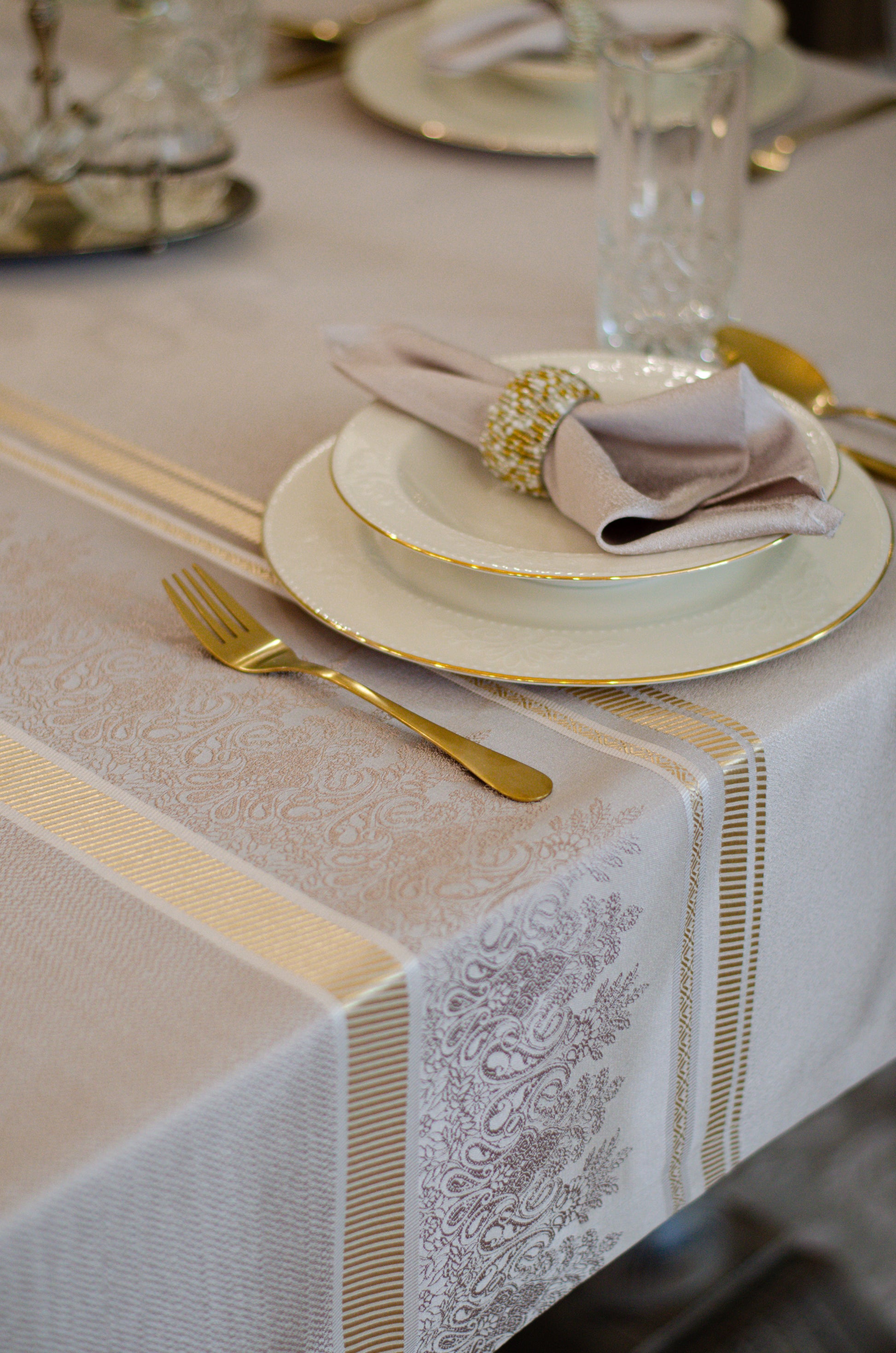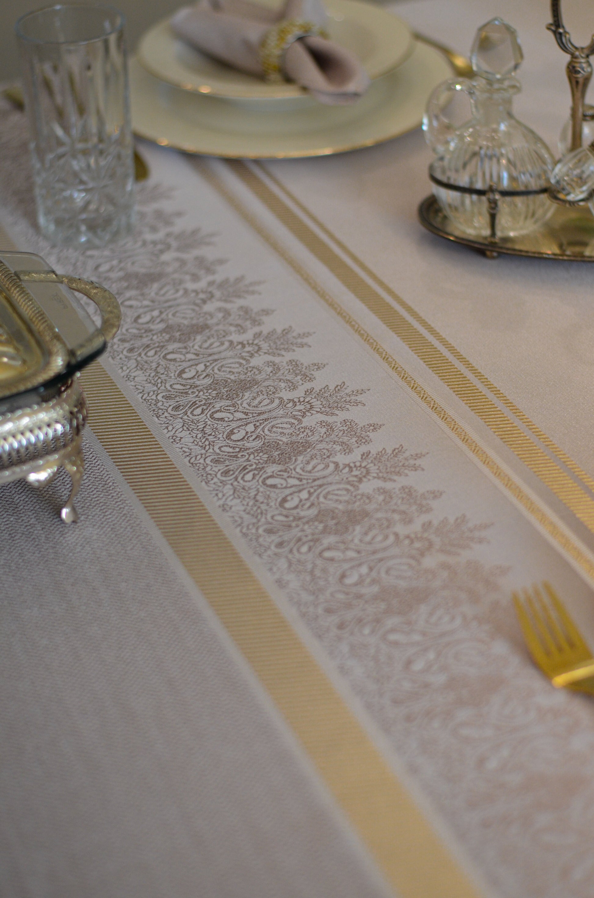 Transform your dining table with the Rococo Grace tablecloth from Élégance Des Tables. This luxurious tablecloth features a rich, intricate Rococo pattern that redefines elegance and adds timeless sophistication to any dining setting. Perfect as a beautiful layer under your tableware to create a luxurious tablescape, and for everyday use as an elegant décor in your dining room. Shop now to elevate your dining experience.