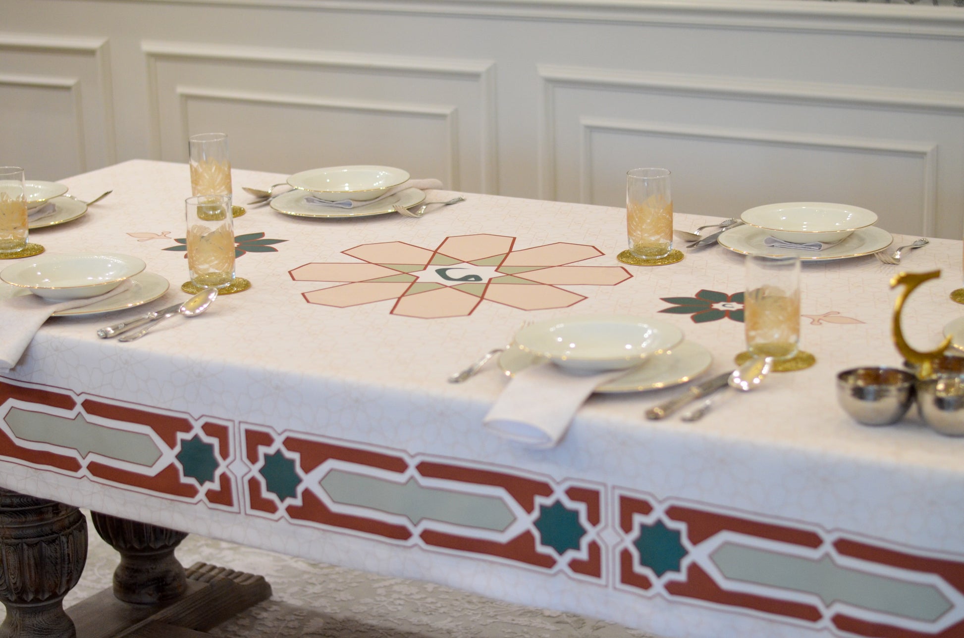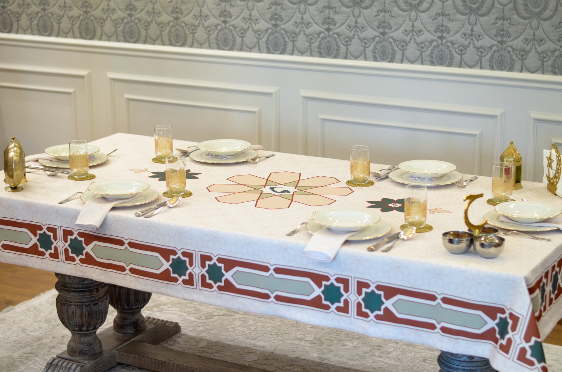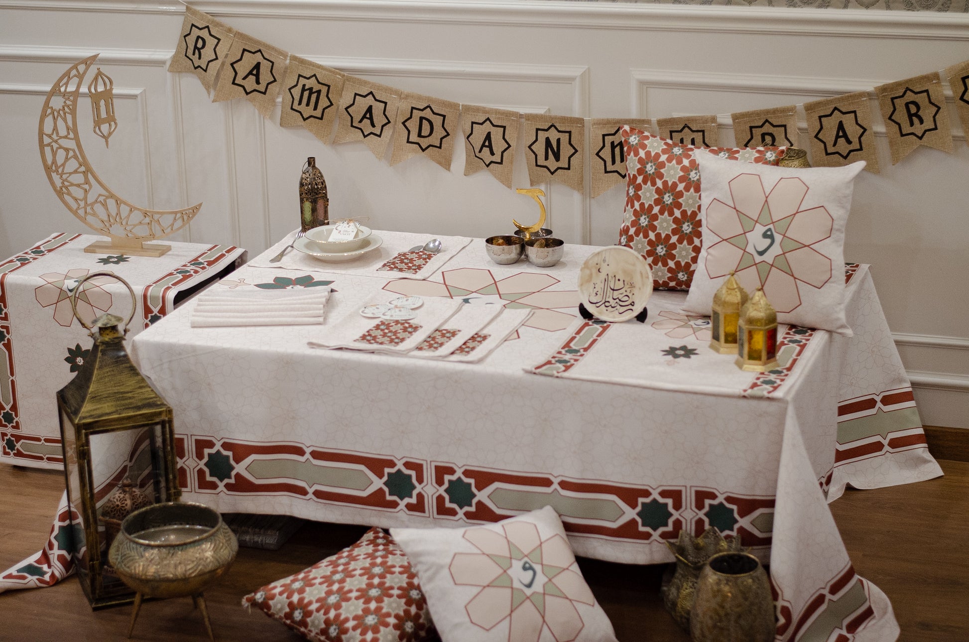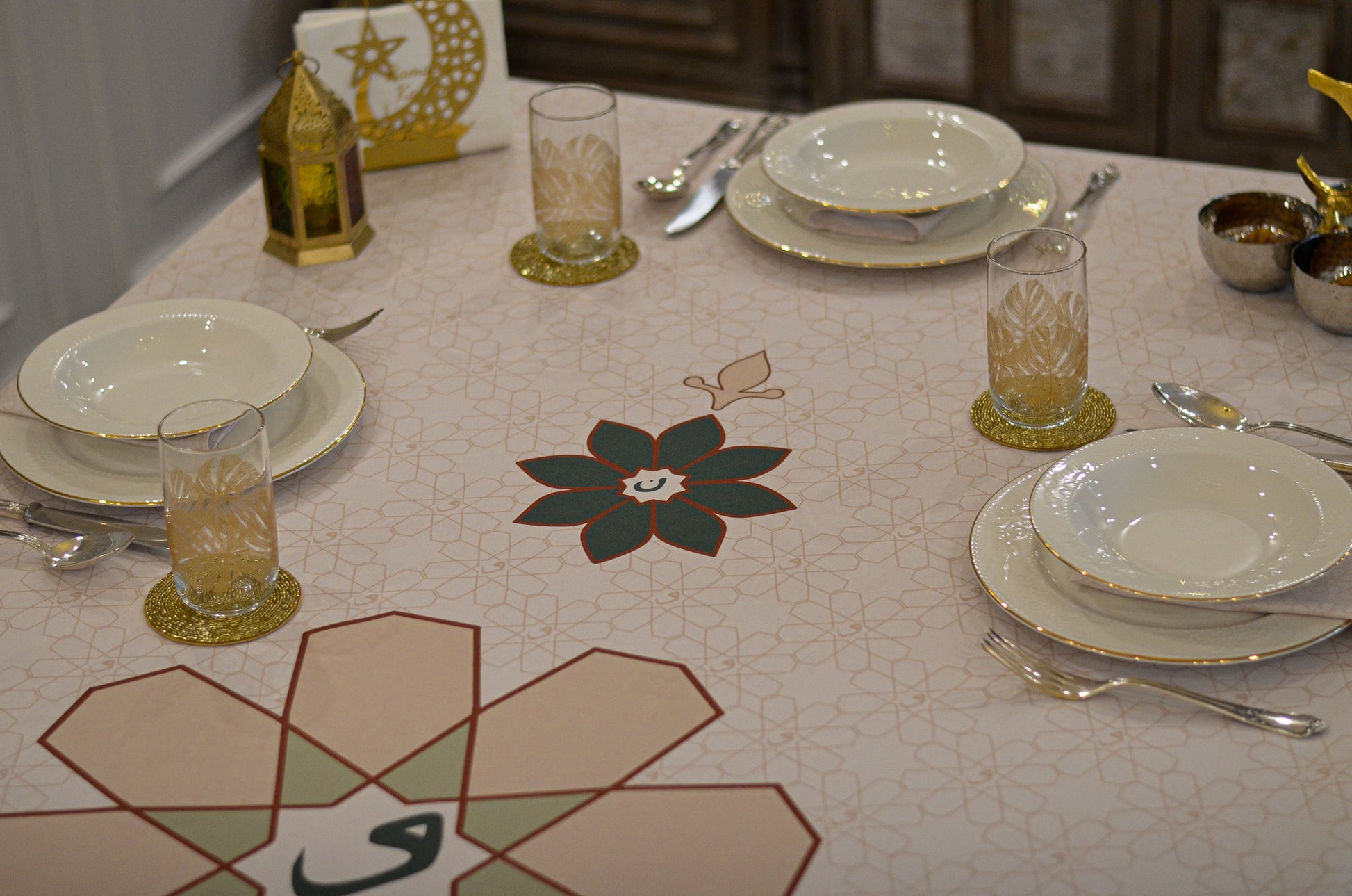 Designed for moments of generosity and togetherness, this refined tablecloth creates an inviting setting where family and loved ones come together to break their fast. Crafted with precision and elegance, Najm transforms your space into a warm and welcoming haven, making every Ramadan evening truly special.