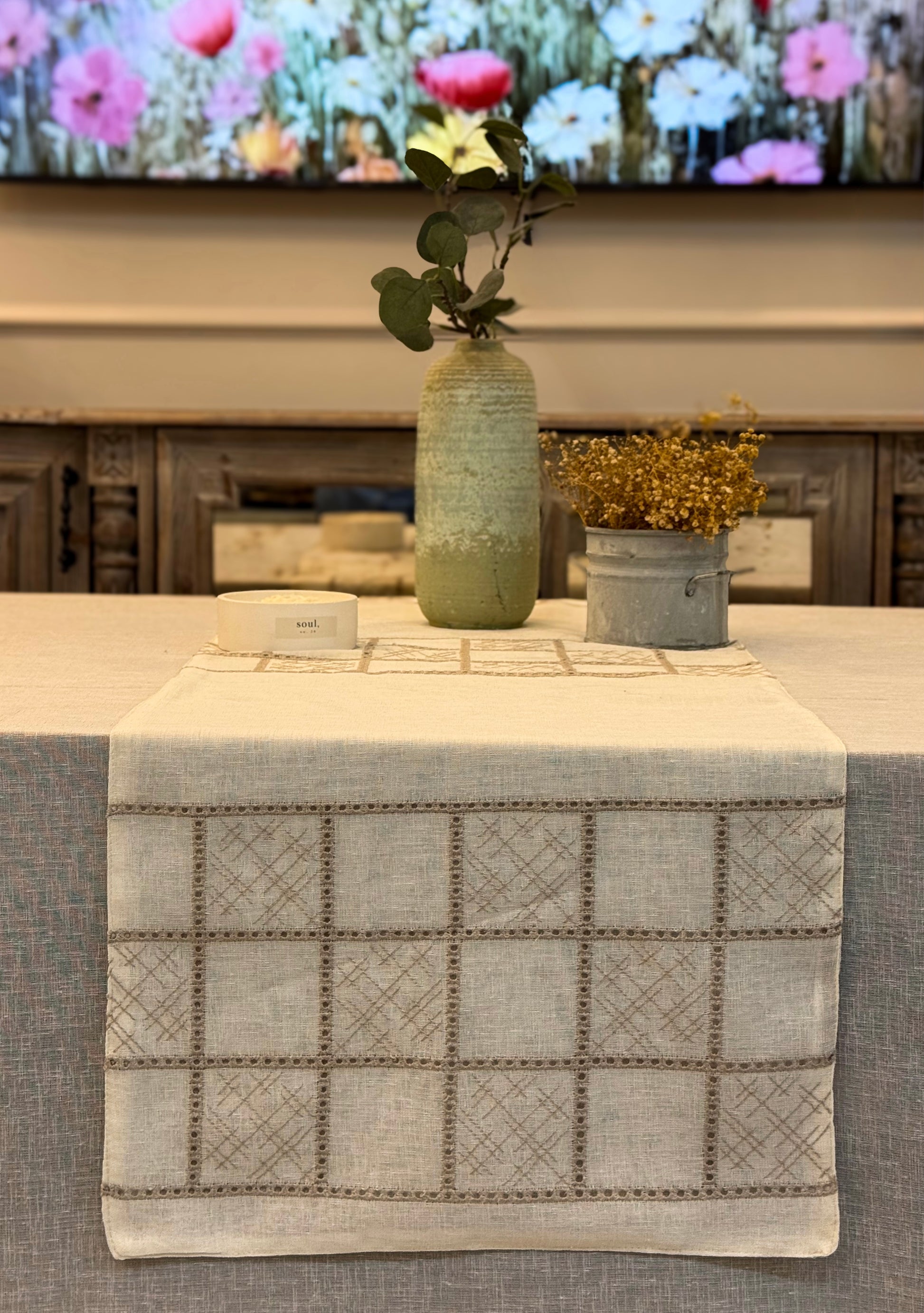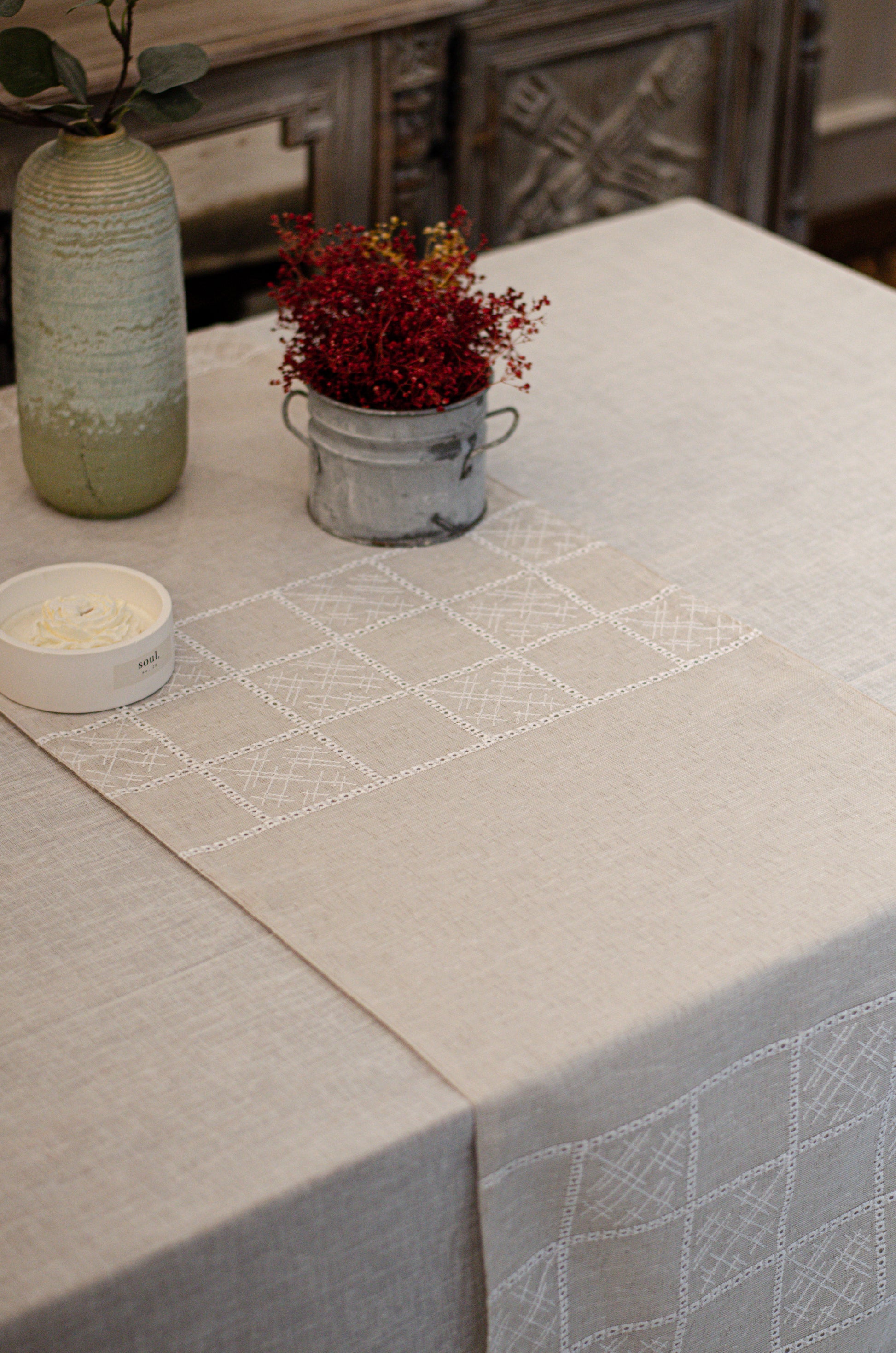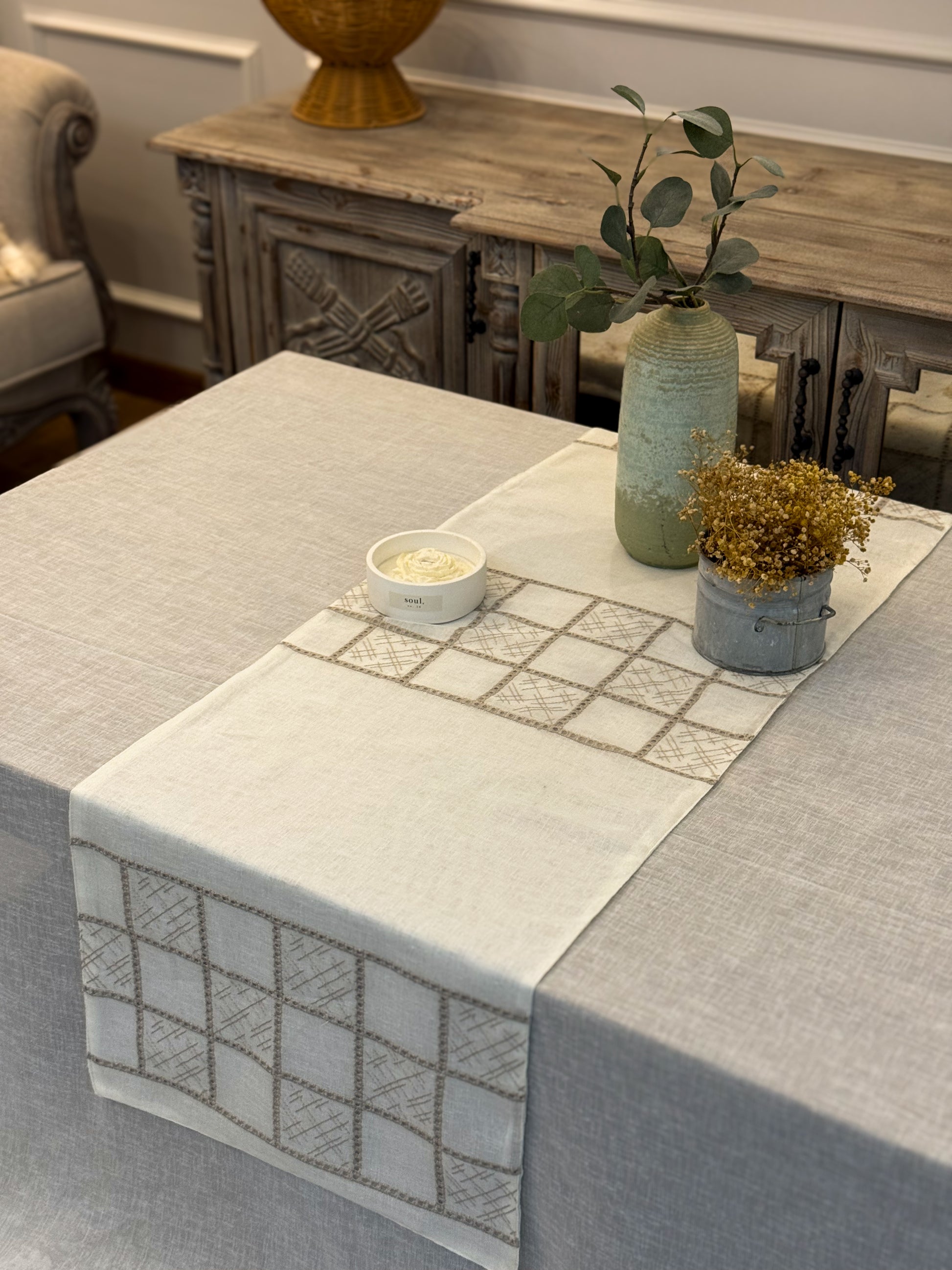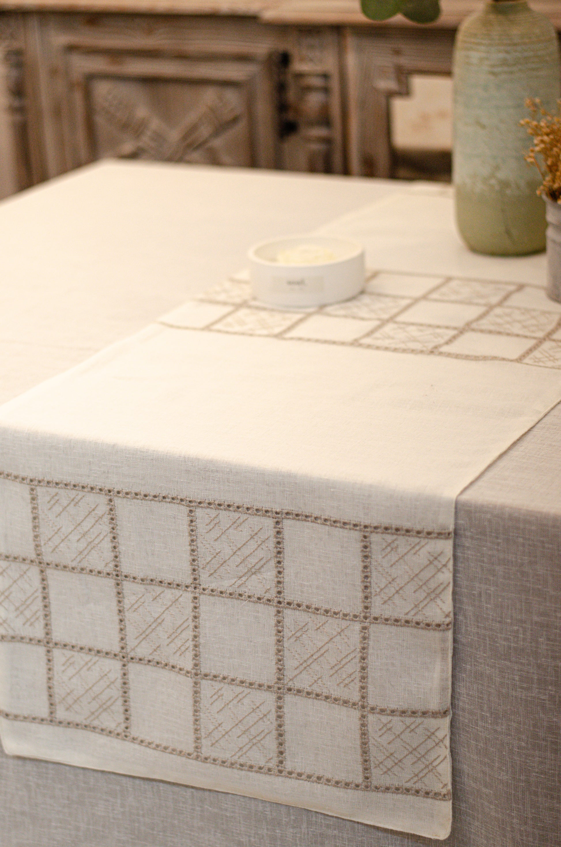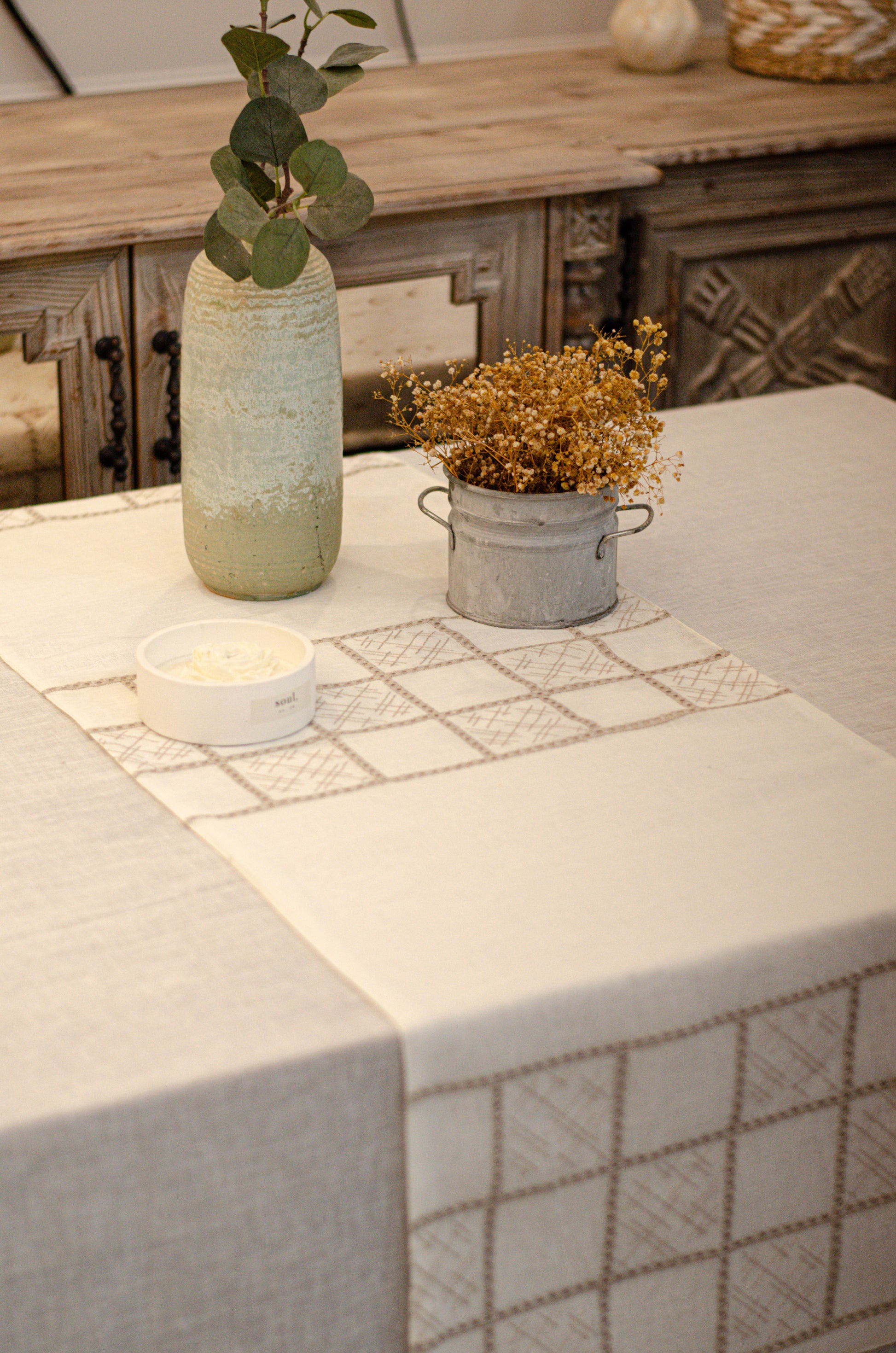 Turn your table into a statement of natural elegance with the Carré runner. Crafted from premium linen, this runner features embroidered squares that create a sophisticated, textured pattern. The clean lines and geometric design give it a modern flair, making it perfect for both modern and vintage settings.