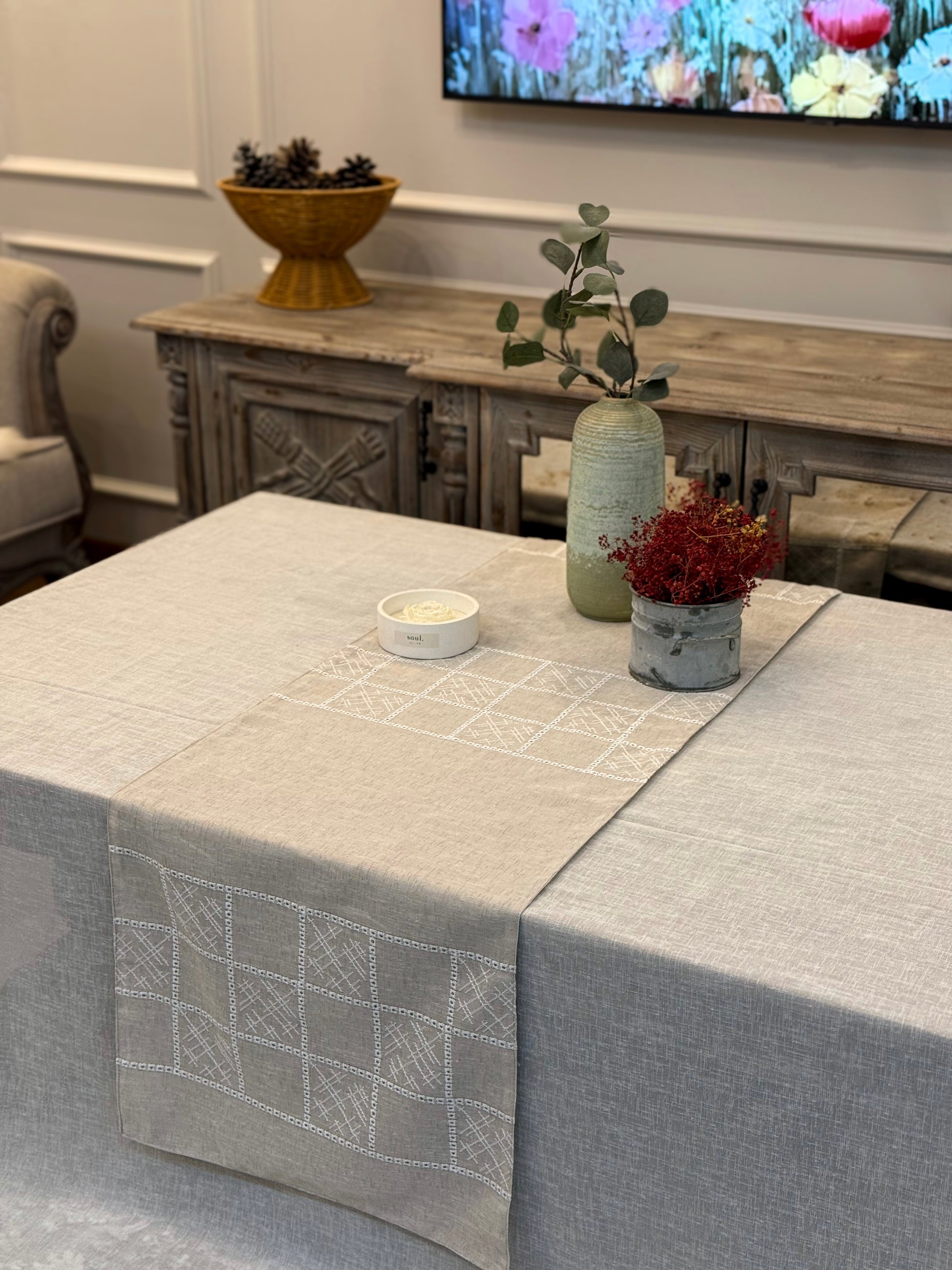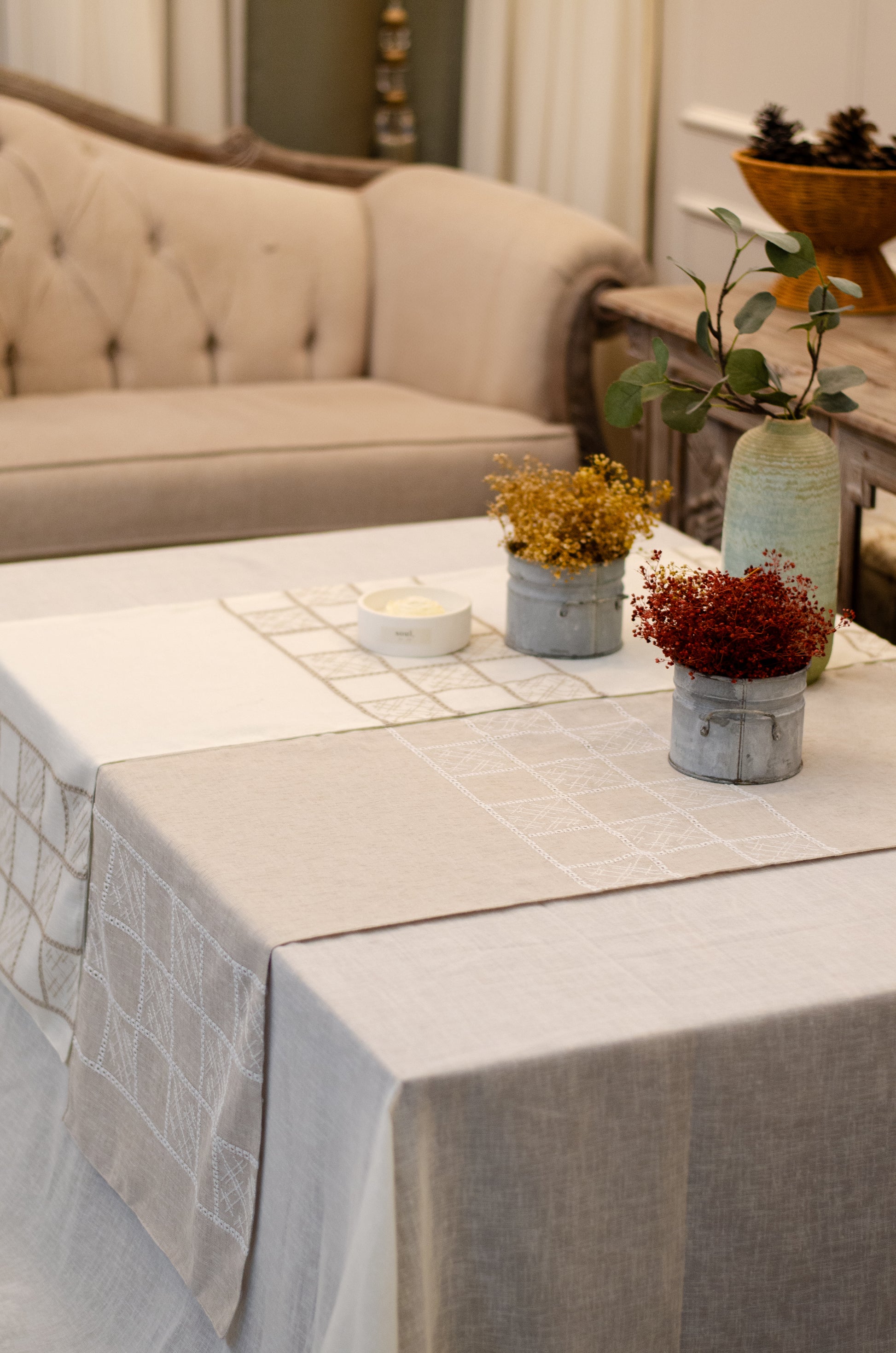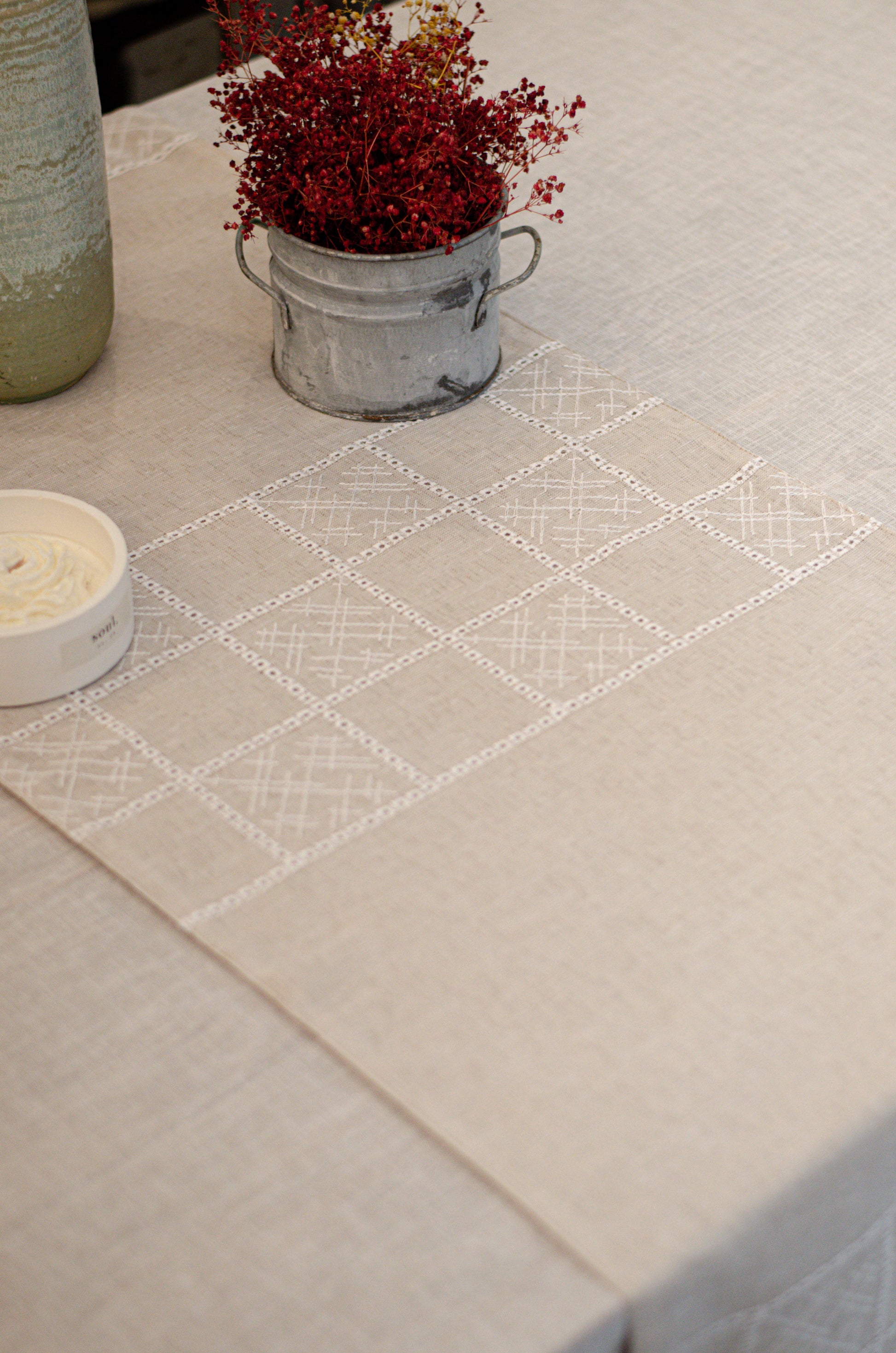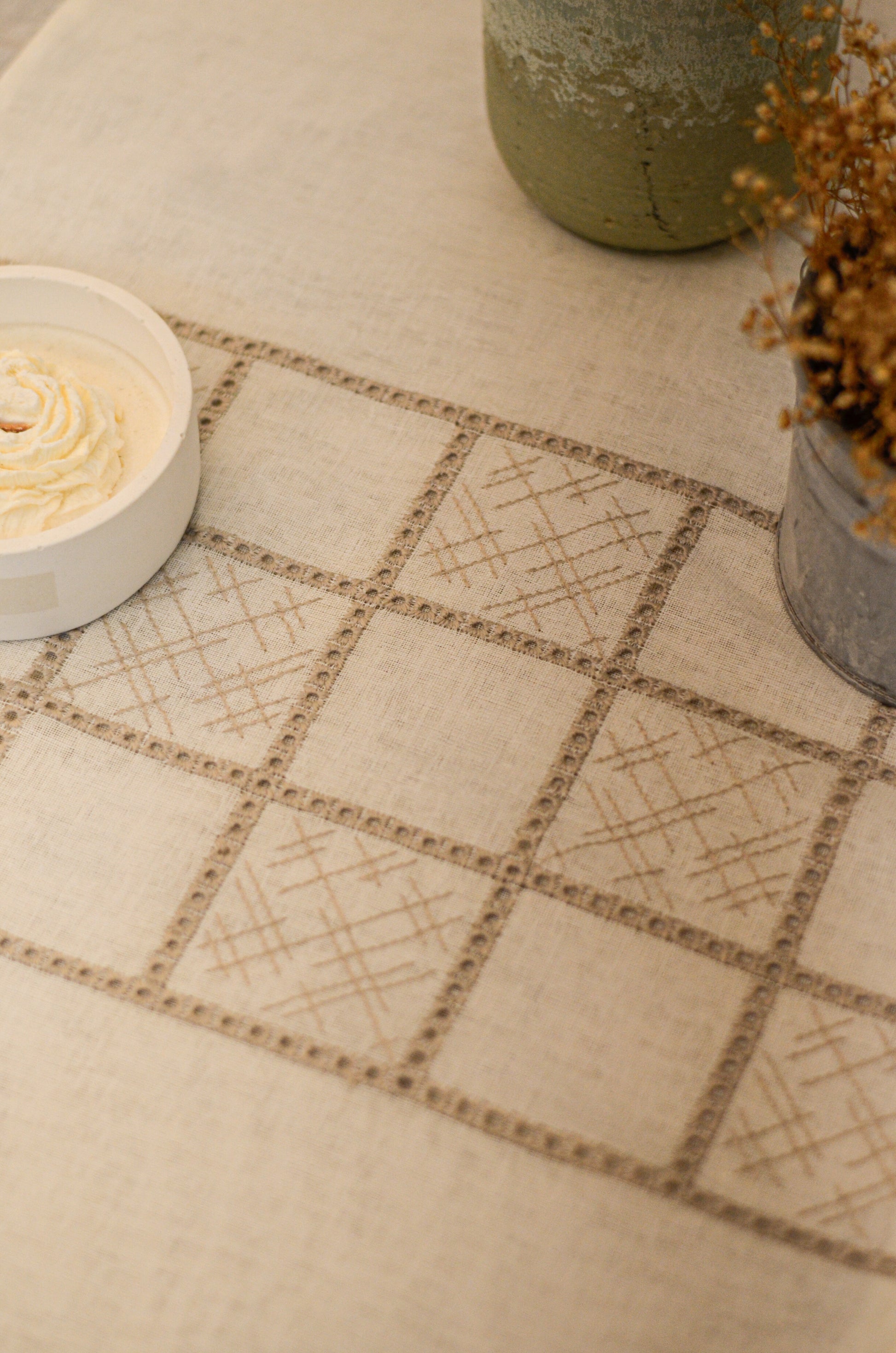 Turn your table into a statement of natural elegance with the Carré runner. Crafted from premium linen, this runner features embroidered squares that create a sophisticated, textured pattern. The clean lines and geometric design give it a modern flair, making it perfect for both modern and vintage settings.