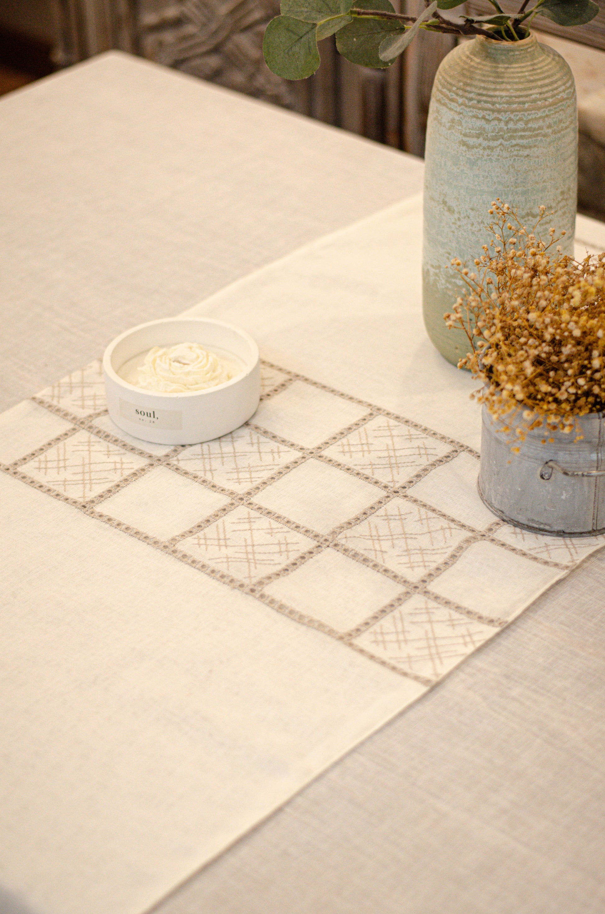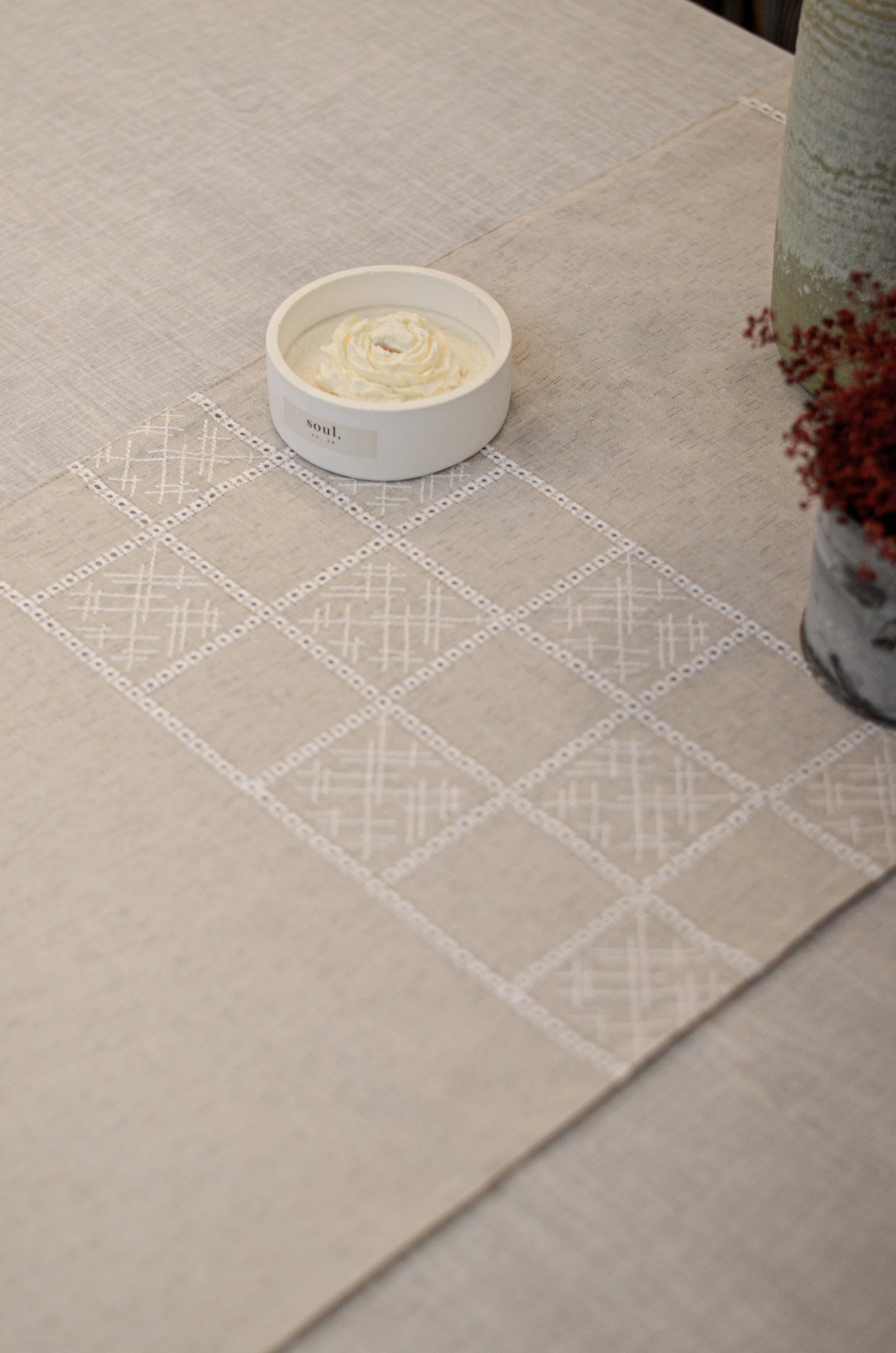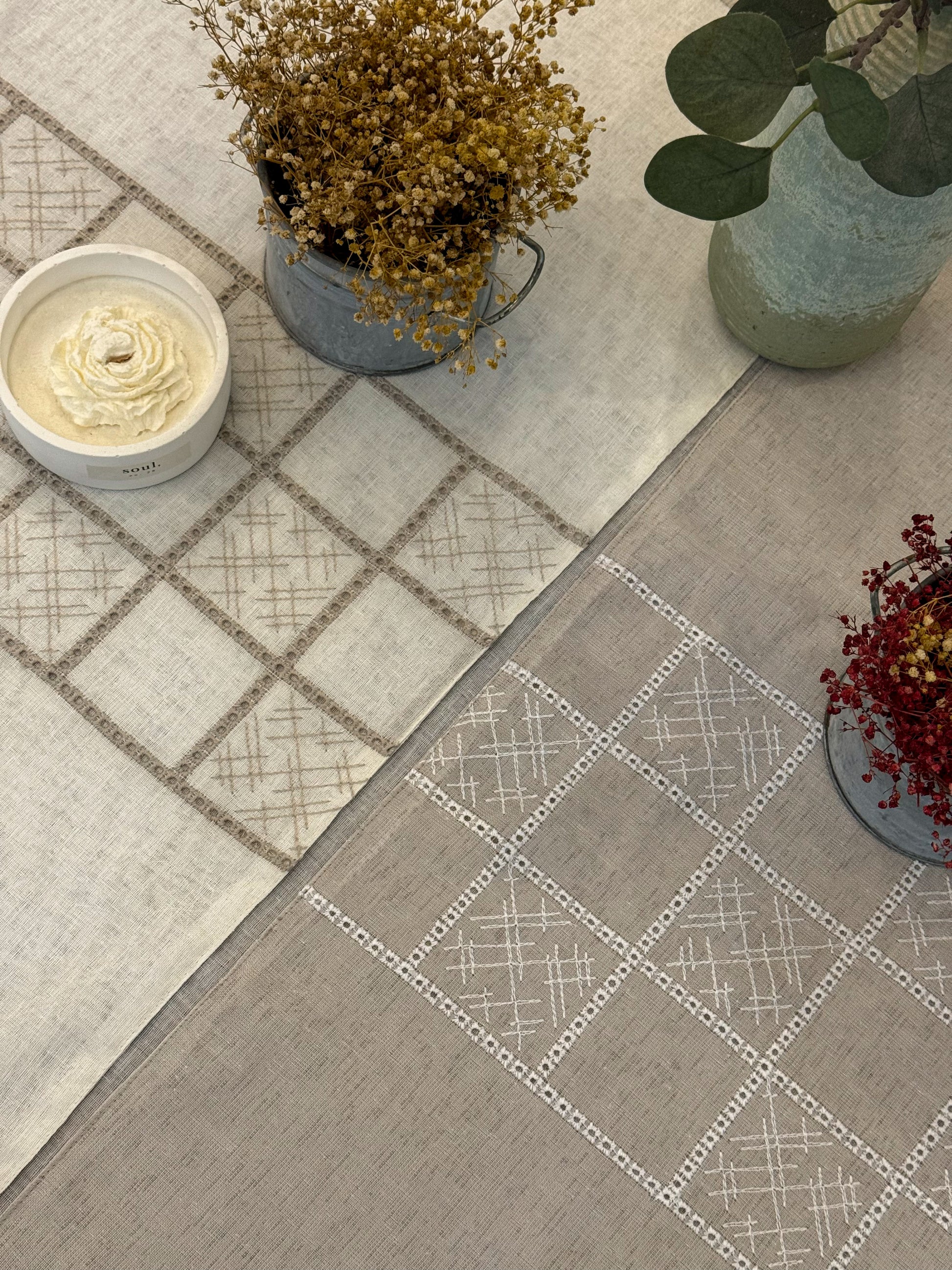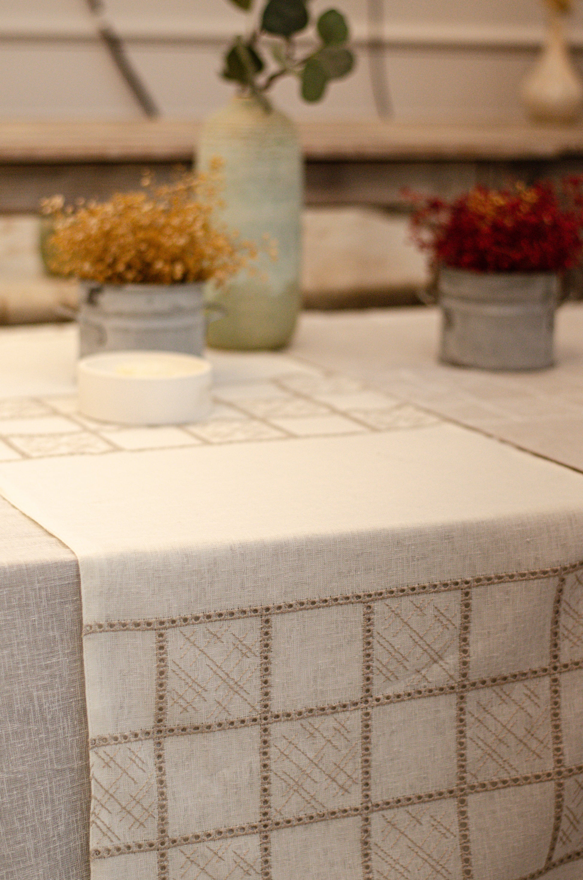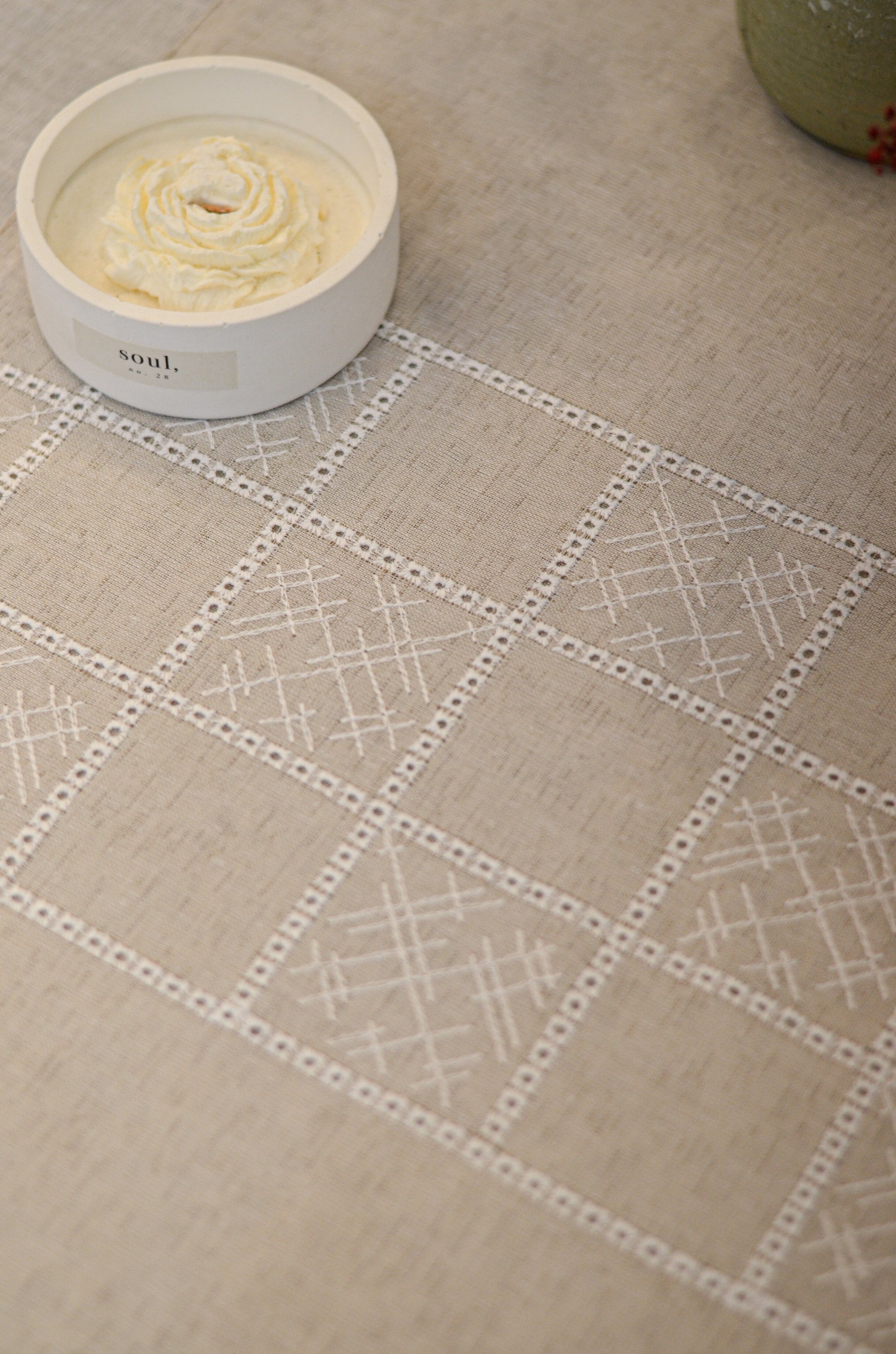 Turn your table into a statement of natural elegance with the Carré runner. Crafted from premium linen, this runner features embroidered squares that create a sophisticated, textured pattern. The clean lines and geometric design give it a modern flair, making it perfect for both modern and vintage settings.