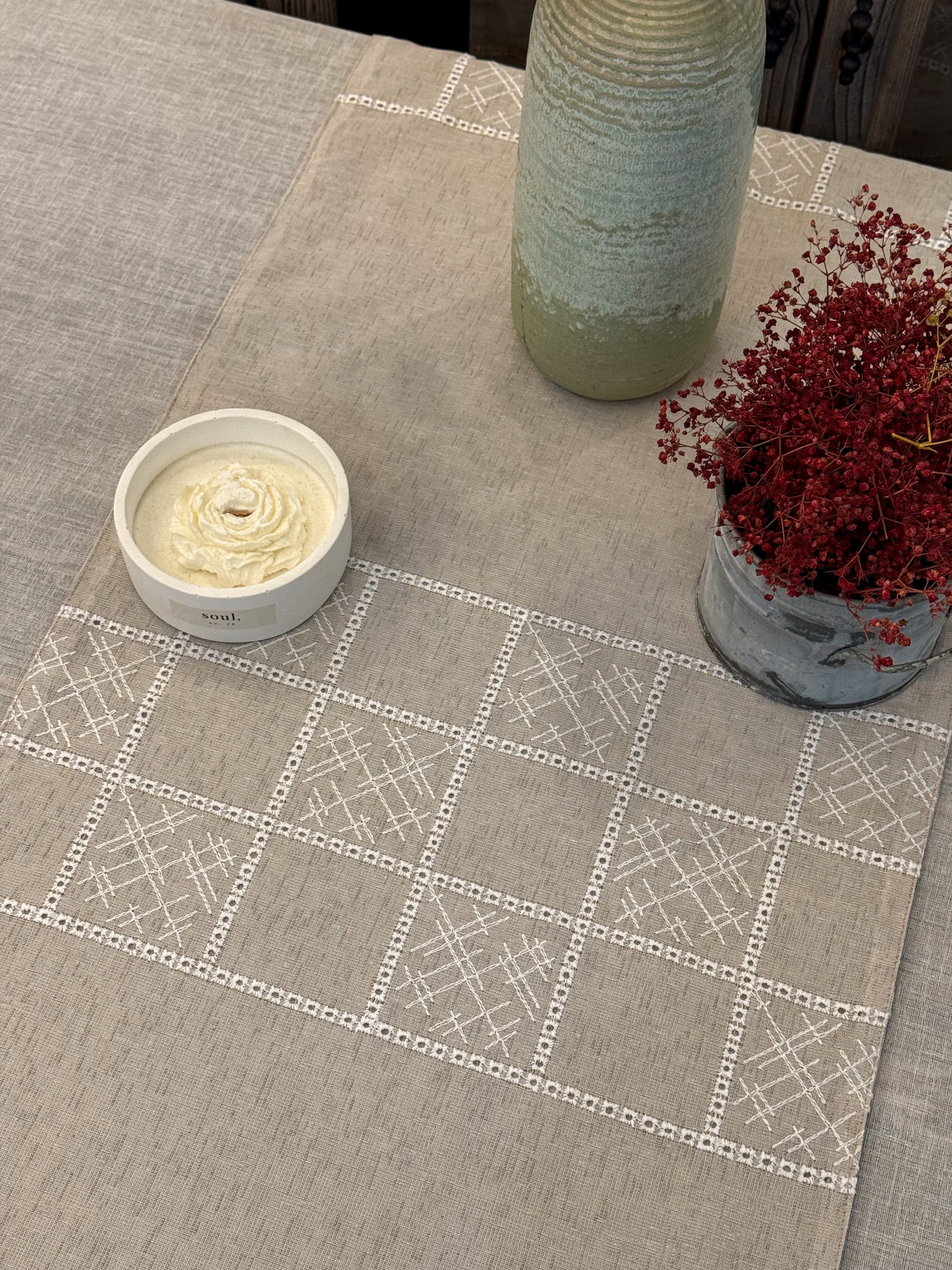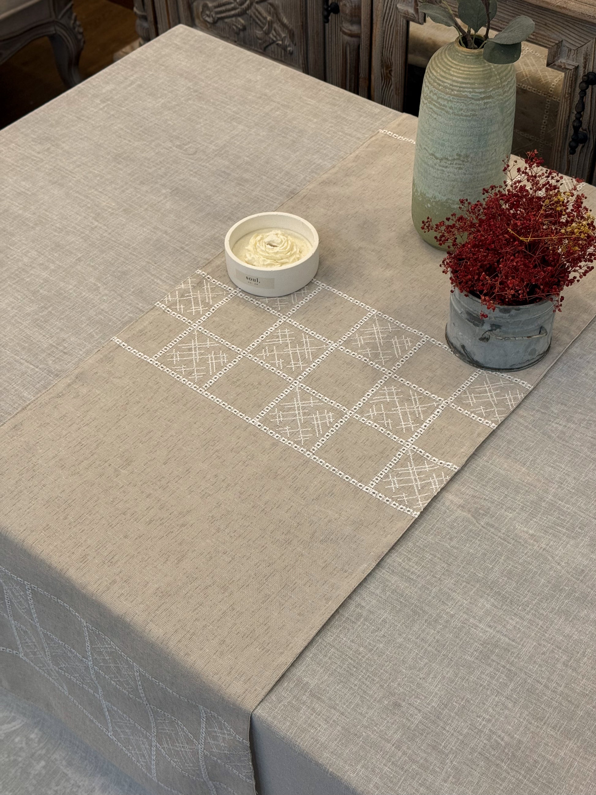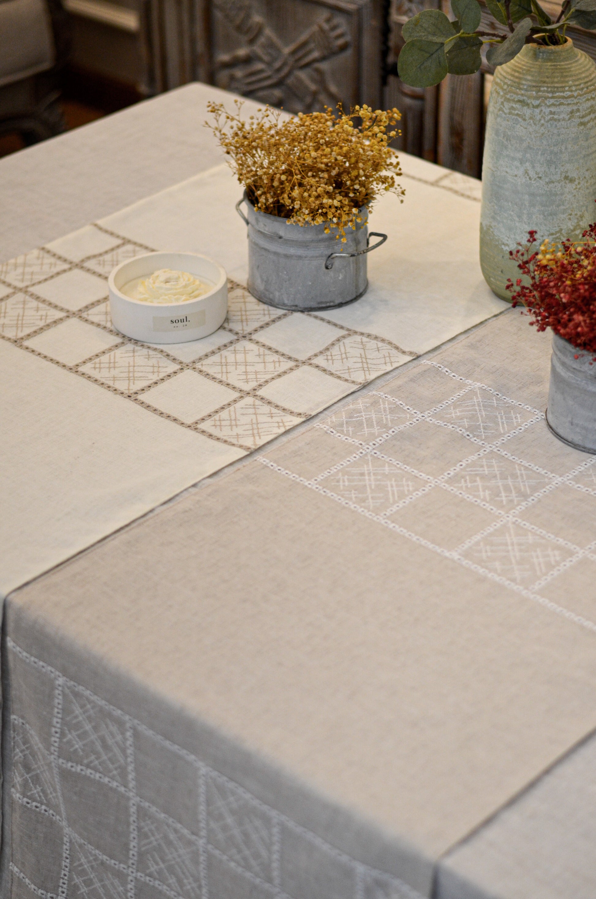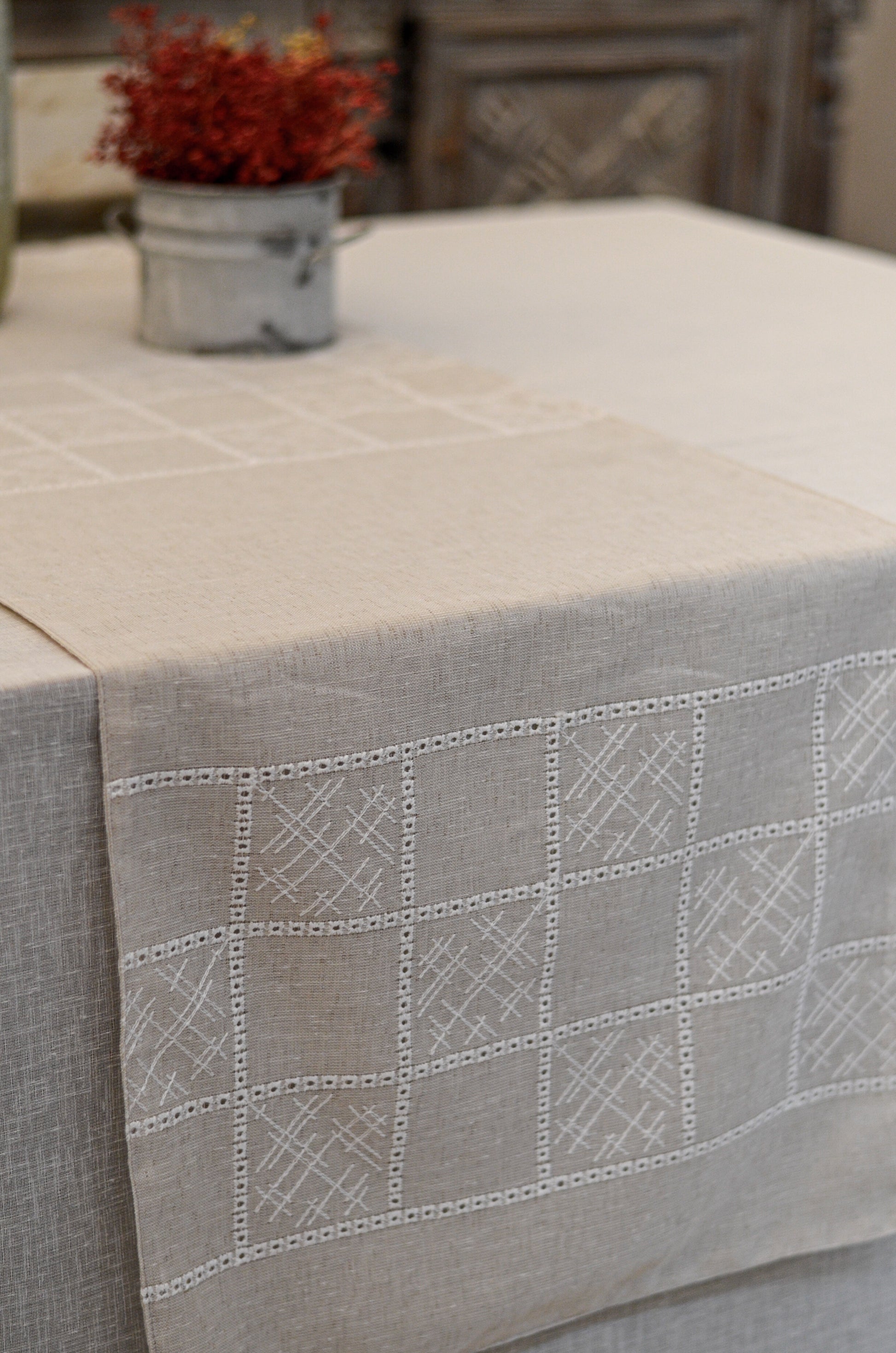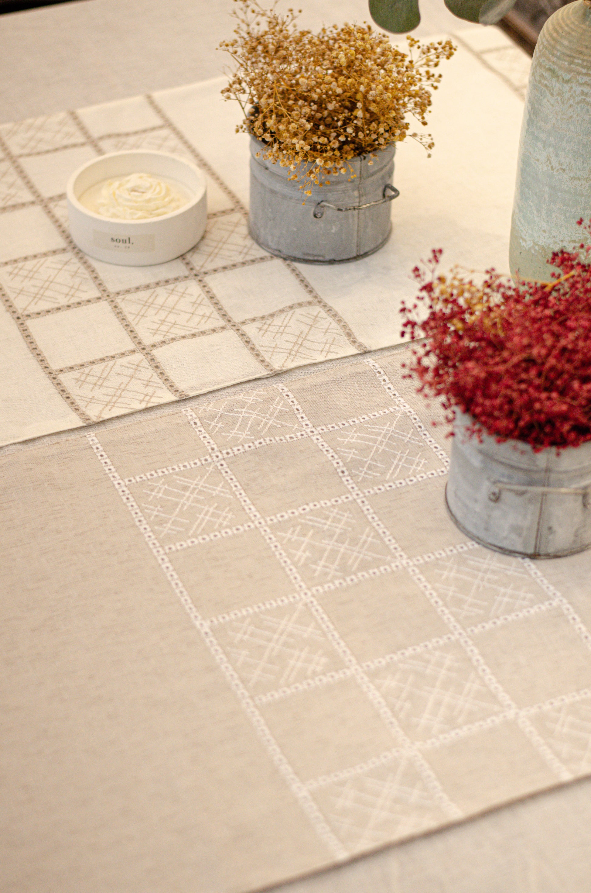 Turn your table into a statement of natural elegance with the Carré runner. Crafted from premium linen, this runner features embroidered squares that create a sophisticated, textured pattern. The clean lines and geometric design give it a modern flair, making it perfect for both modern and vintage settings.