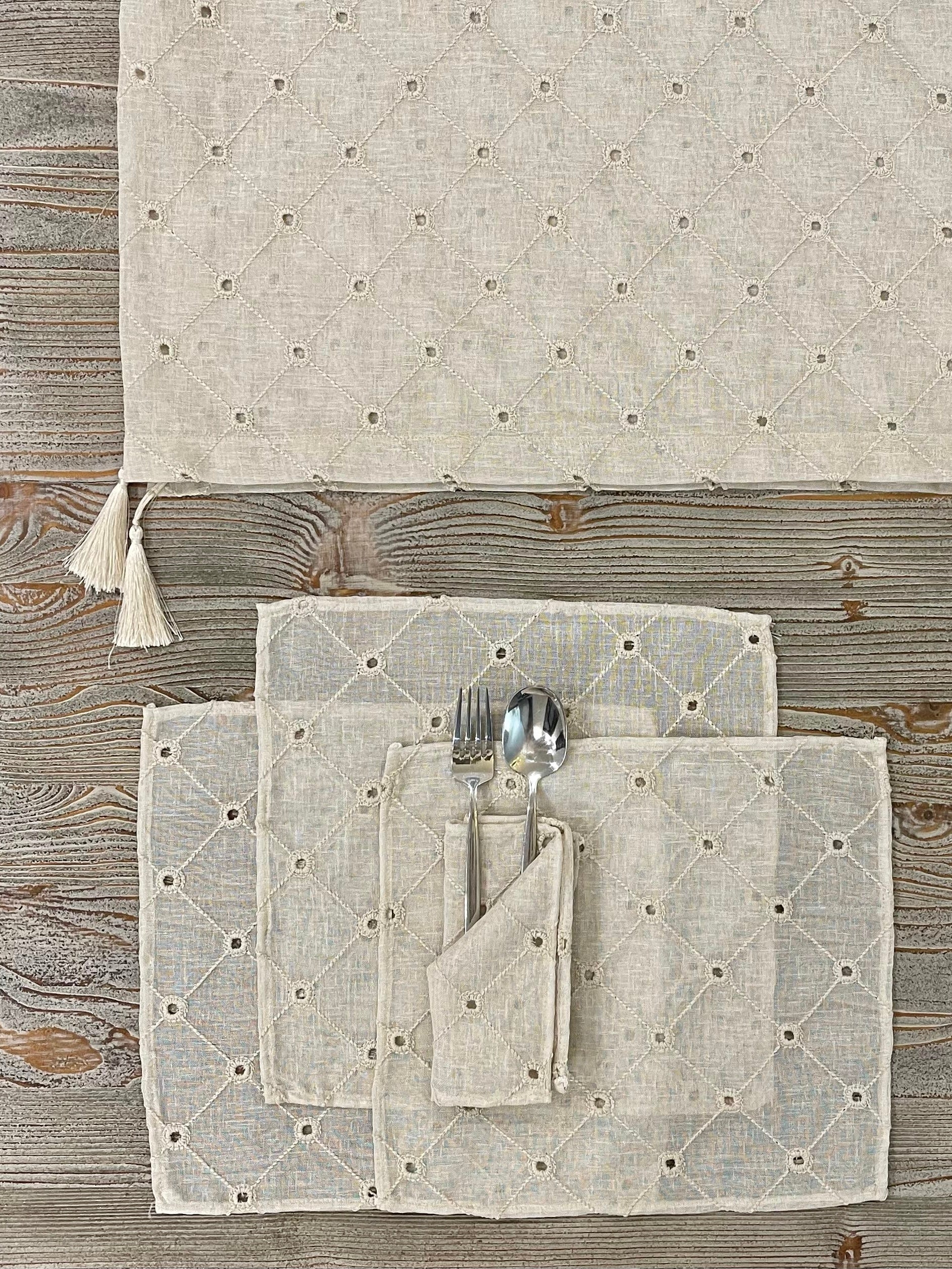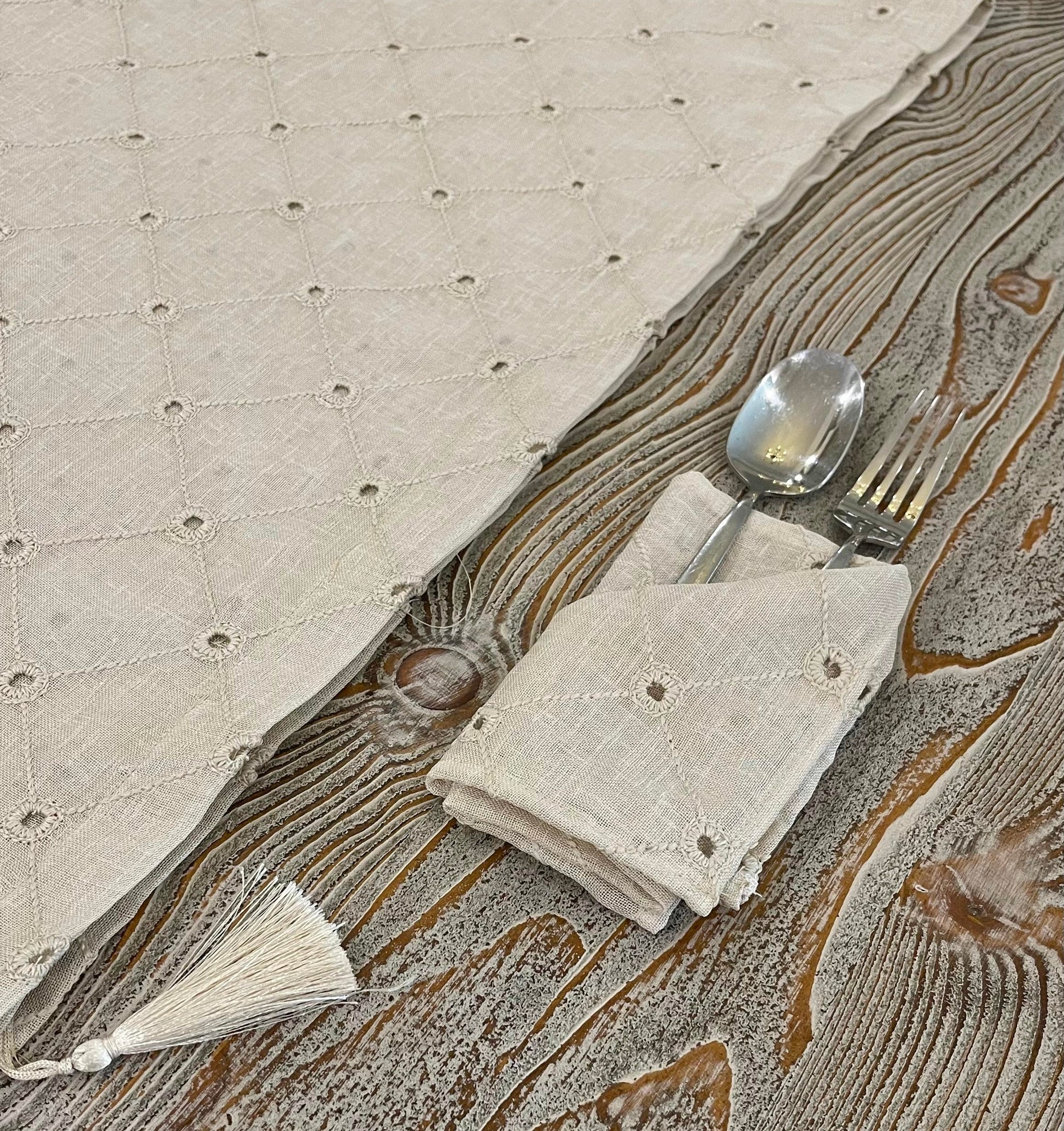 Complete your table setting with the Sahara napkin, crafted from the same luxurious linen fabric as the Sahara tablecloth. Featuring a subtle embroidered diamond pattern and delicate embroidered details, this napkin brings a touch of sophistication and natural elegance to your dining experience. Perfect for both everyday use and special occasions, the Sahara napkin pairs beautifully with its matching tablecloth, adding a cohesive and refined warmth to your table decor.