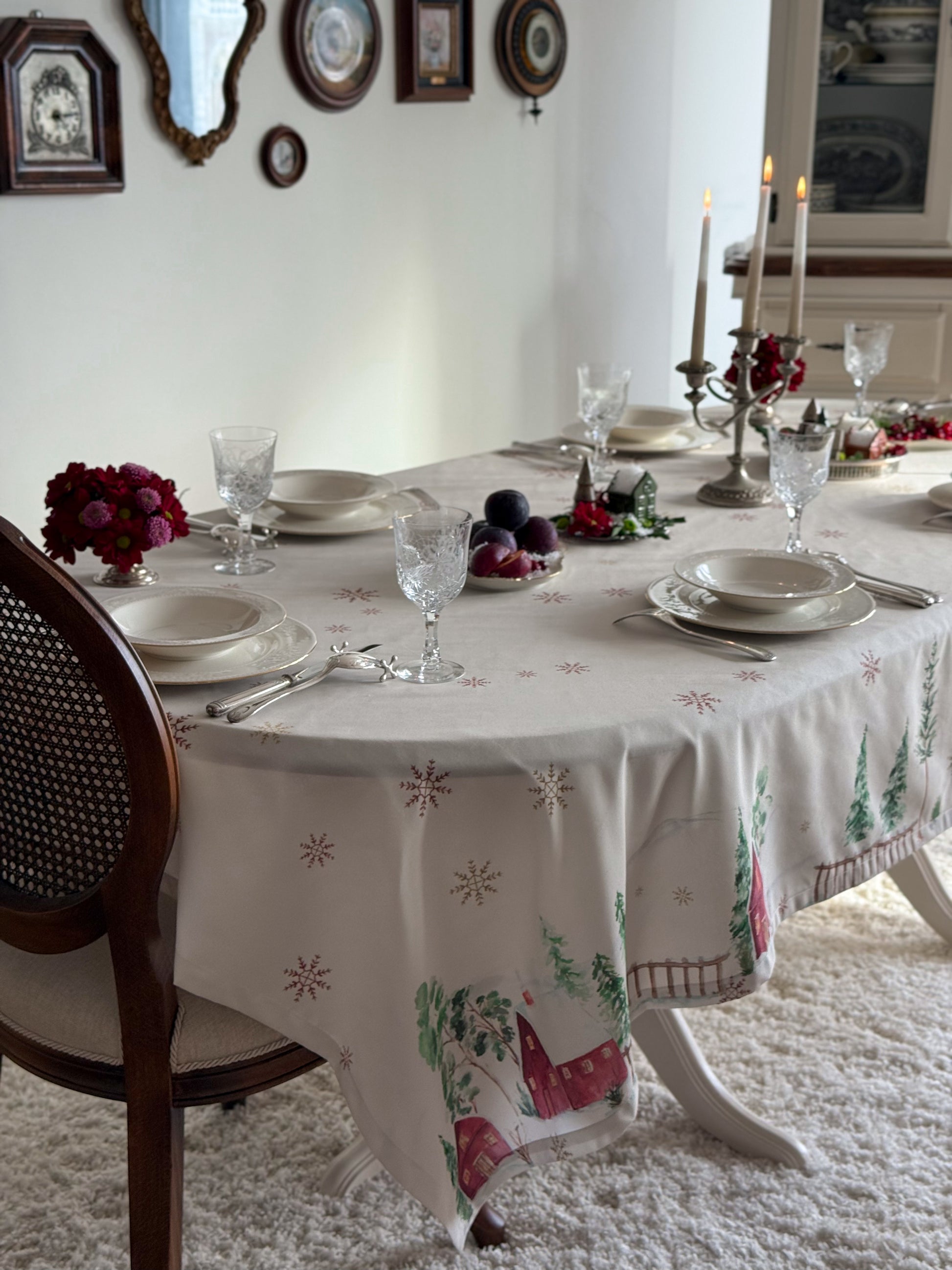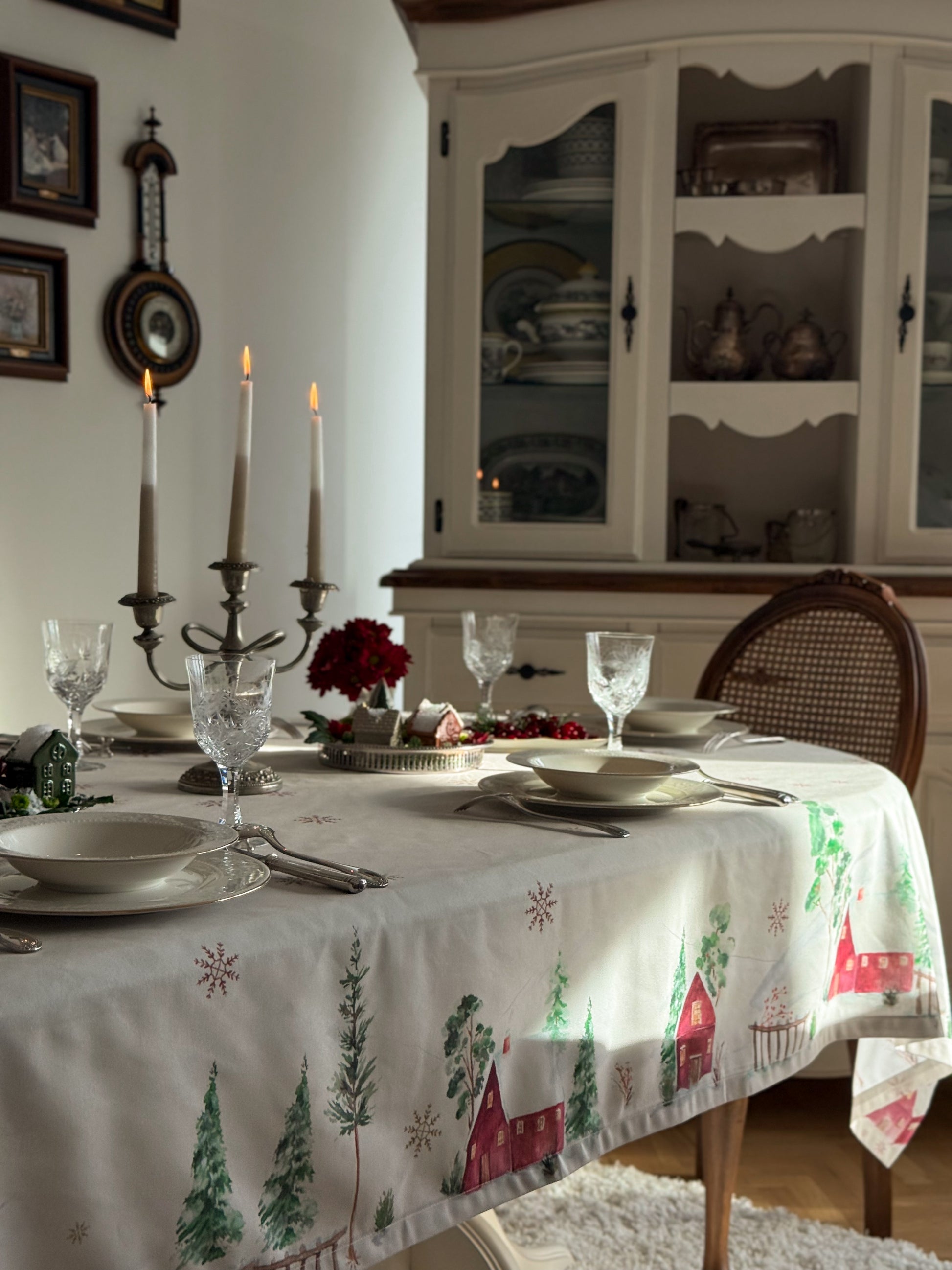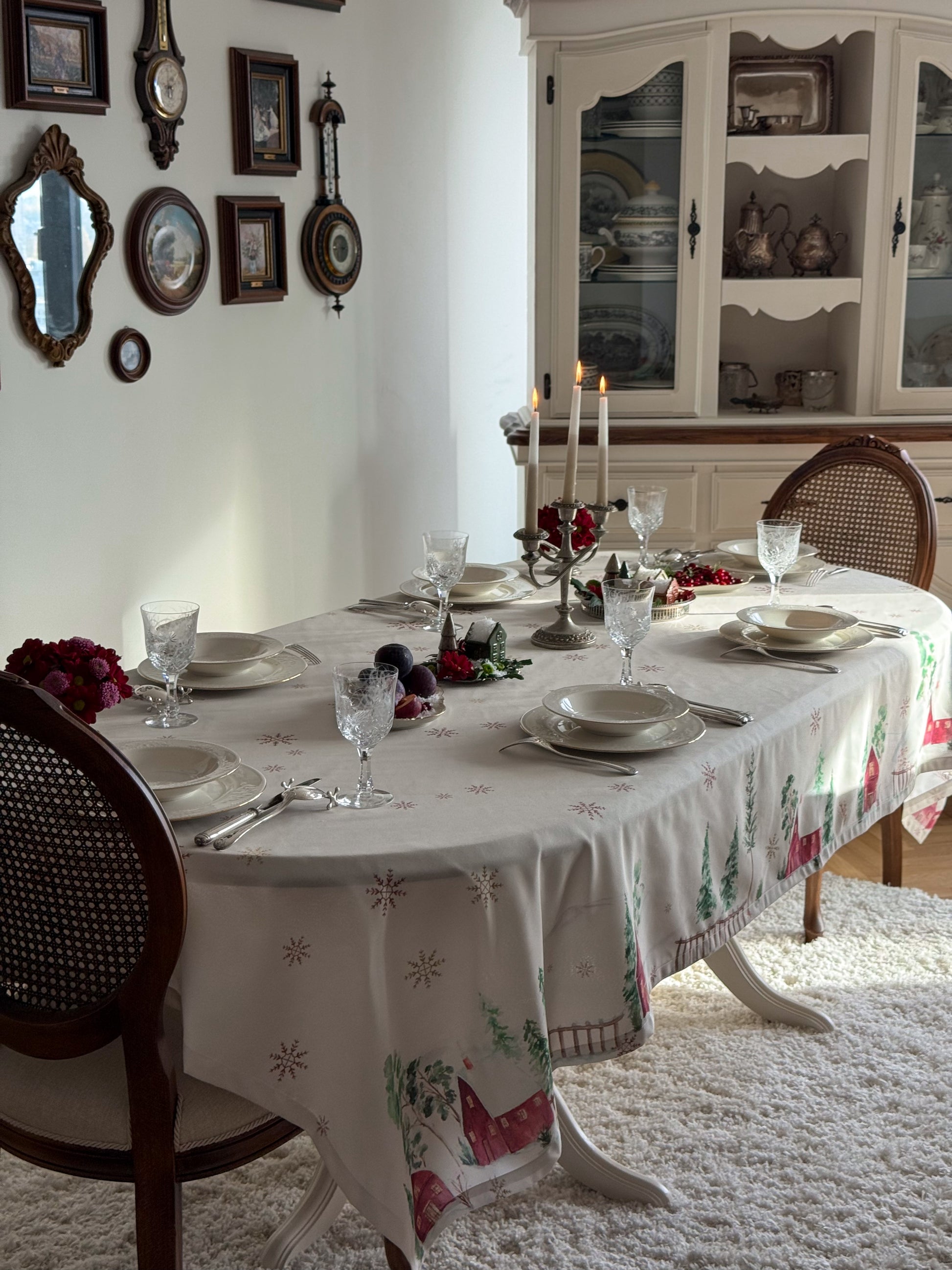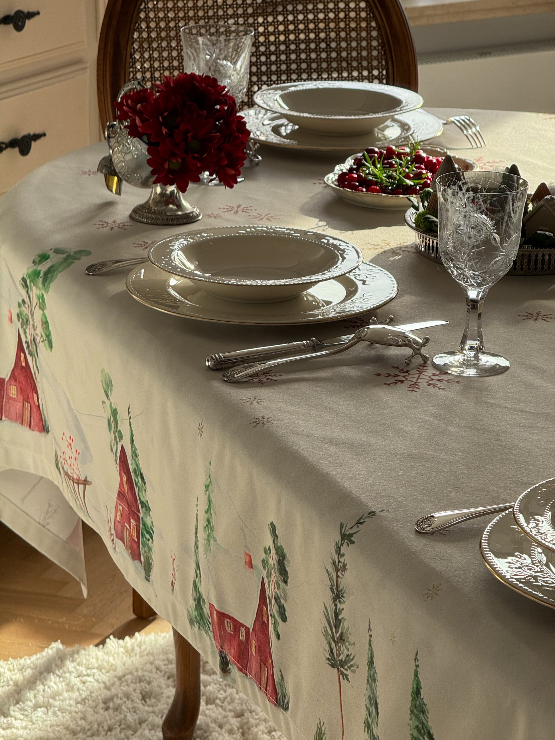 Bring winter magic to your table with Snow Reverie, a hand-painted watercolor tablecloth created by artist Emy’s Aquarelle. Inspired by a dreamy village tucked beneath snow-covered mountains, its delicate cabins, evergreens, and drifting snowflakes bring a soft, magical glow to your table. Thoughtfully designed to warm winter gatherings and New Year festivities, Snow Reverie transforms every meal into a cozy seasonal moment filled with artistry and wonder.